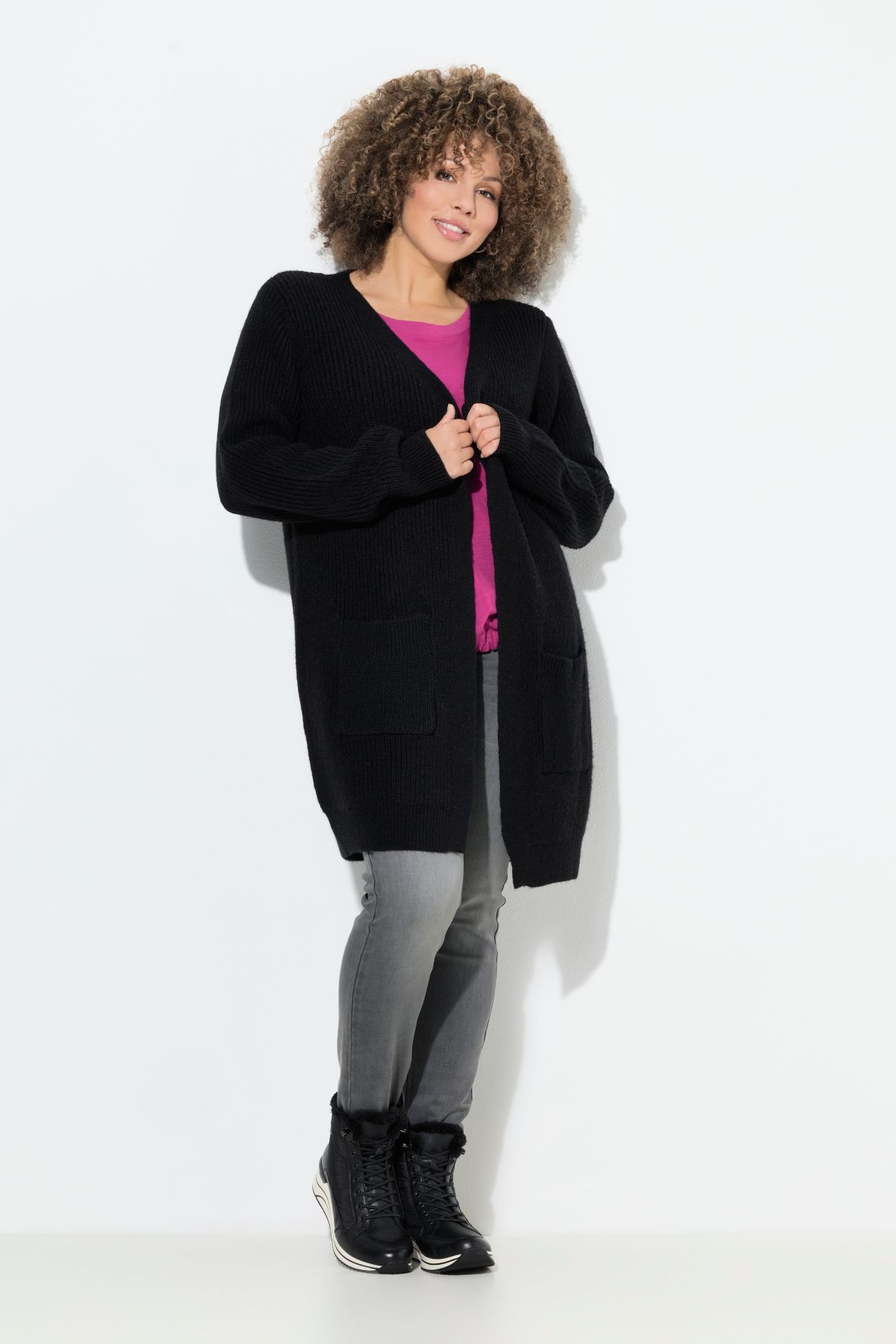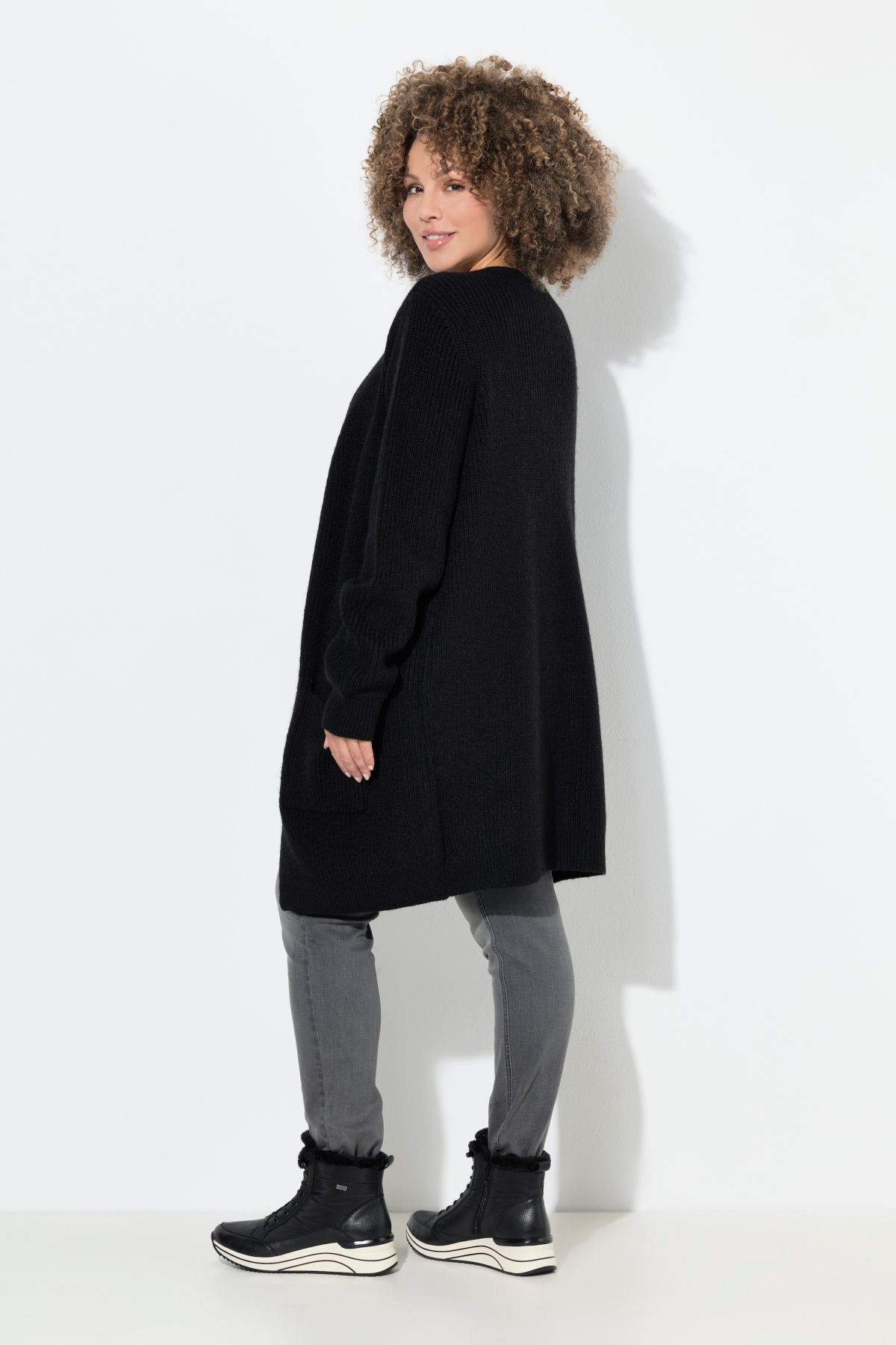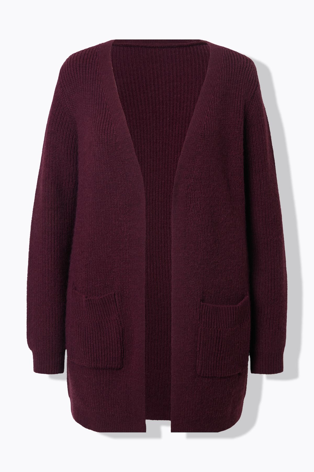 Нашивки с джобове, V-образно деколте, закопчаване с копчета, подгъв и дълги ръкави с оребрени маншети, мека фина плетка, дължина, регулирана по размер, приблизително 77-81 см.