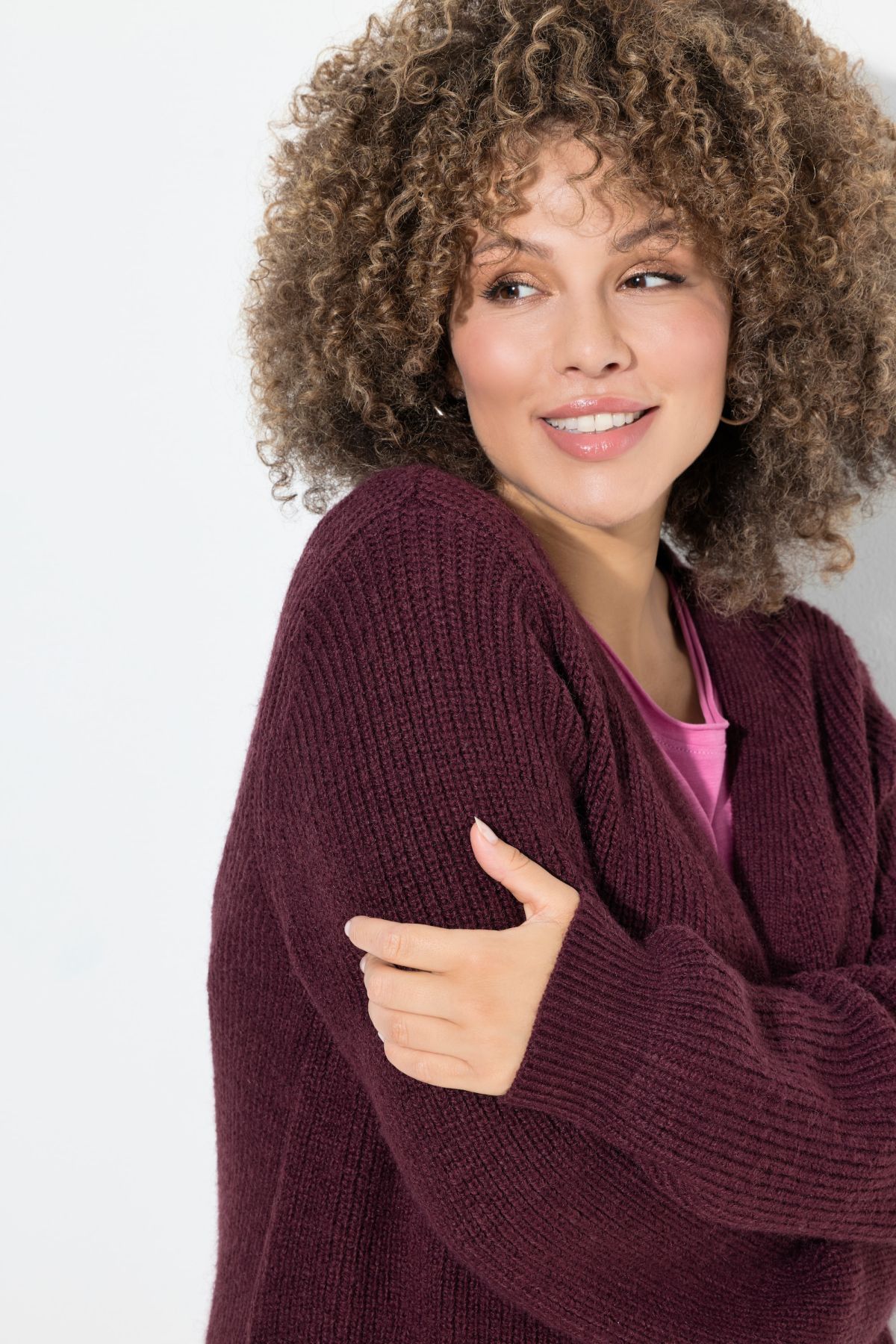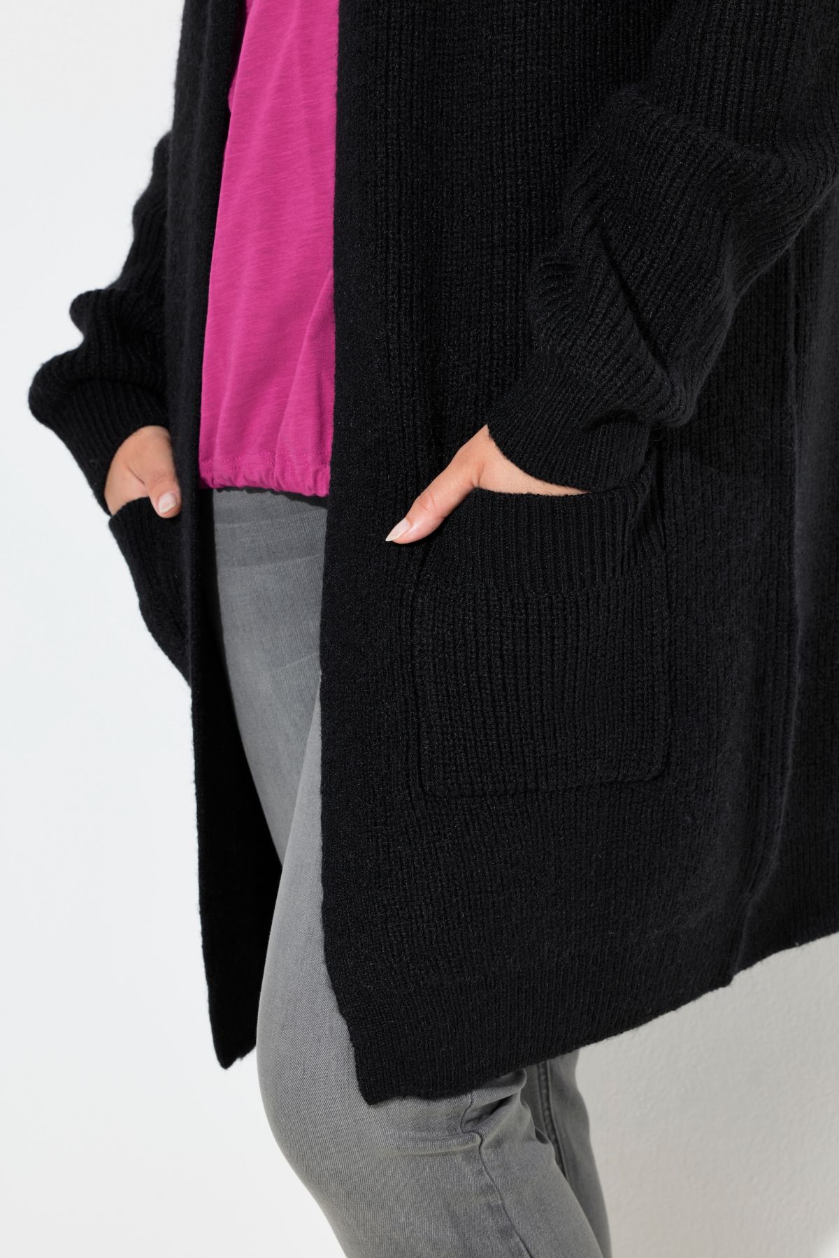 Плетена жилетка от мека, пухкава материя. С издължен силует, V - образно деколте и дълги ръкави. С джобове за допълнителен комфорт. Отворена отпред.