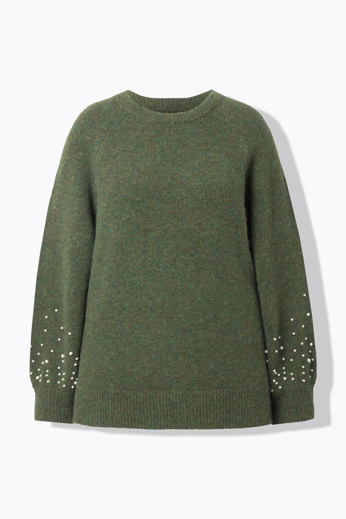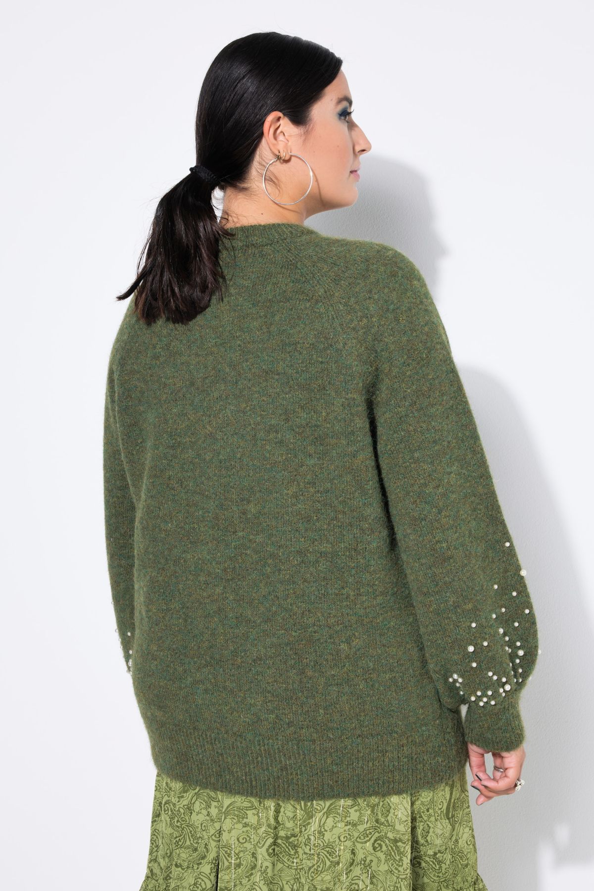 Пуловер с елегантен силует и широки балон ръкави с акцент от бляскави перли. Мек, пухкави и топъл за ежедневието. С кръгло деколте