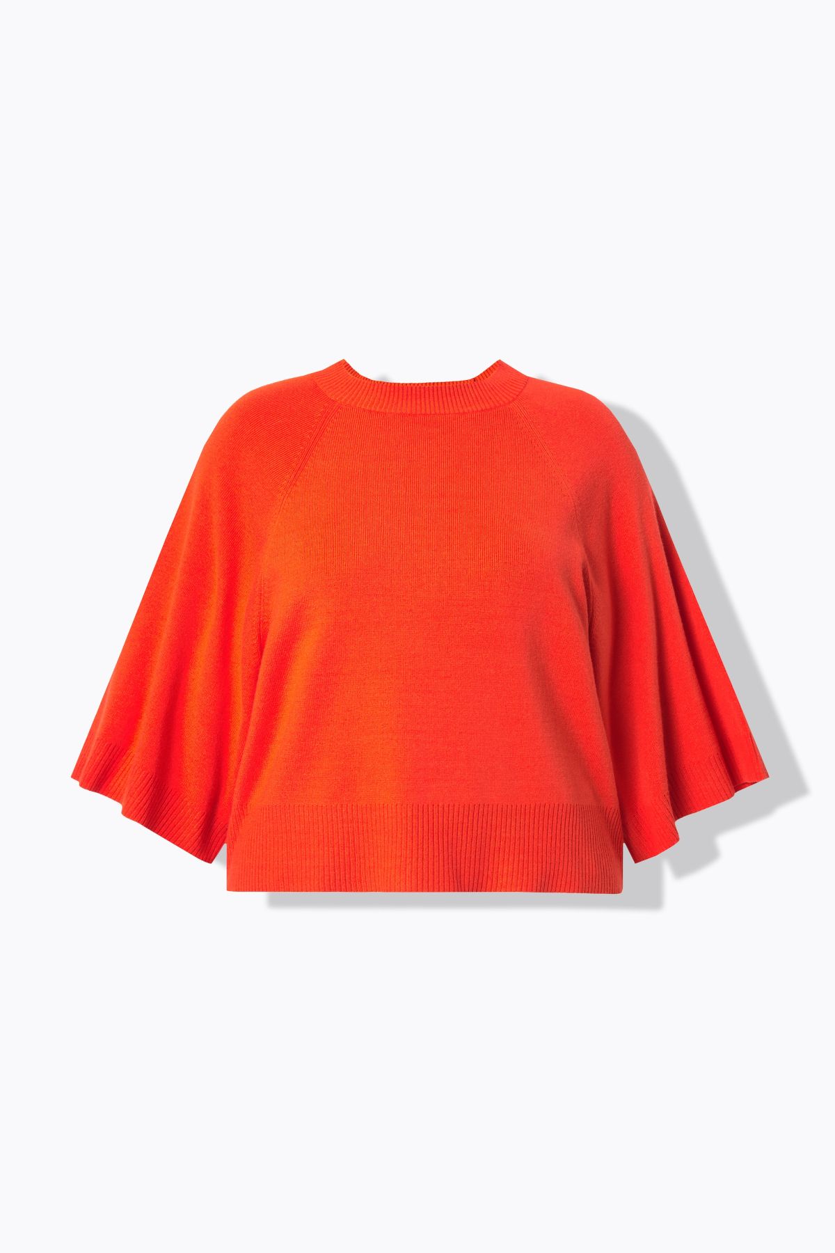 Малко по-къса кройка, кръгло деколте, удобна кройка, широки 3/4 реглан ръкави с оребрени маншети, мека фина плетка от вискозна смес, дължина, регулирана по размер, приблизително 58-68 см.
