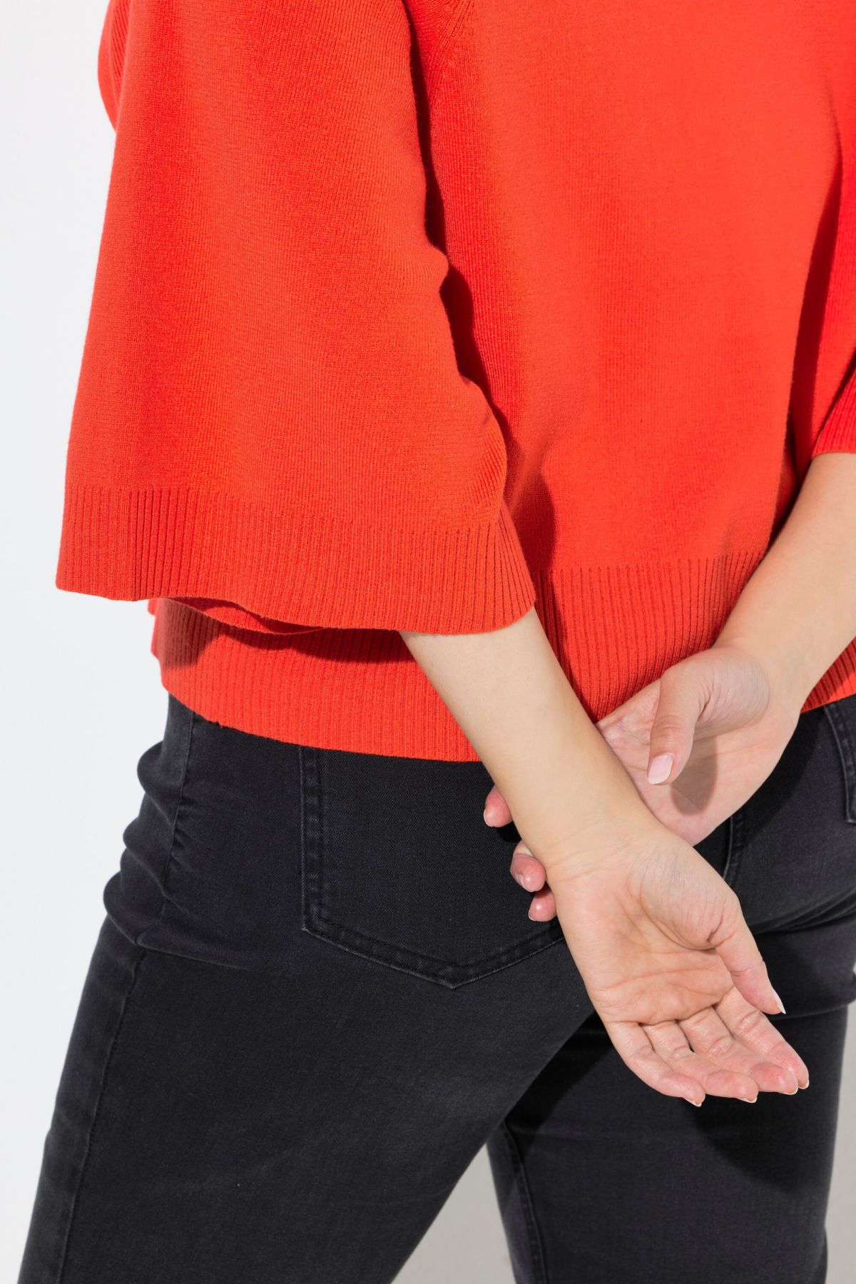 Пуловер от супер фина, мека плетка. С широки 3/4 ръкави тип прилеп. С кръгло деколте и по - къса кройка