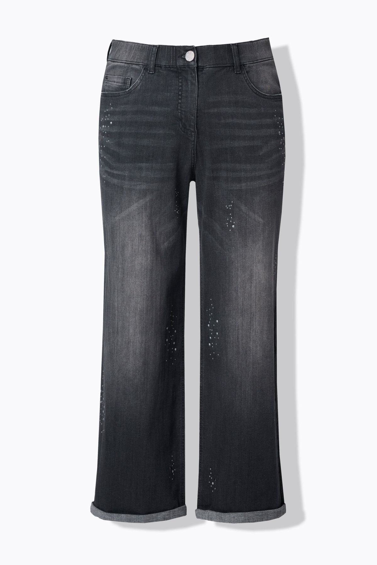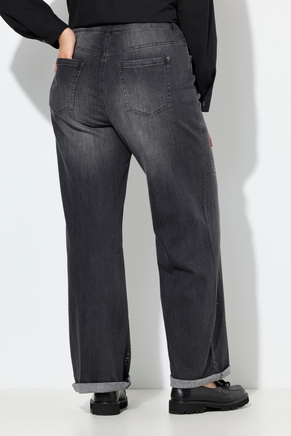 Дънки с ресни на подгъва и прав силует. С големи външни джобове и акценти от метални капси. Дизайн с фиксирана талия с гайки за колан, копче и цип отпред и 5 джоба.