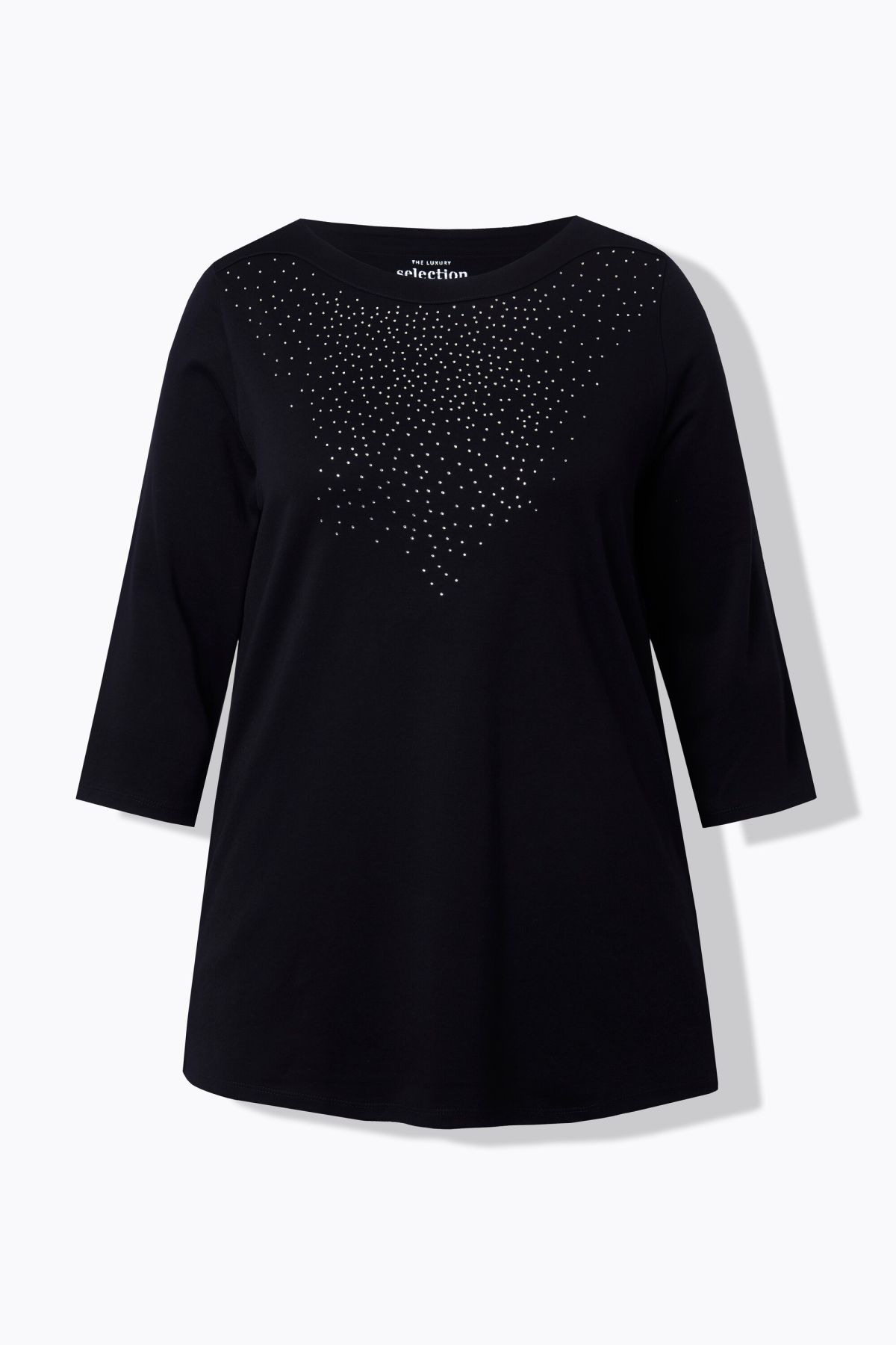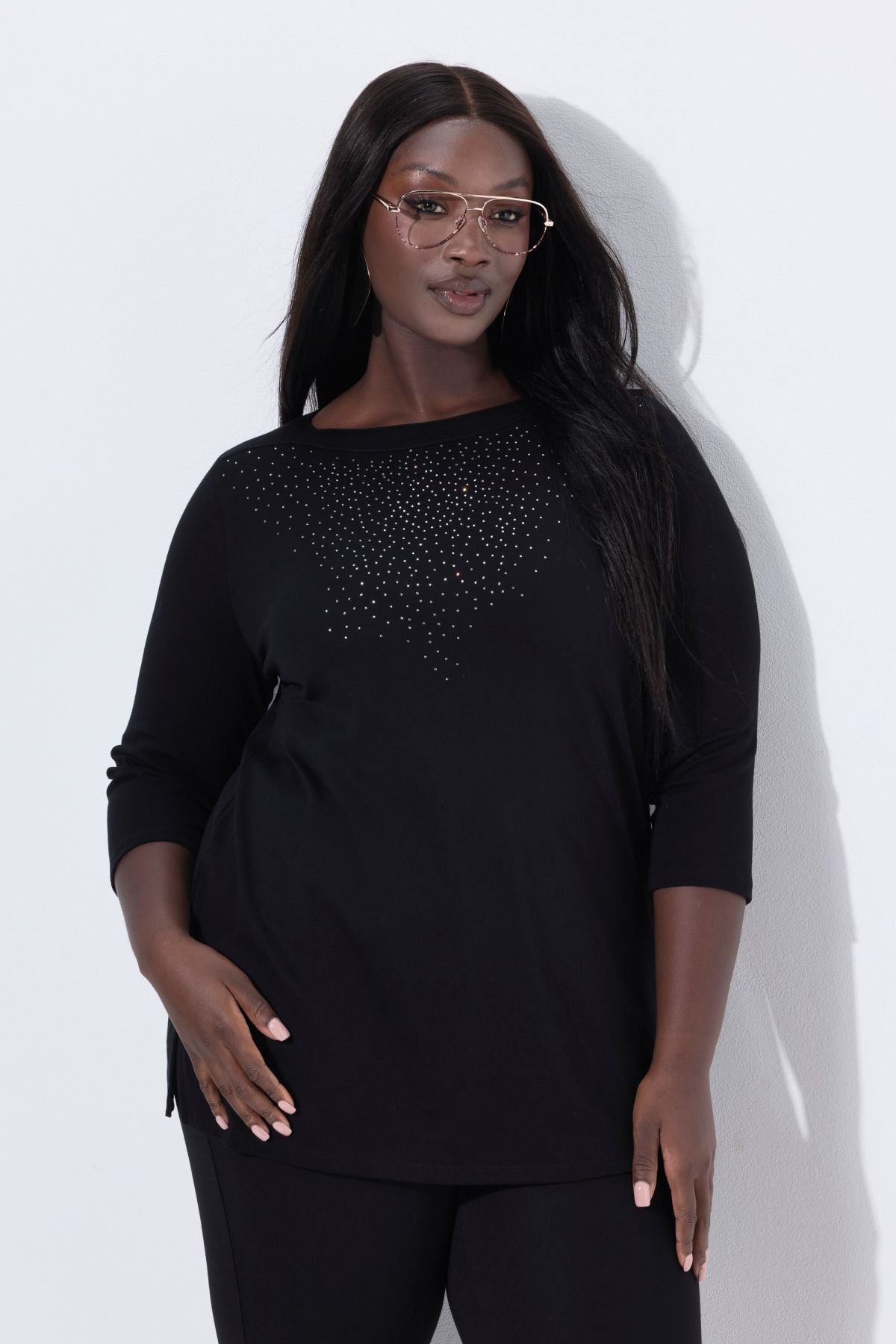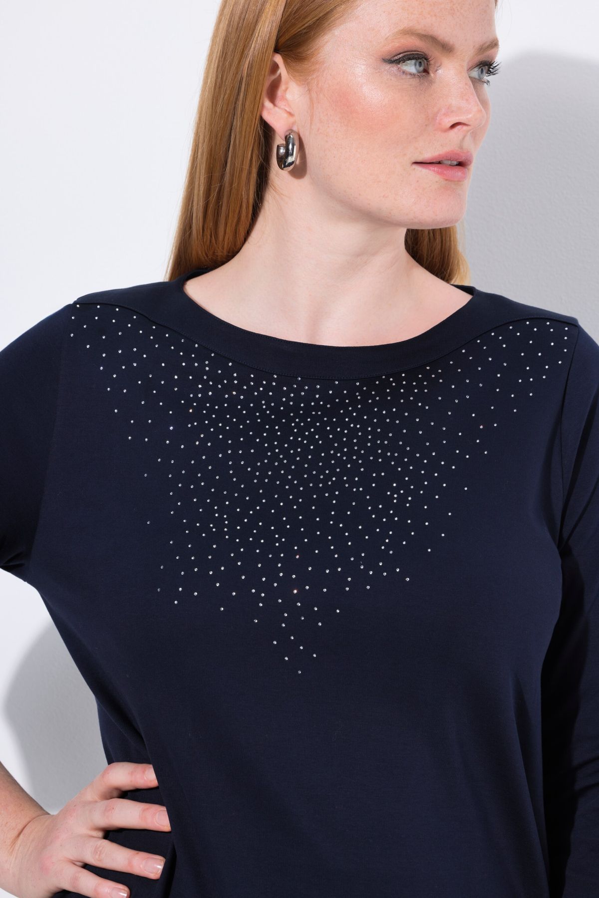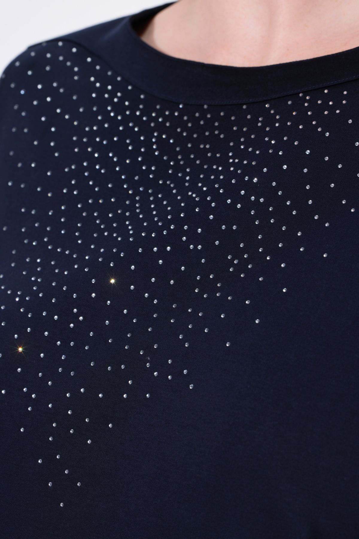 Тениска с декоративни бляскави камъчета от луксозна трикотажна материя. С кръгло деколте по врата и 3/4 ръкави.