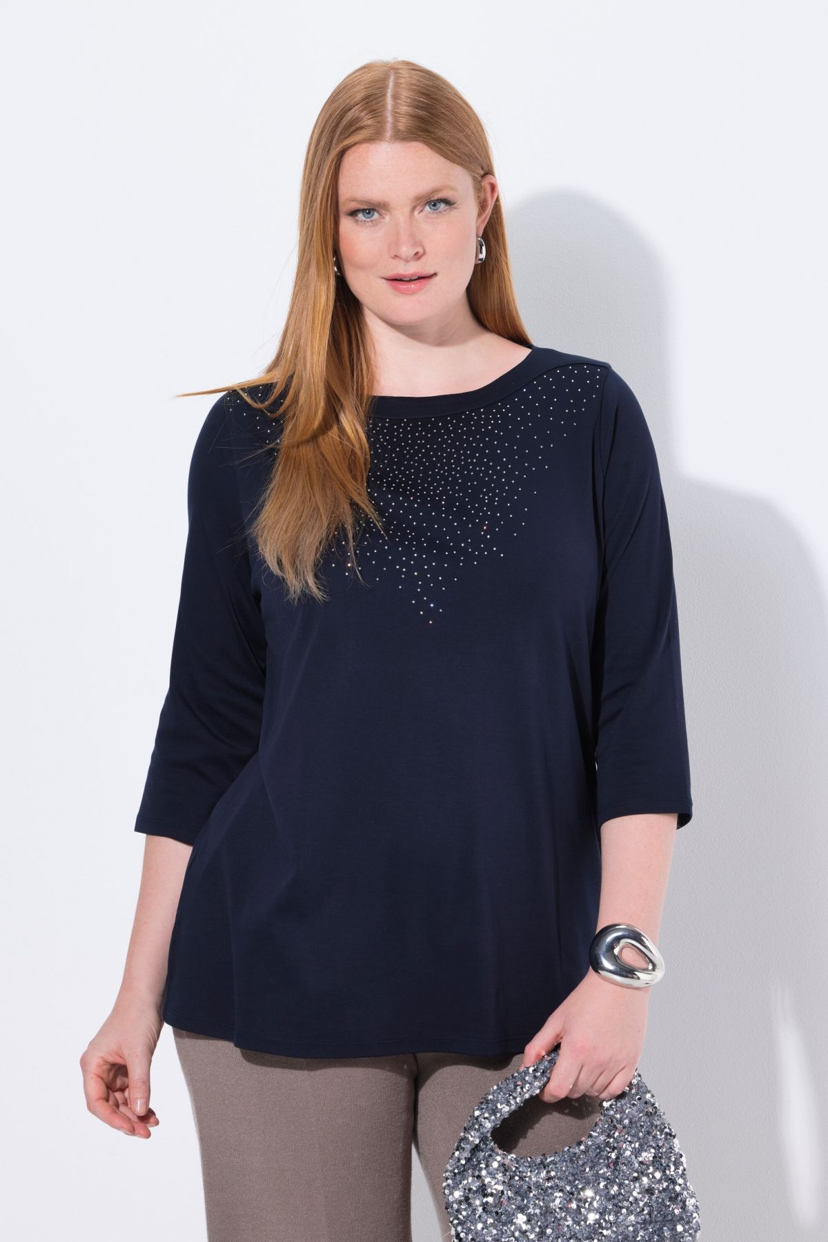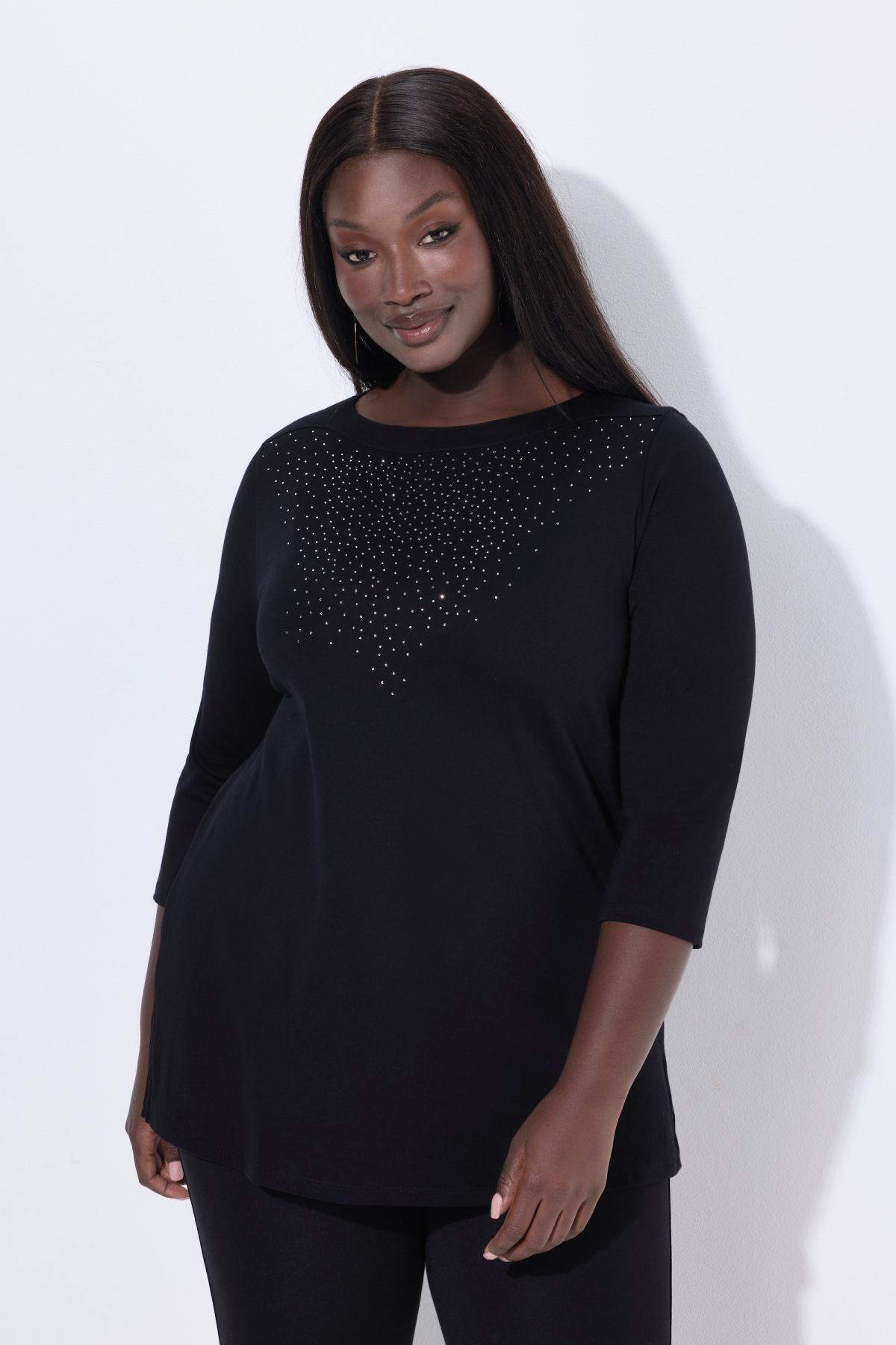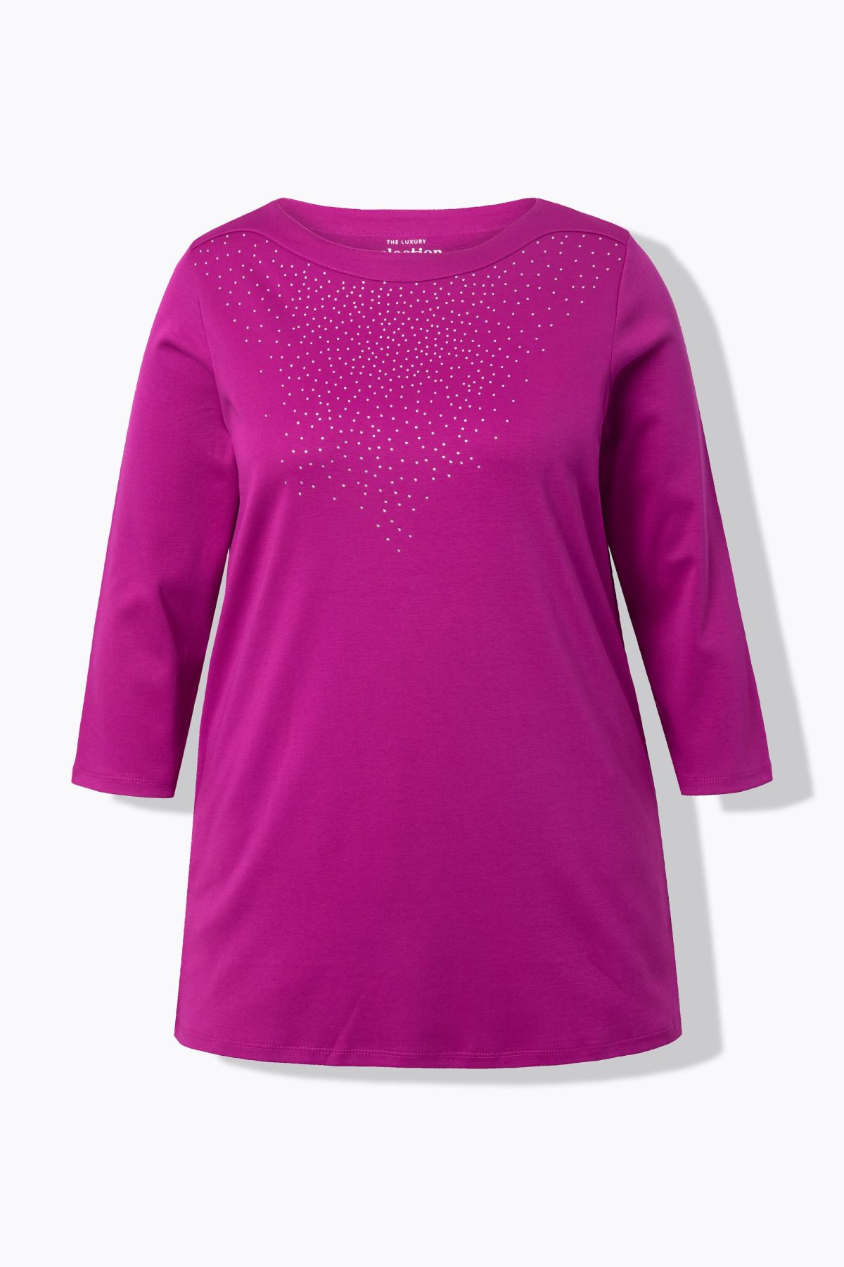 Тениска с декоративни бляскави камъчета от луксозна трикотажна материя. С кръгло деколте по врата и 3/4 ръкави.