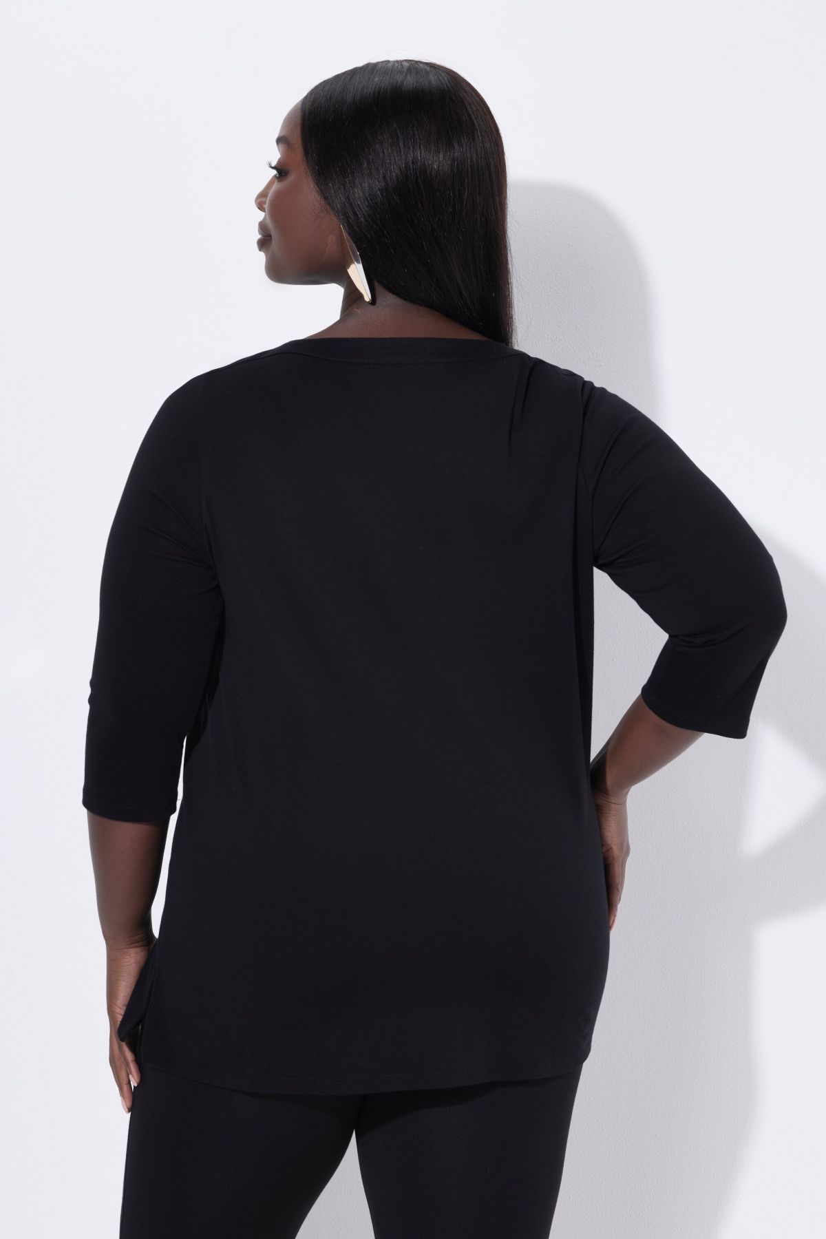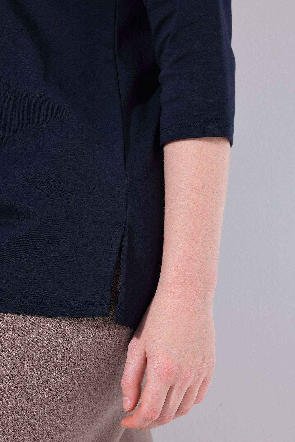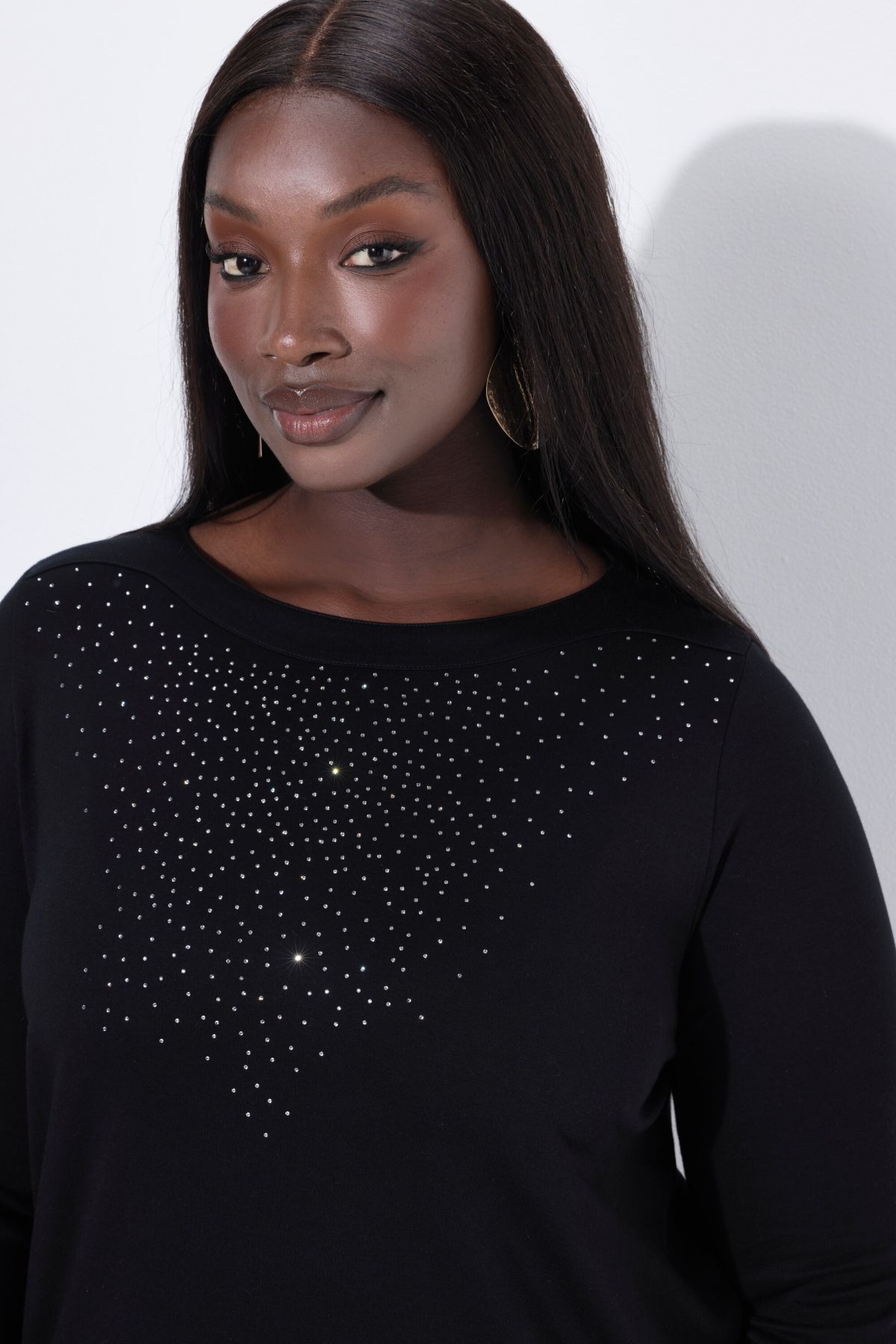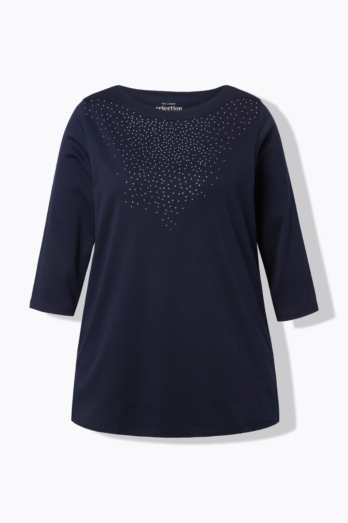 Тениска с декоративни бляскави камъчета от луксозна трикотажна материя. С кръгло деколте по врата и 3/4 ръкави.
