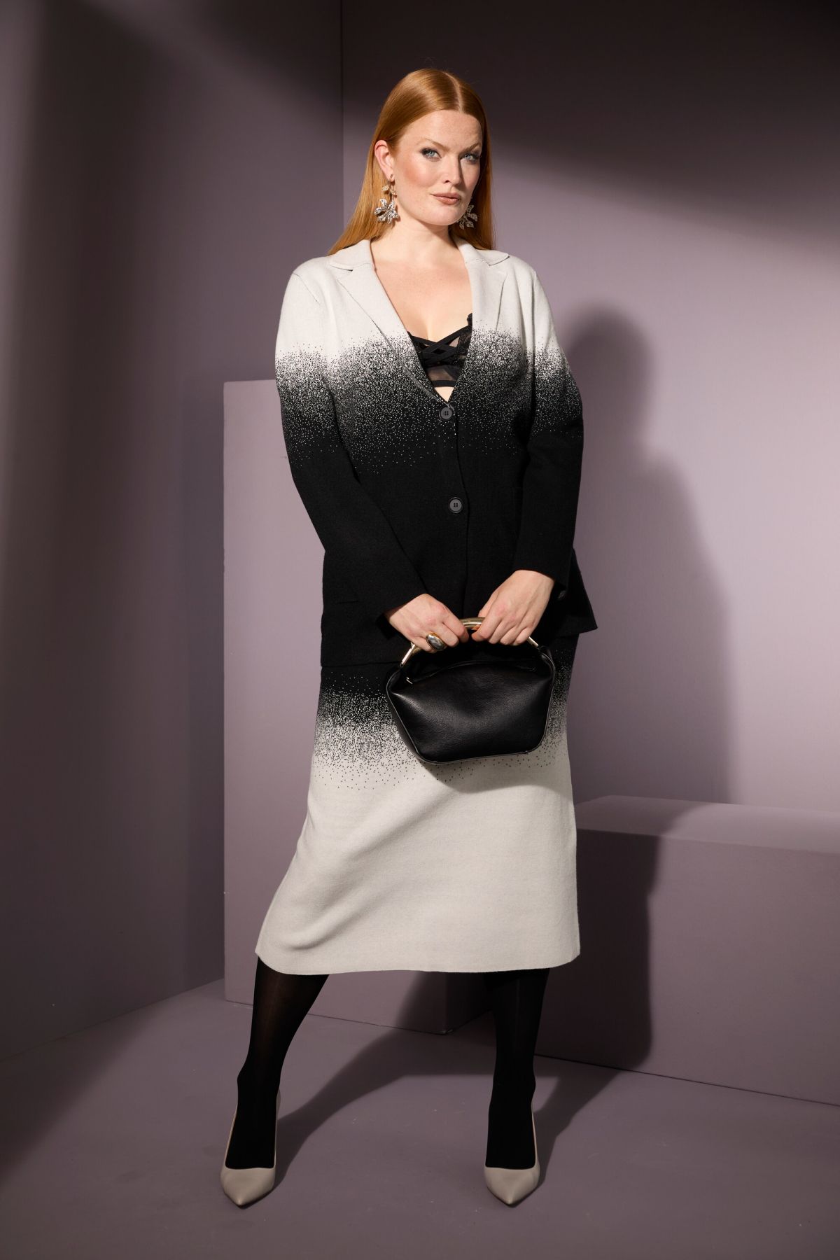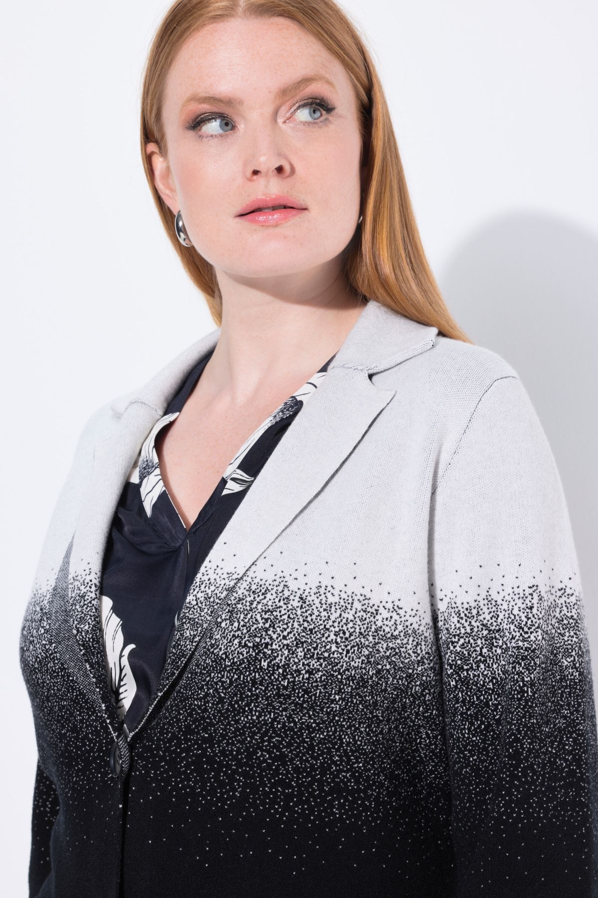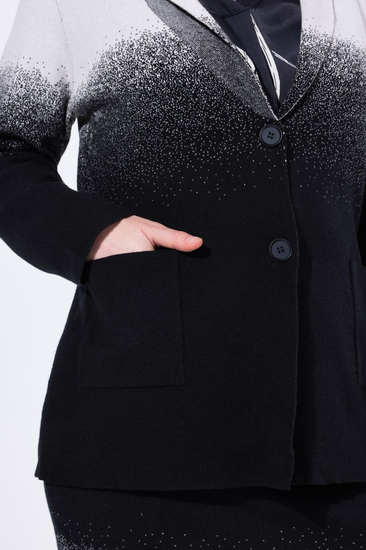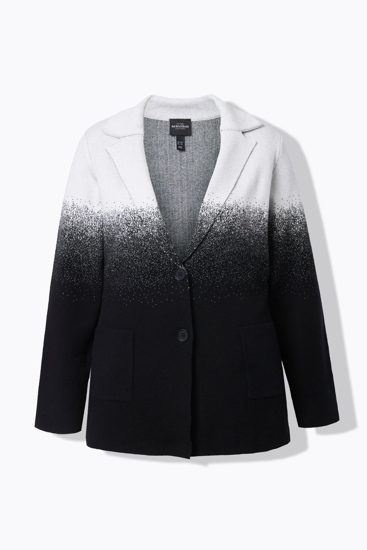 Плетен блейзър с цветен градиент. С дълбоко V - образно деколте с копче отпред, външни джобове и дълги ръкави. От пухкава плетка.