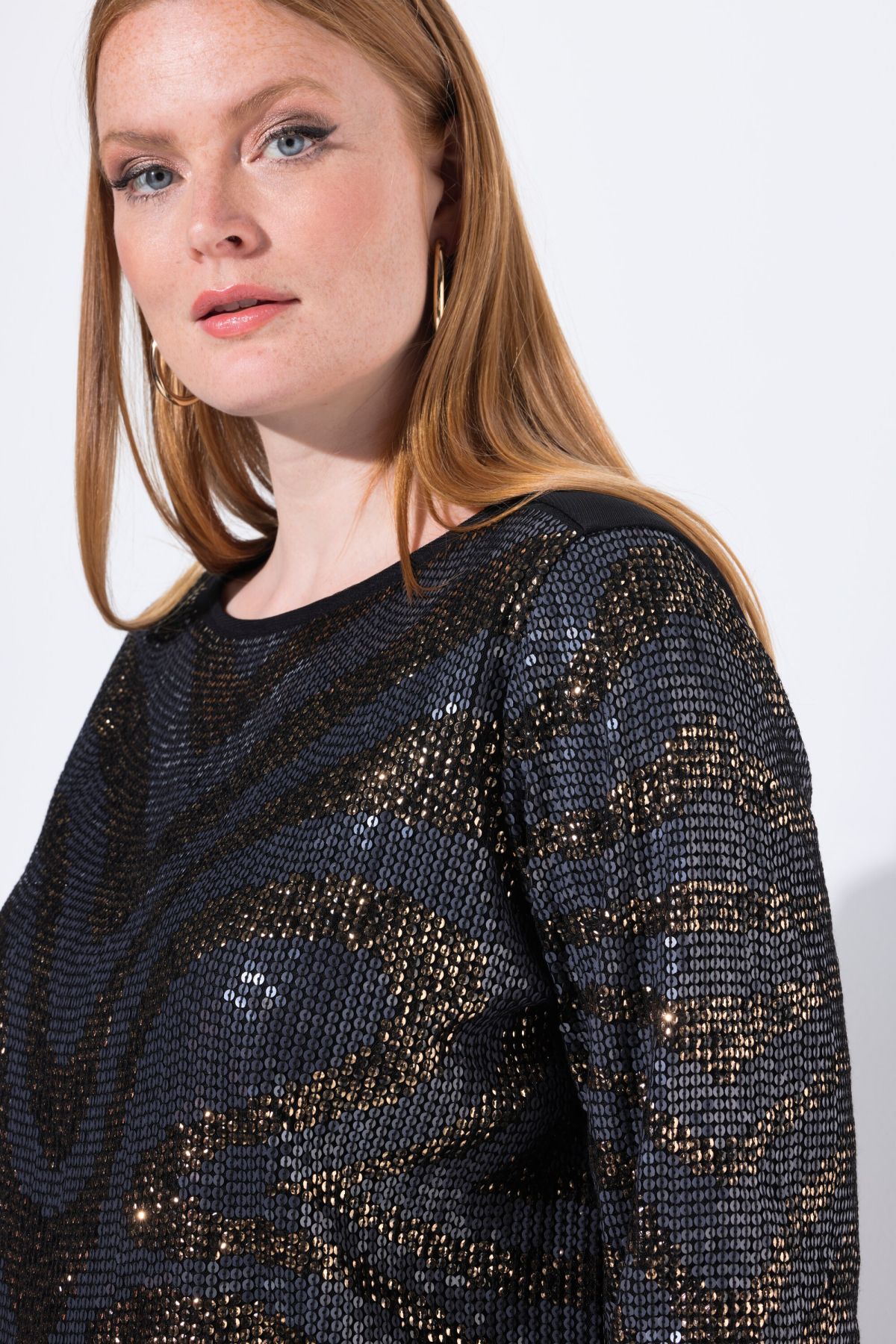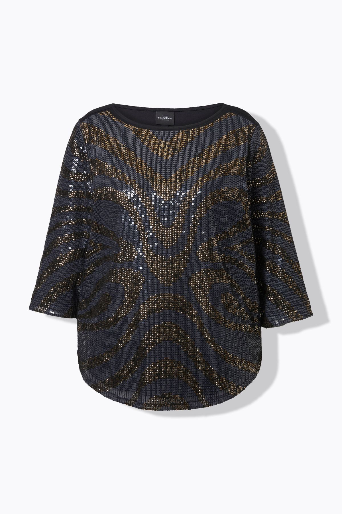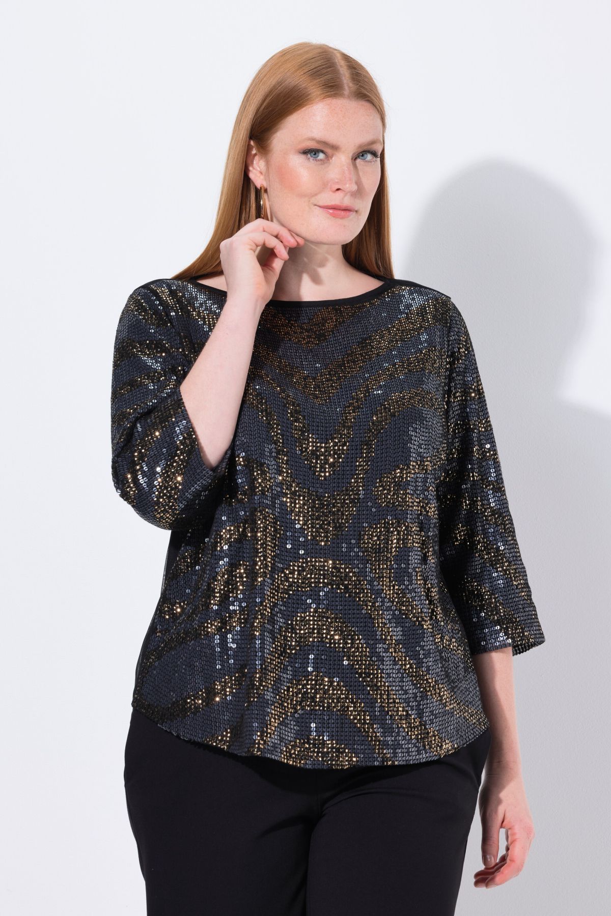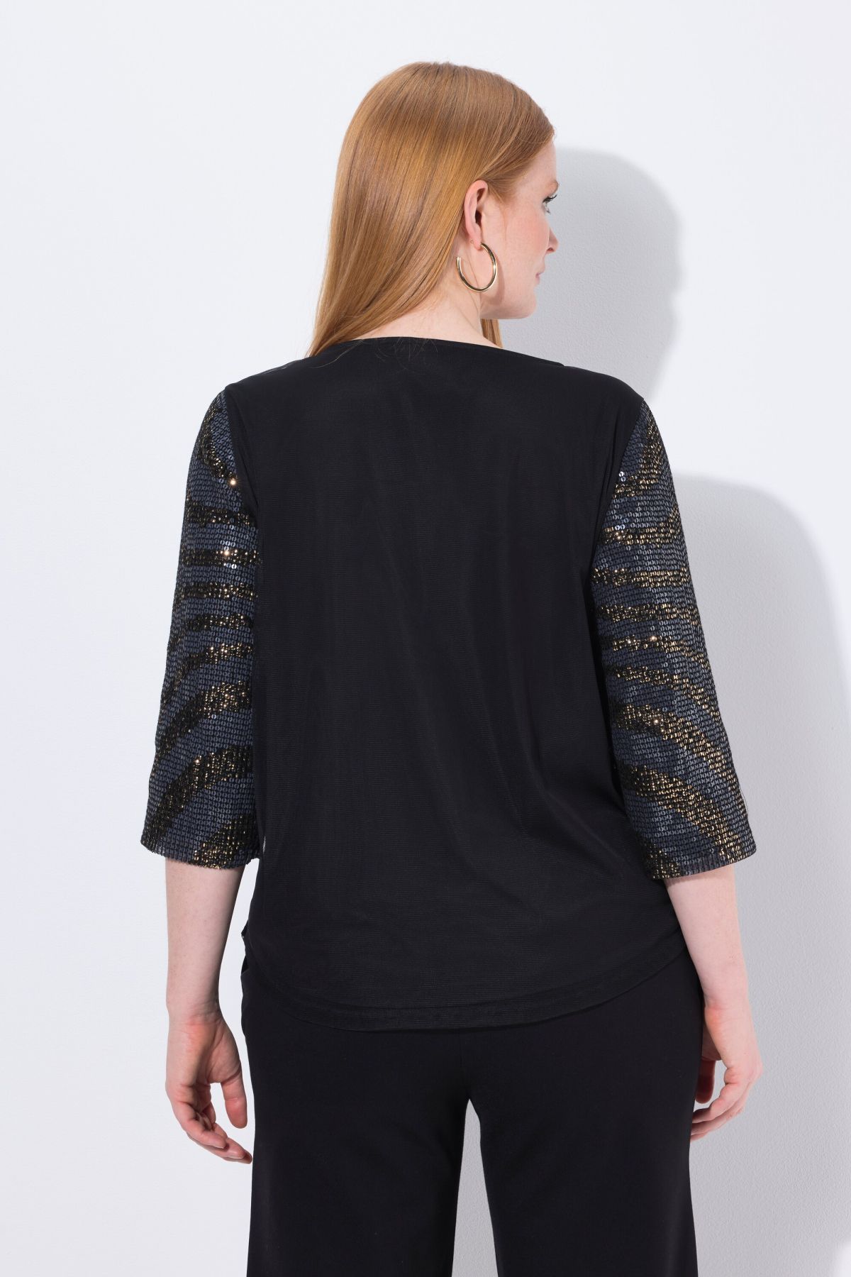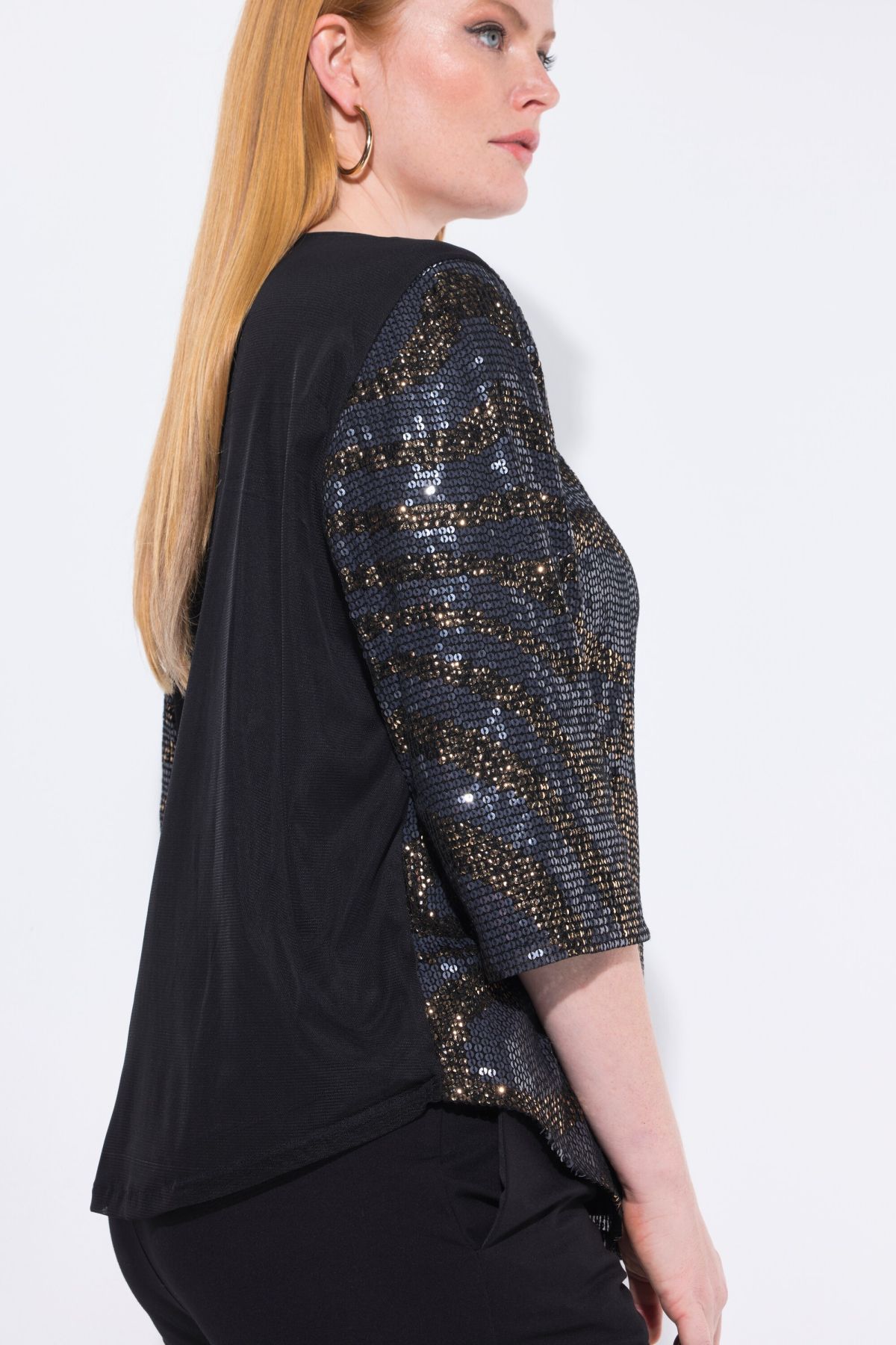 Блуза с мрежест акценти и пайетени детайли. С кръгло деколте и 3/4 ръкави. Стилна и комфортна за всяко събитие.