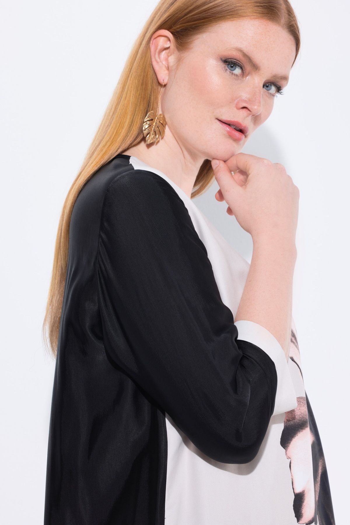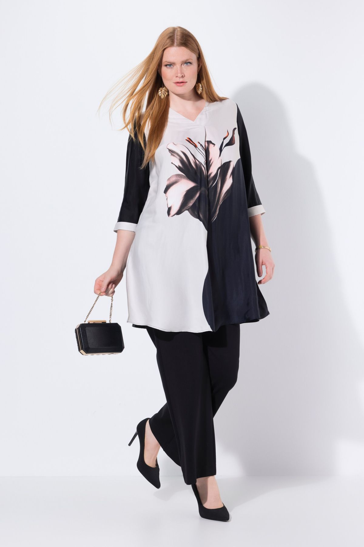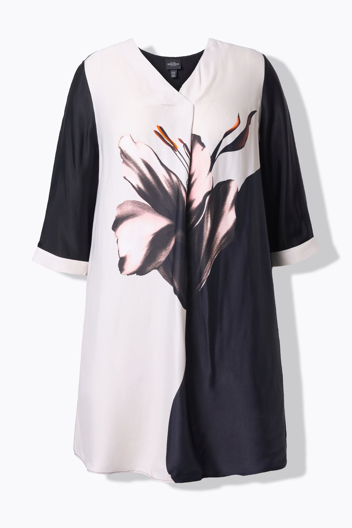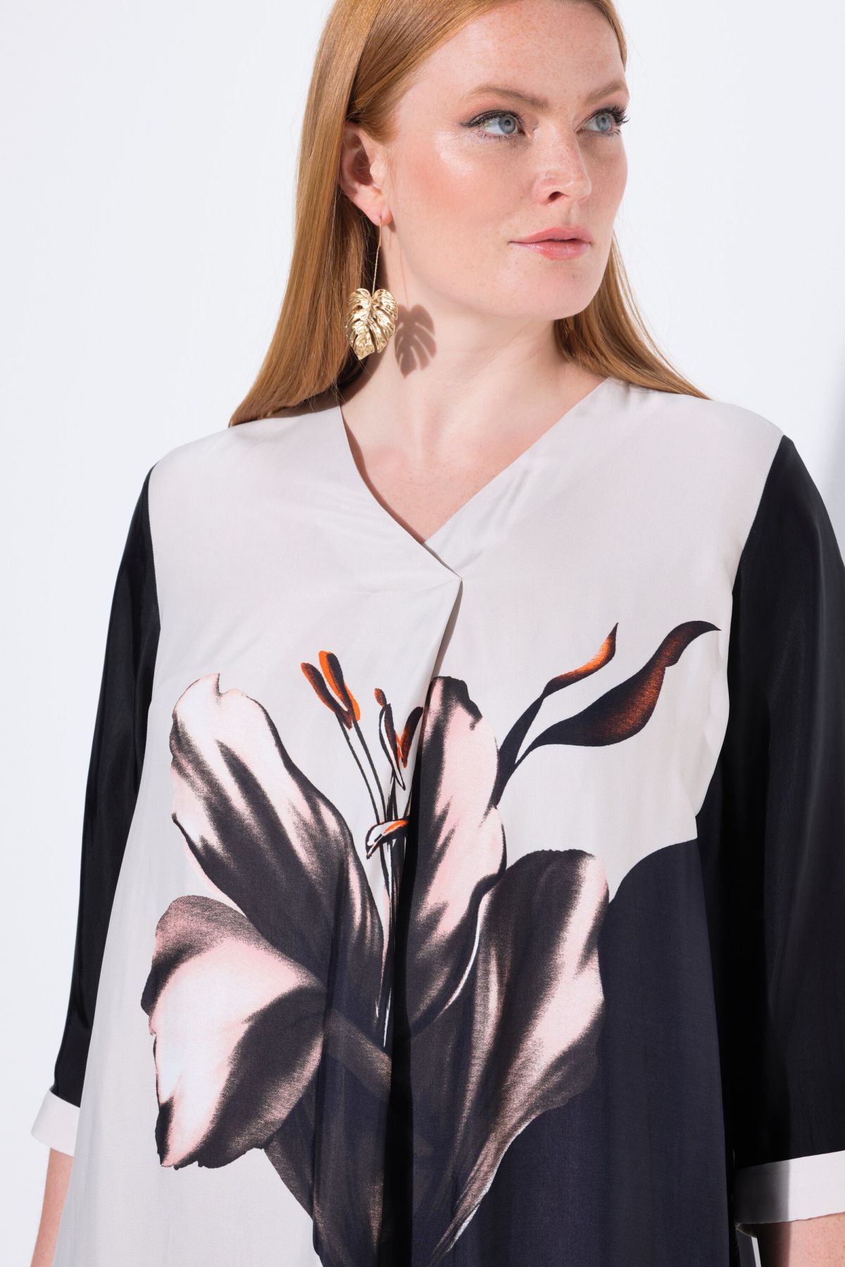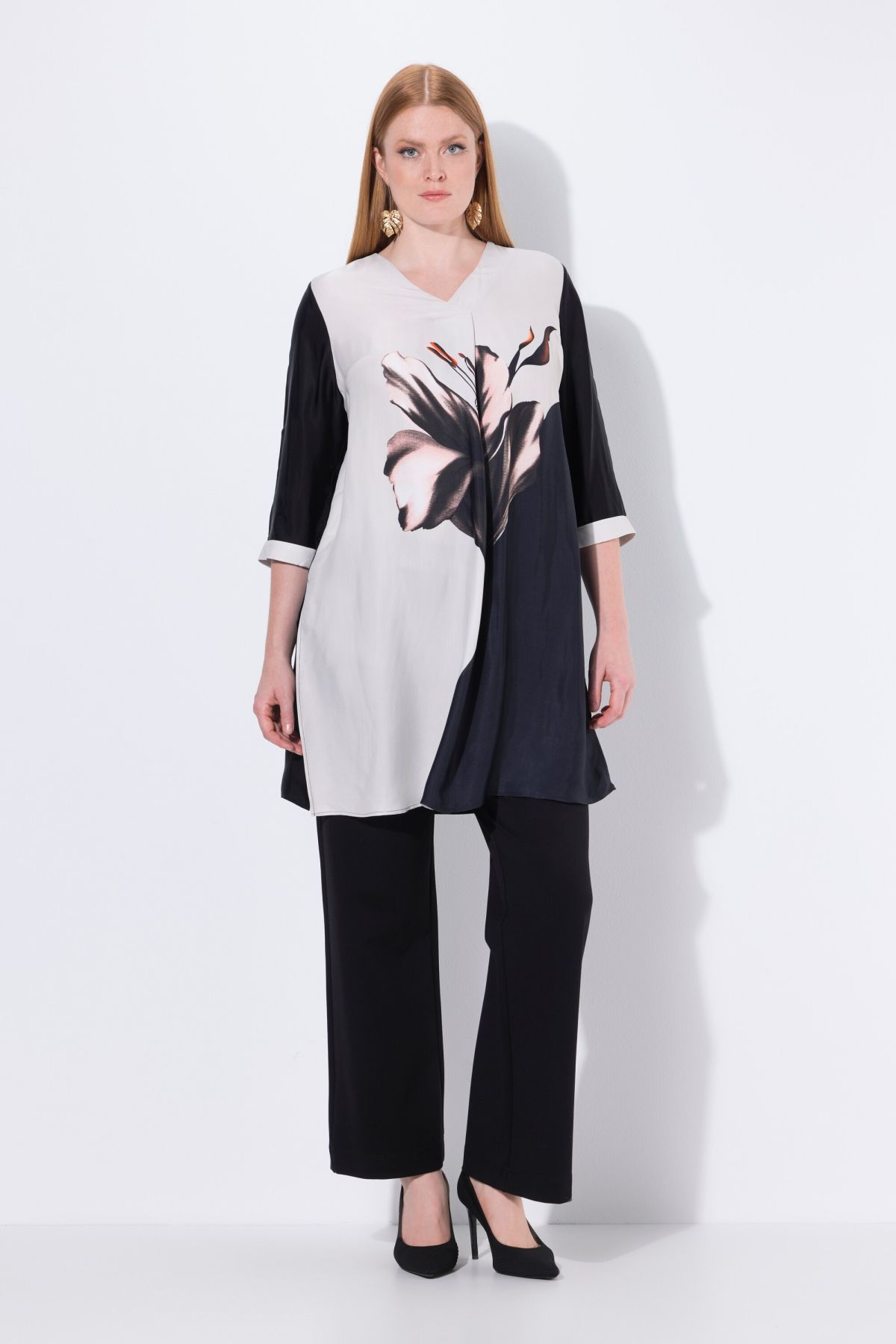 Туника с принт на лилии в два цвята. С графични акценти и женствен силует. С кръгло деколте и 3/4 ръкави. Перфектна за комбиниране с панталон или клин