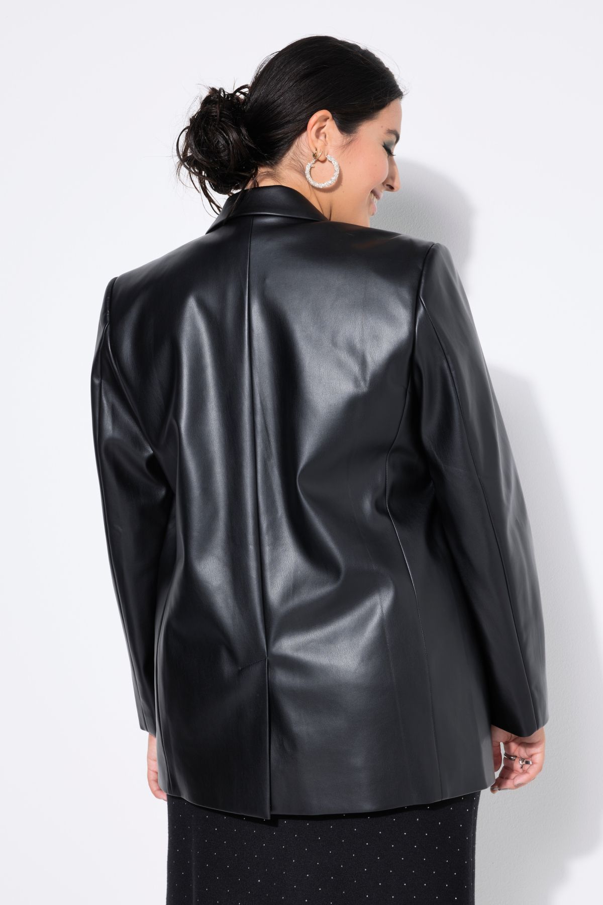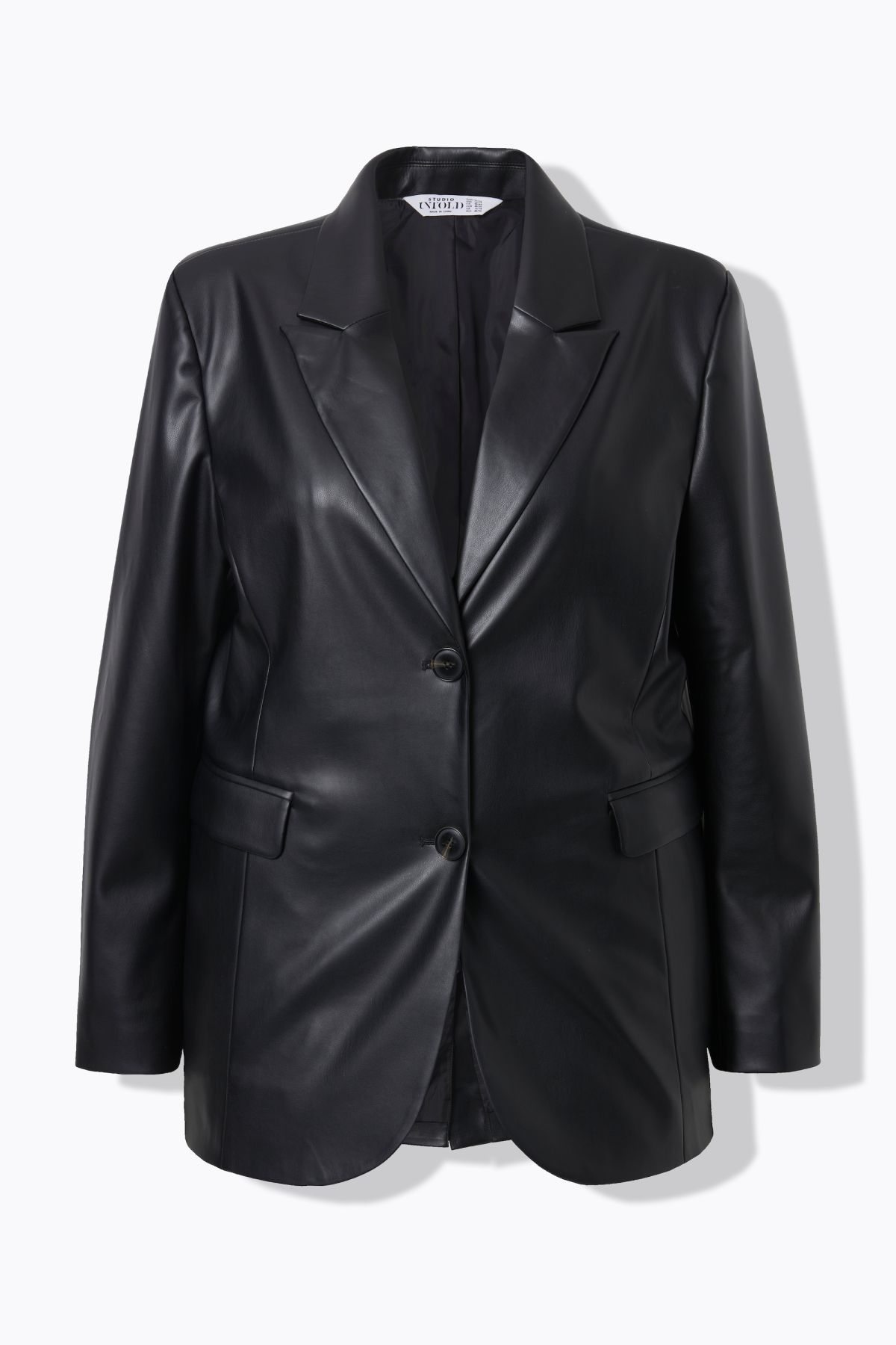 Блейзър с кожена визия с ревери на яката. С копчета отпред. С джобове с капаци, дълги ръкави и подплата отпред.