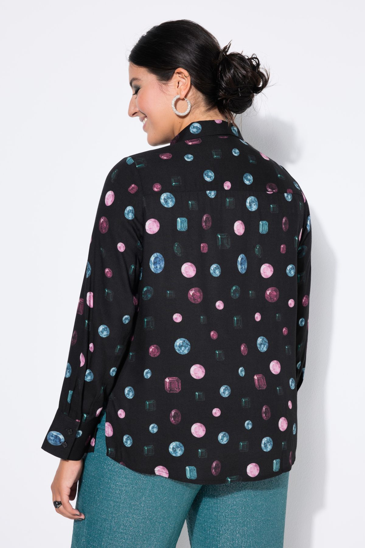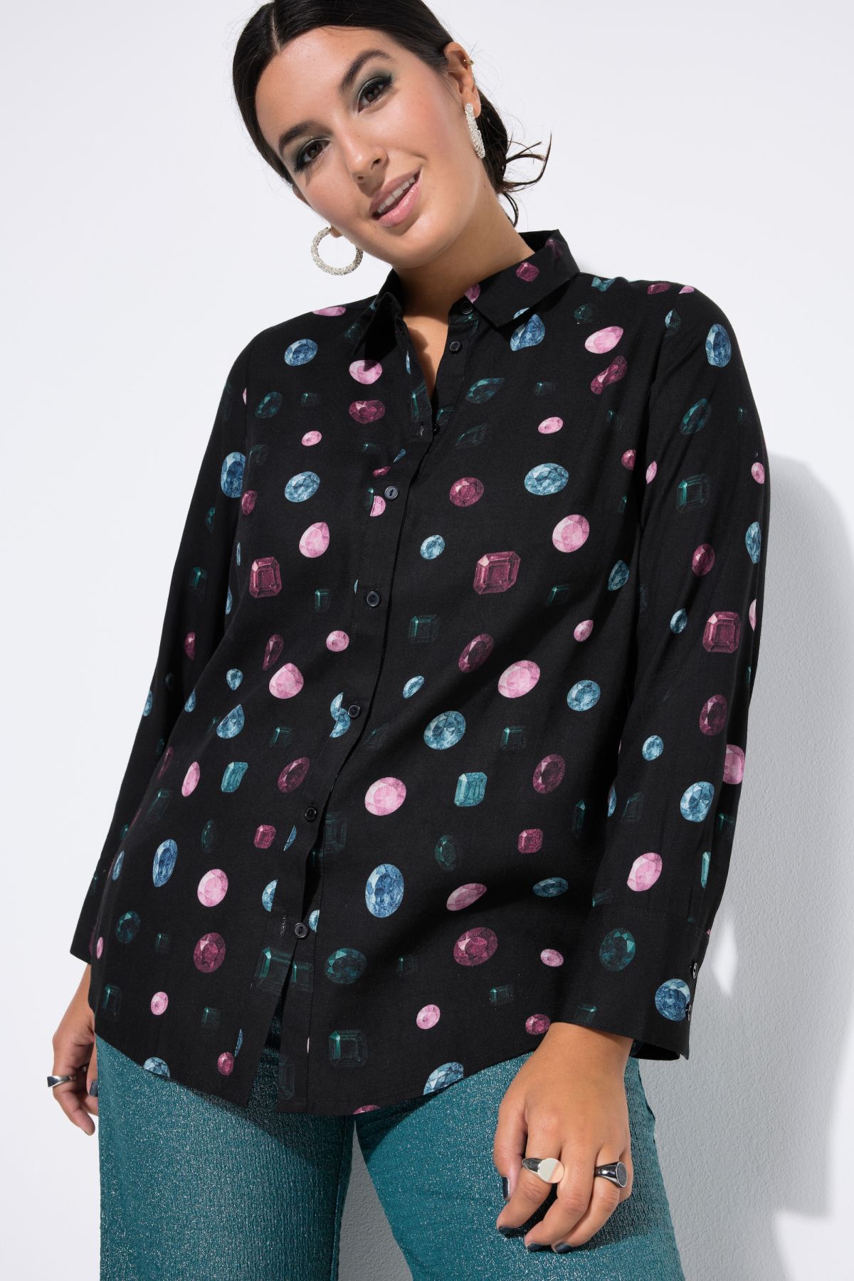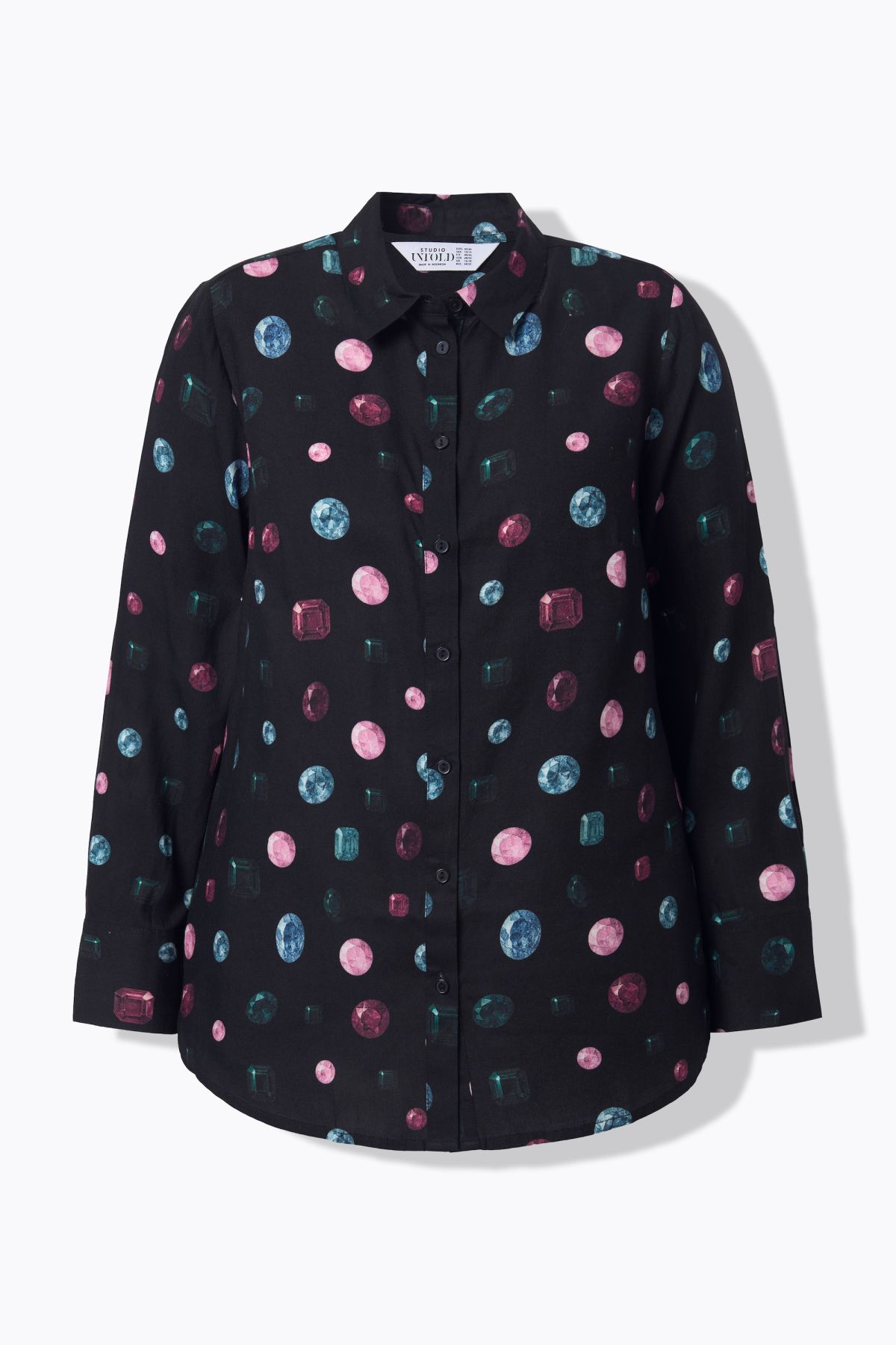 Права кройка, щампа с камъни, яка на ризата, леко заоблен подгъв със странични цепки, дължина приблизително 72-76 см (коригирана по размер).