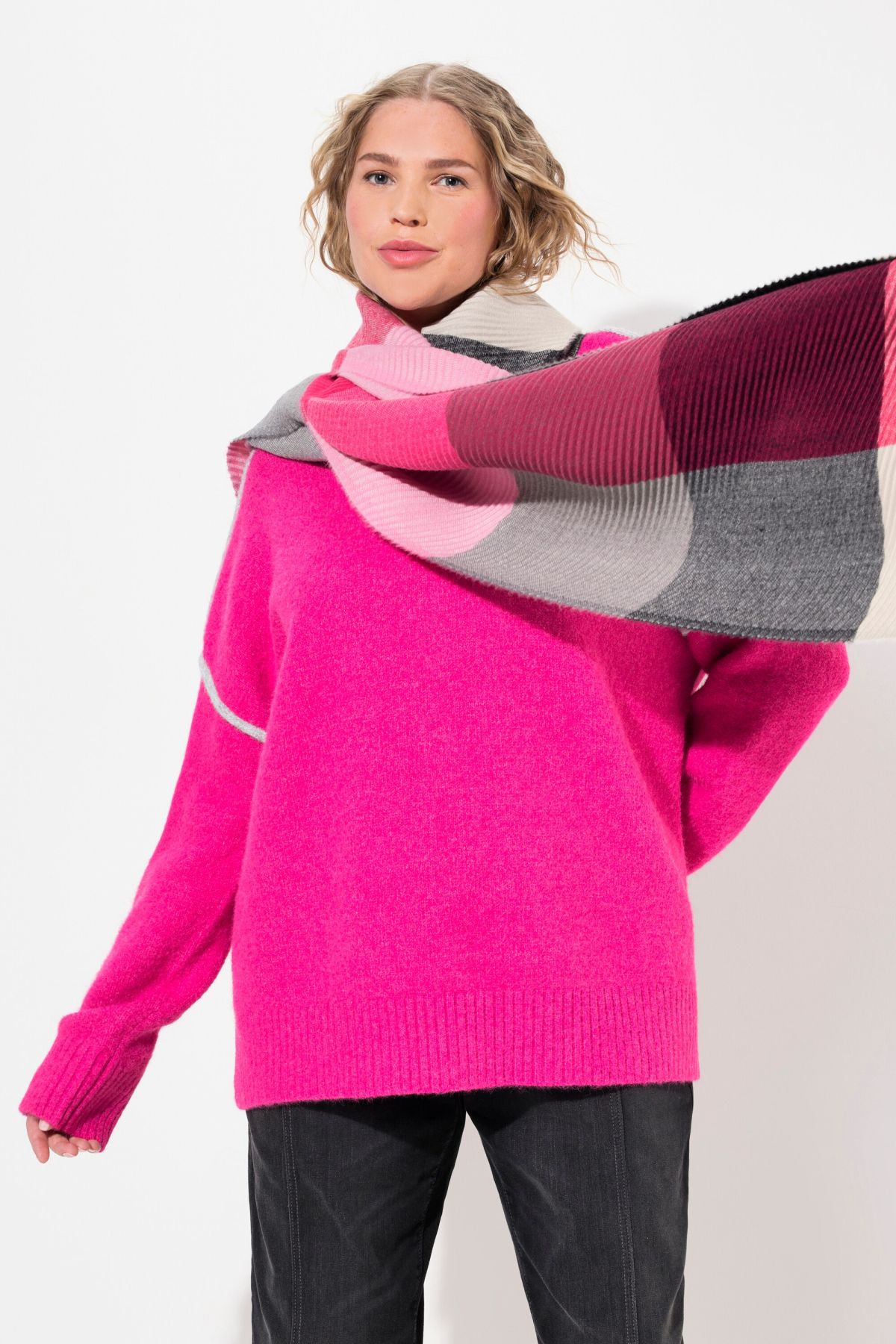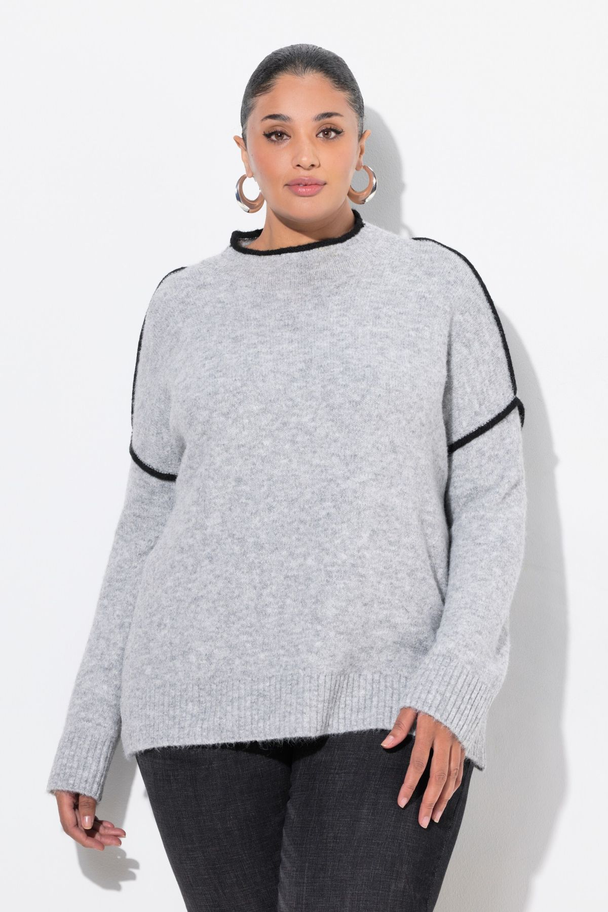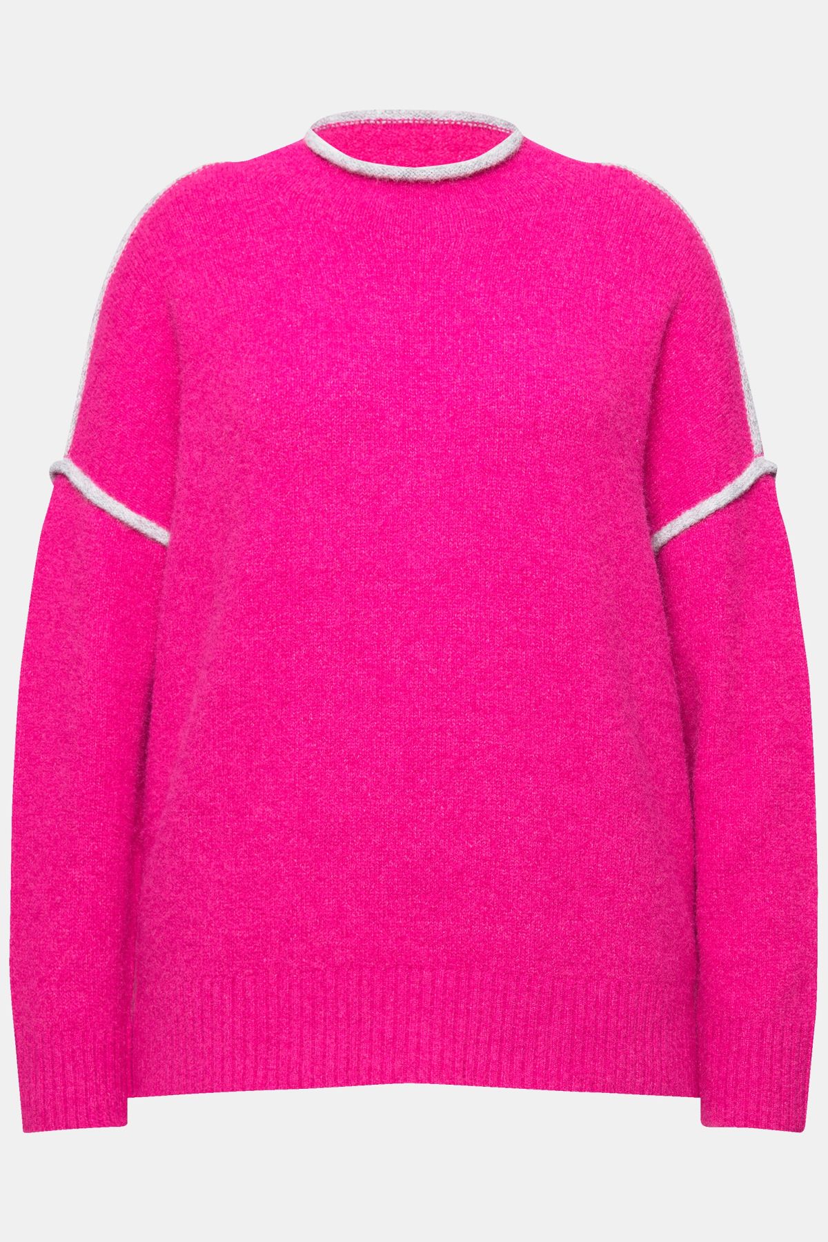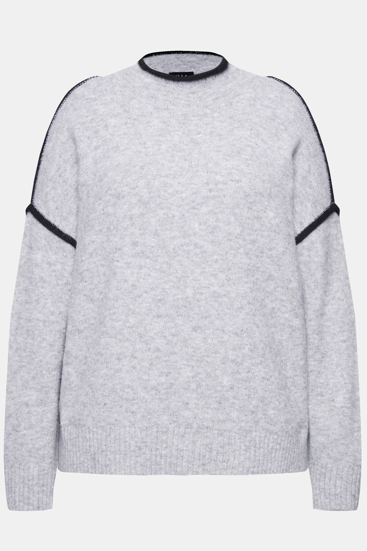 Пуловер с абстрактен шевов детайл на раменете и ръкавите. С малка изправена яка с акцент. От мека, фина плетка.