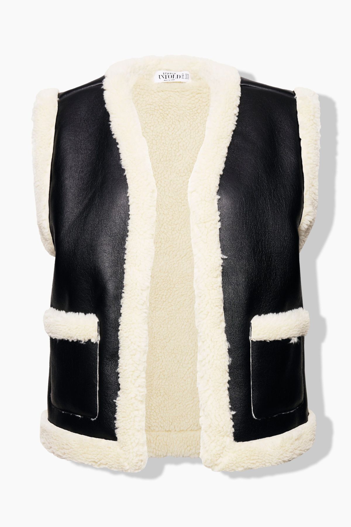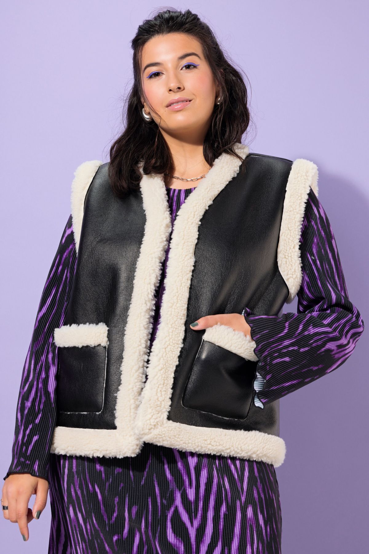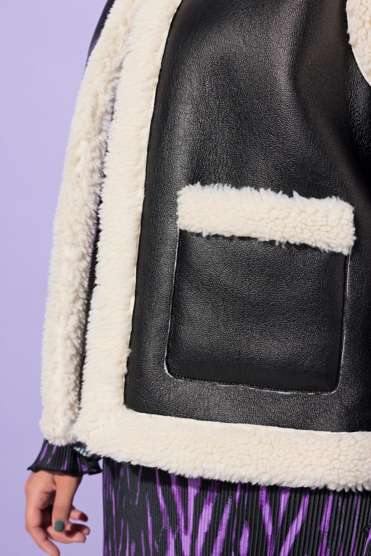 Елек с кожена визия и каракул. С А - линия на силуета. С V - образно деколте и 2 джоба. С външни, странични джобове.