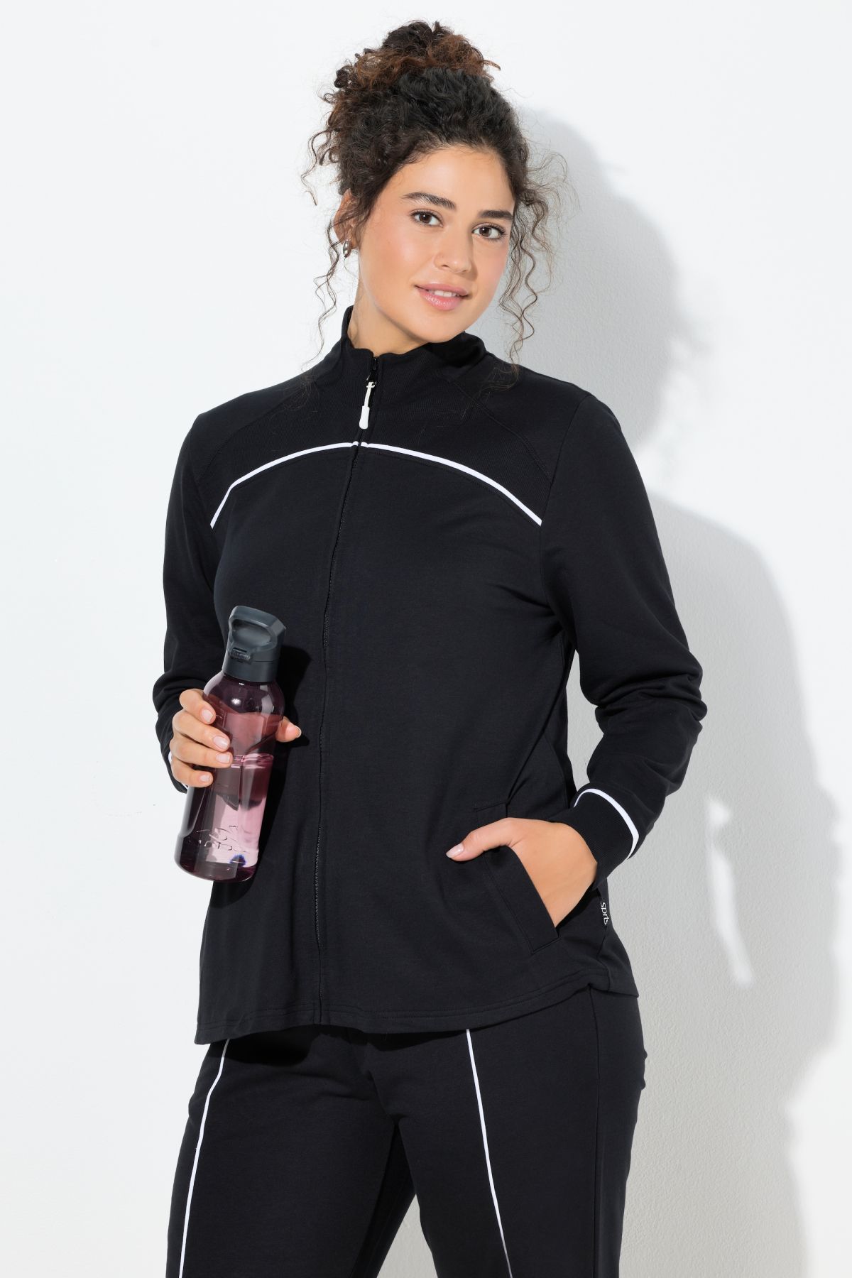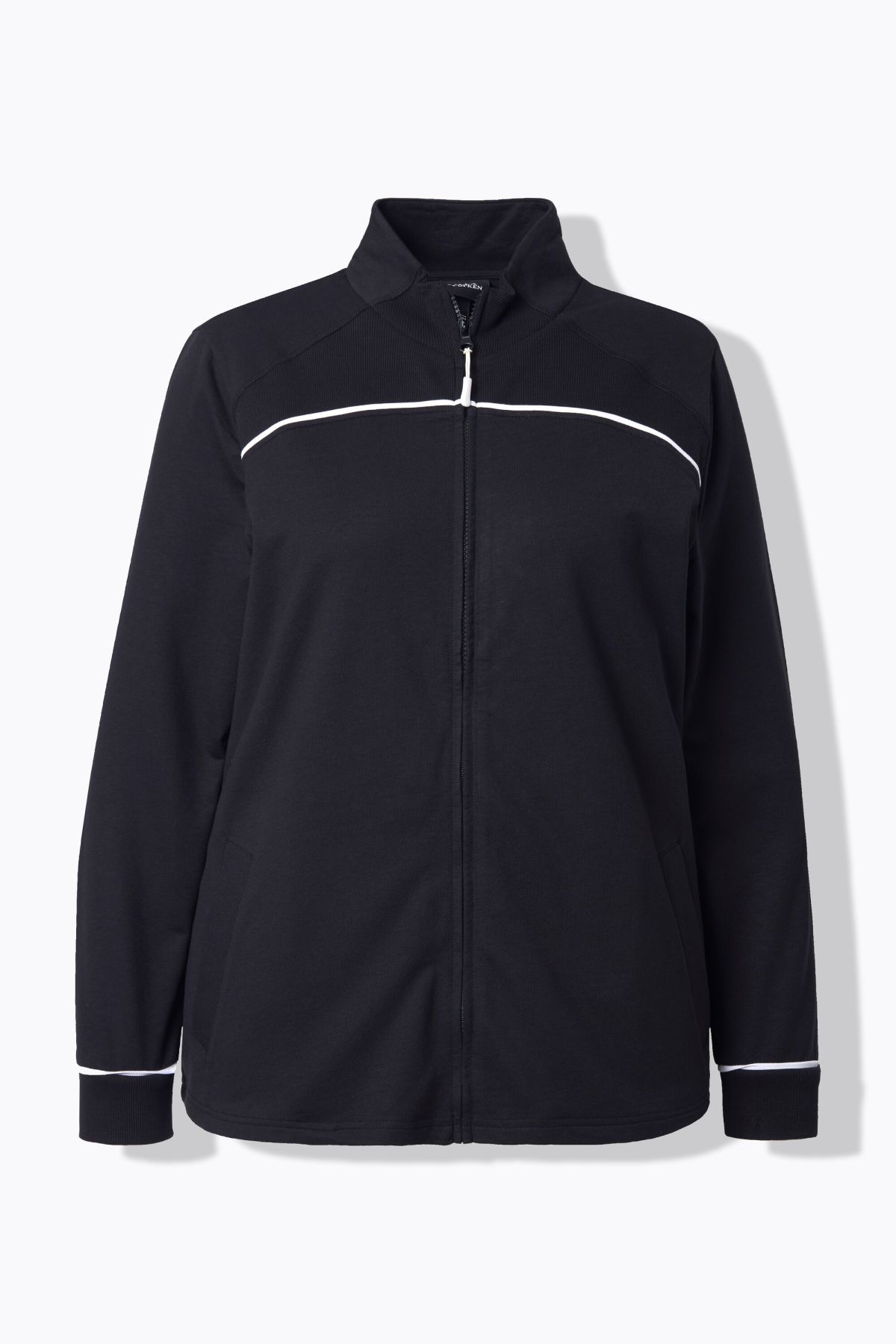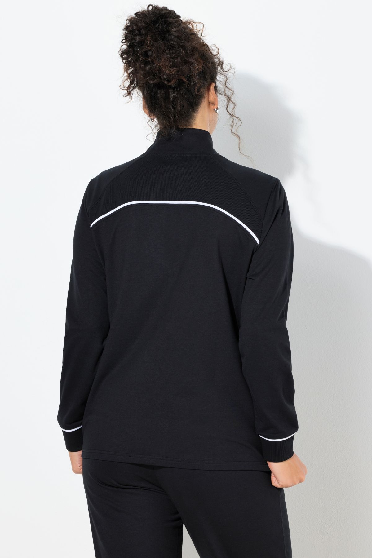 Суитчър с модерни контрастни райета. Със спортна визия и рипсени акценти. С цип отпред, изправена яка, дълги ръкави и странични джобове.