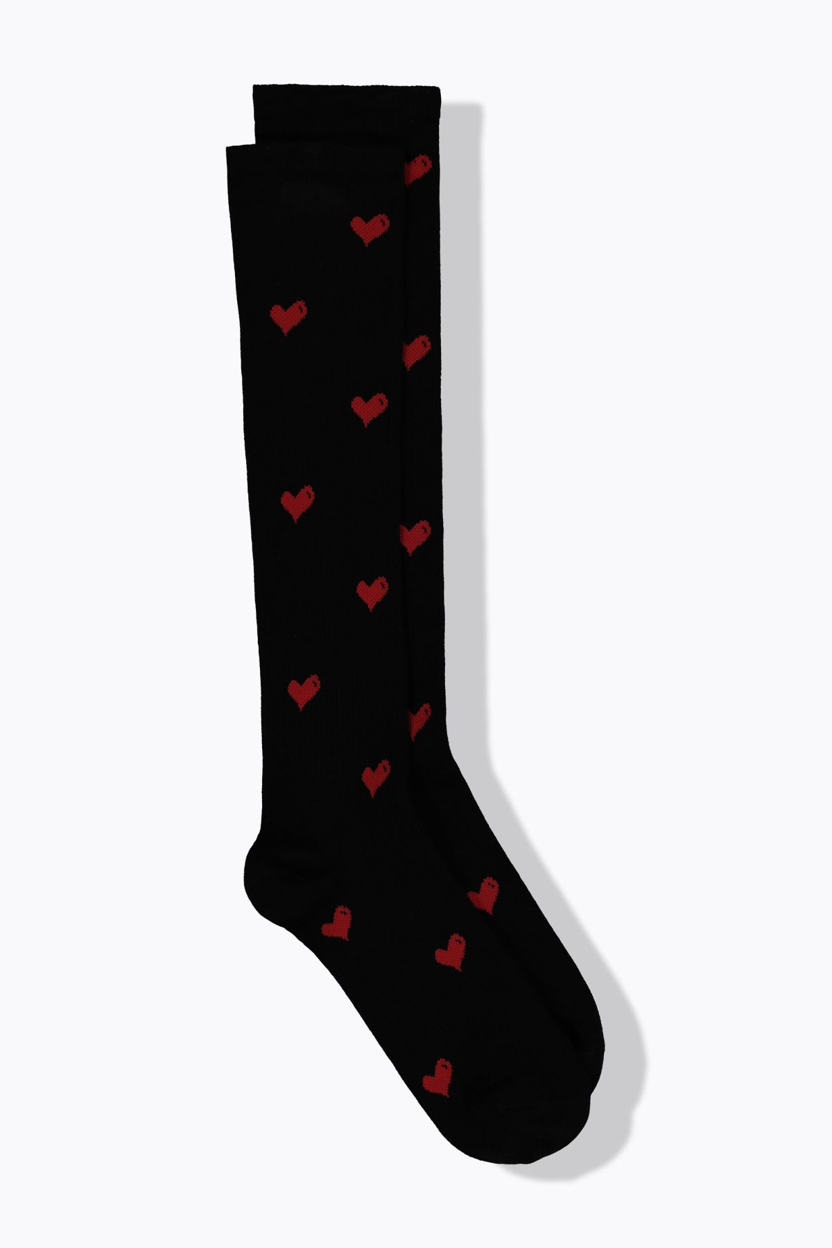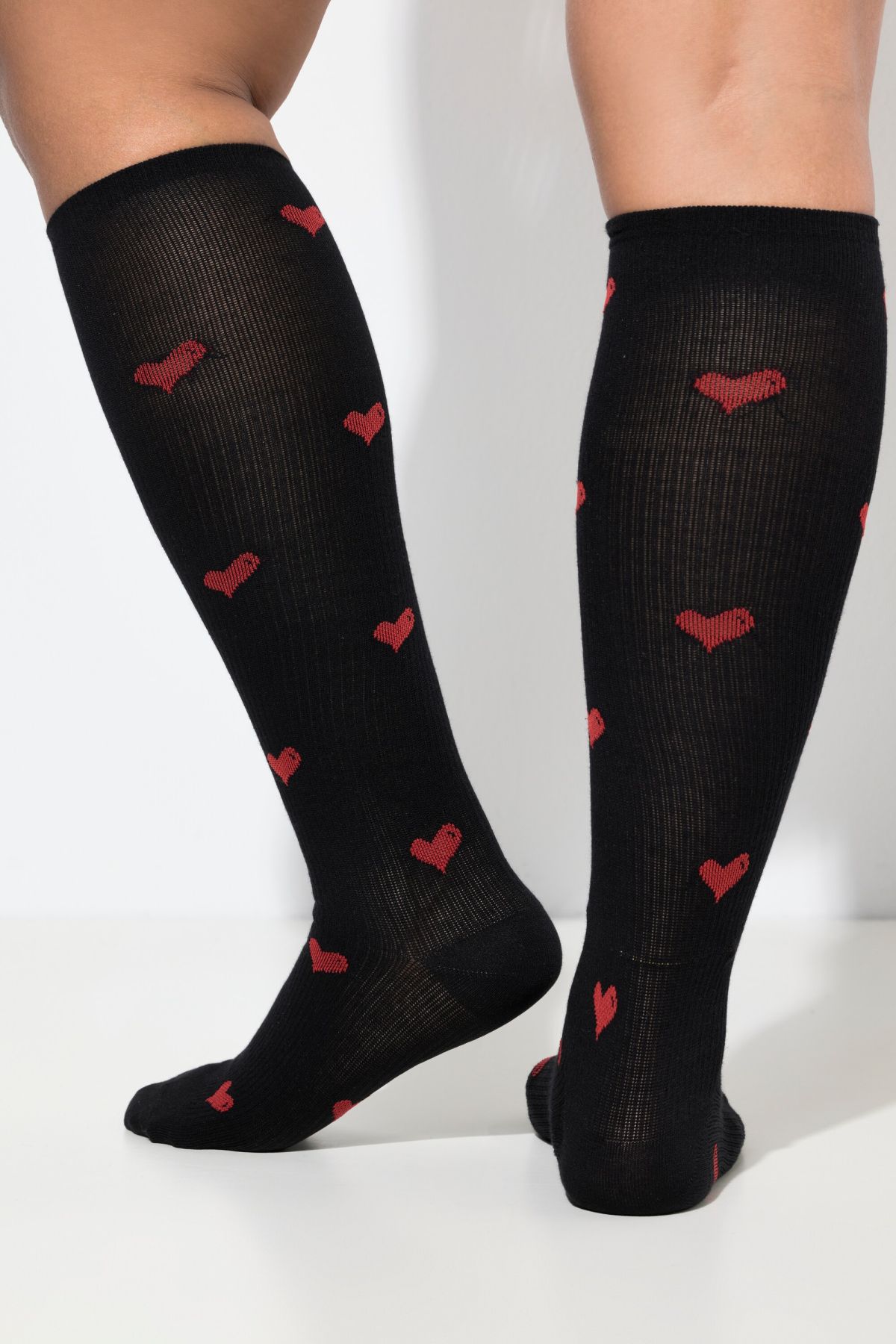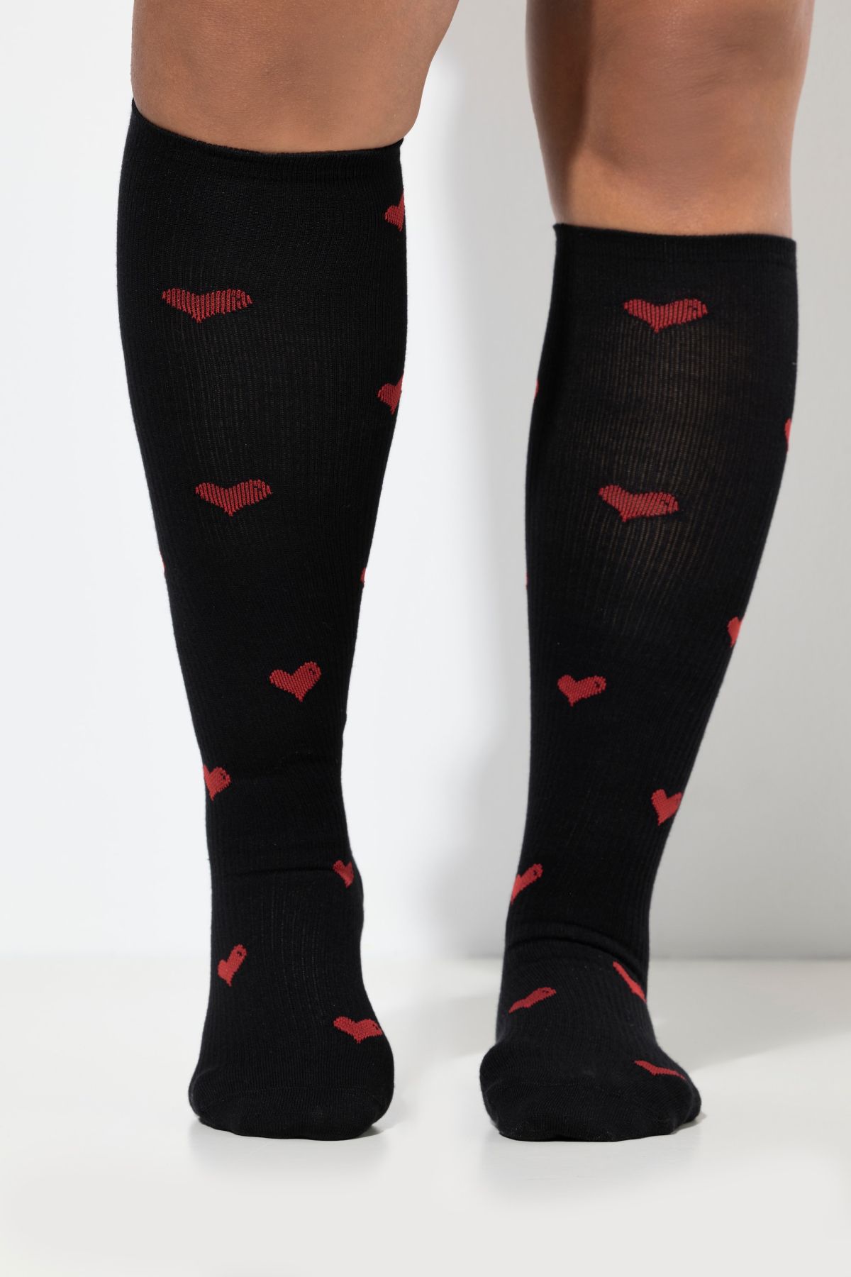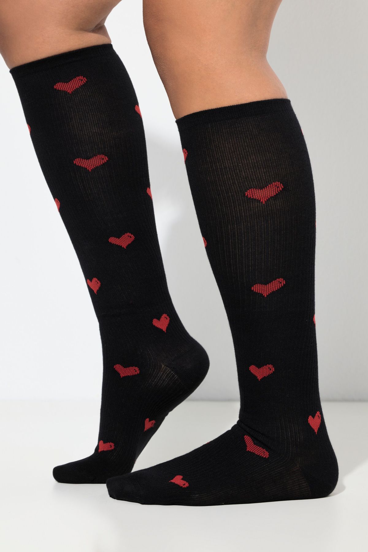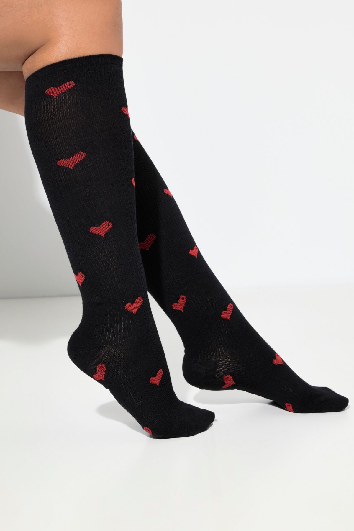 Компресионни чорапи с принт на сърца. С дължина до коляното, подсилени пети и пръсти. От подходяща, еластична материя.