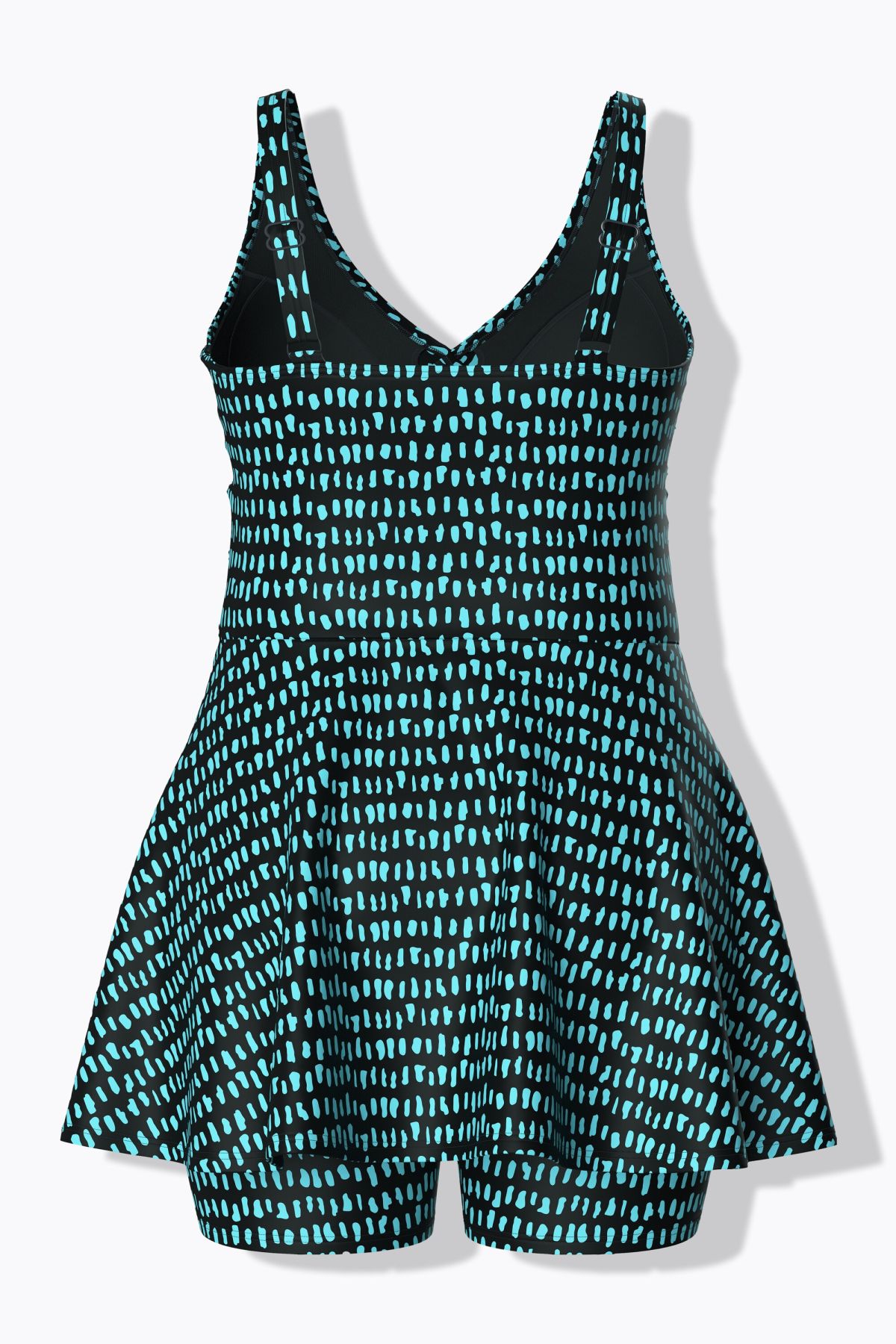 Бански тип рокля с принт на точки и комфортна А - линия на силуета. С оформени чашки, еластична лента под бюста, широки комфортни презрамки и подплата.