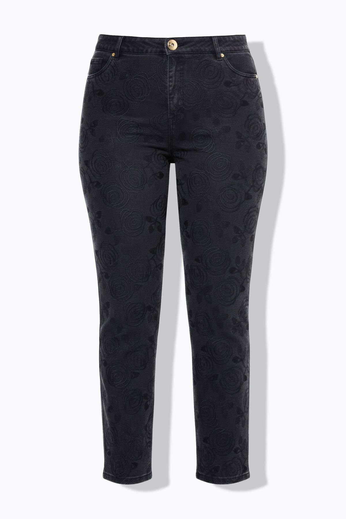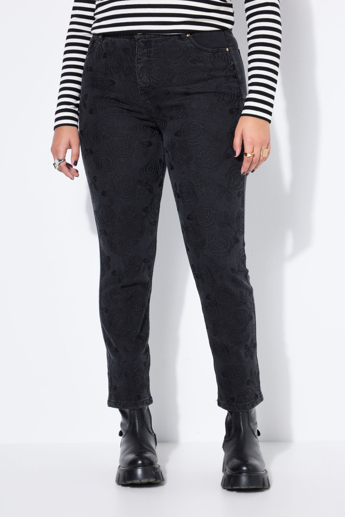 Дънки тип Mom с цветна бродерия отпред. Дизайн с фиксирана талия с гайки за колан, копче и цип отпред. Със стесняващи се крачоли. От мека, памучна материя.