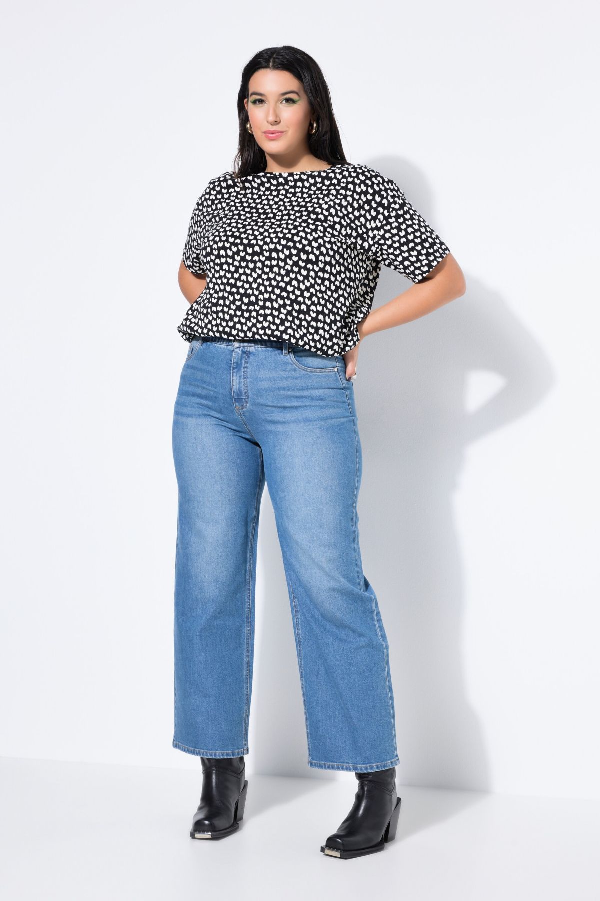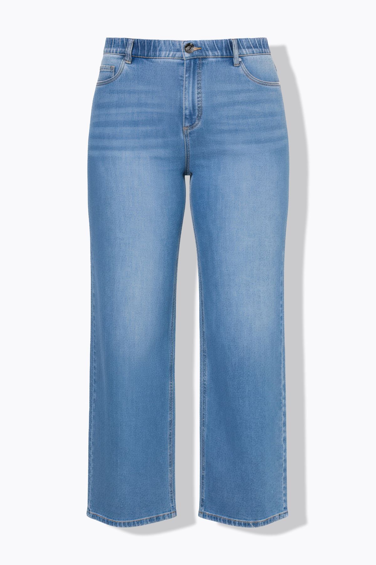 Широки крачоли, висока талия, изключително мек, приятно еластичен деним, 5 джоба, еластична талия с гайки за колан, вътрешен шев приблизително 78 см.