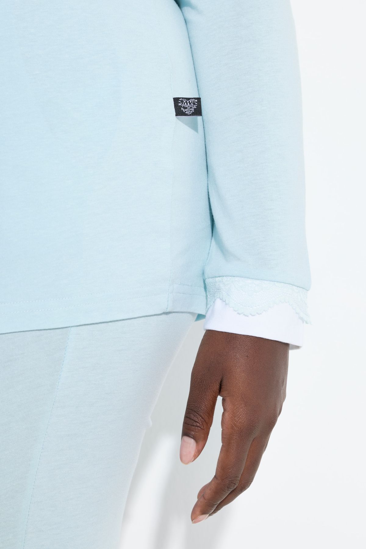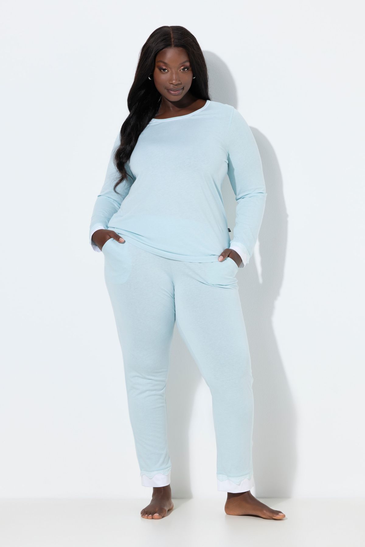Супер мека пижама с контрастна дантела на подгъва. С горнище с кръгло деколте и дълги ръкави. С едноцветно долнище с еластична талия и странични джобове.