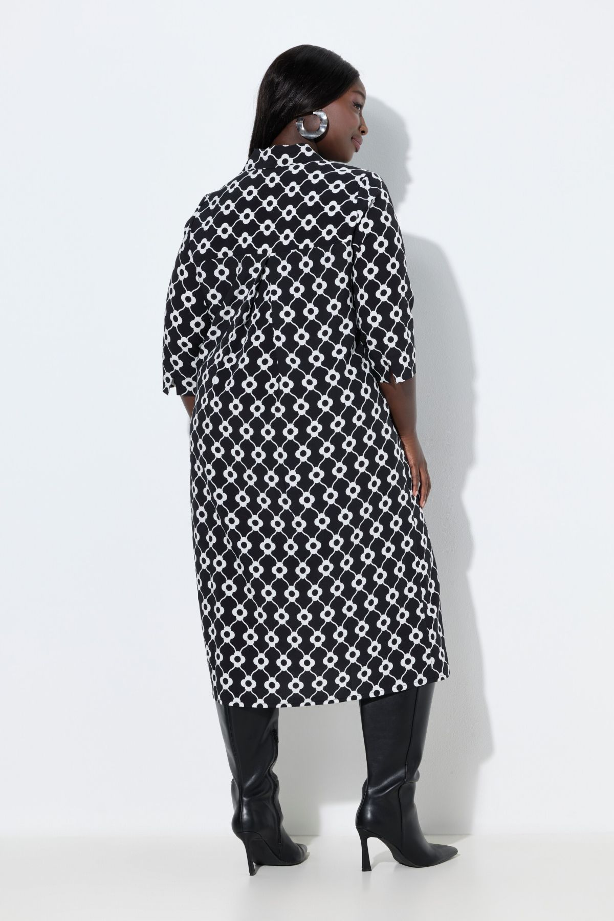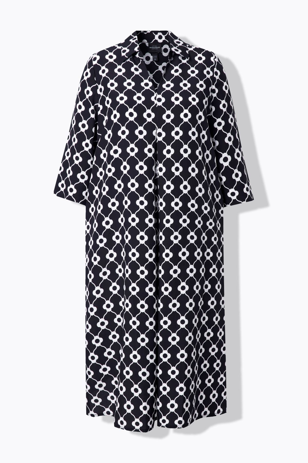 Рокля с принт на графични цвете. С V - образно деколте и 3/4 ръкави. От модерна памучна материя. С цепки на подгъва за допълнителен комфорт.