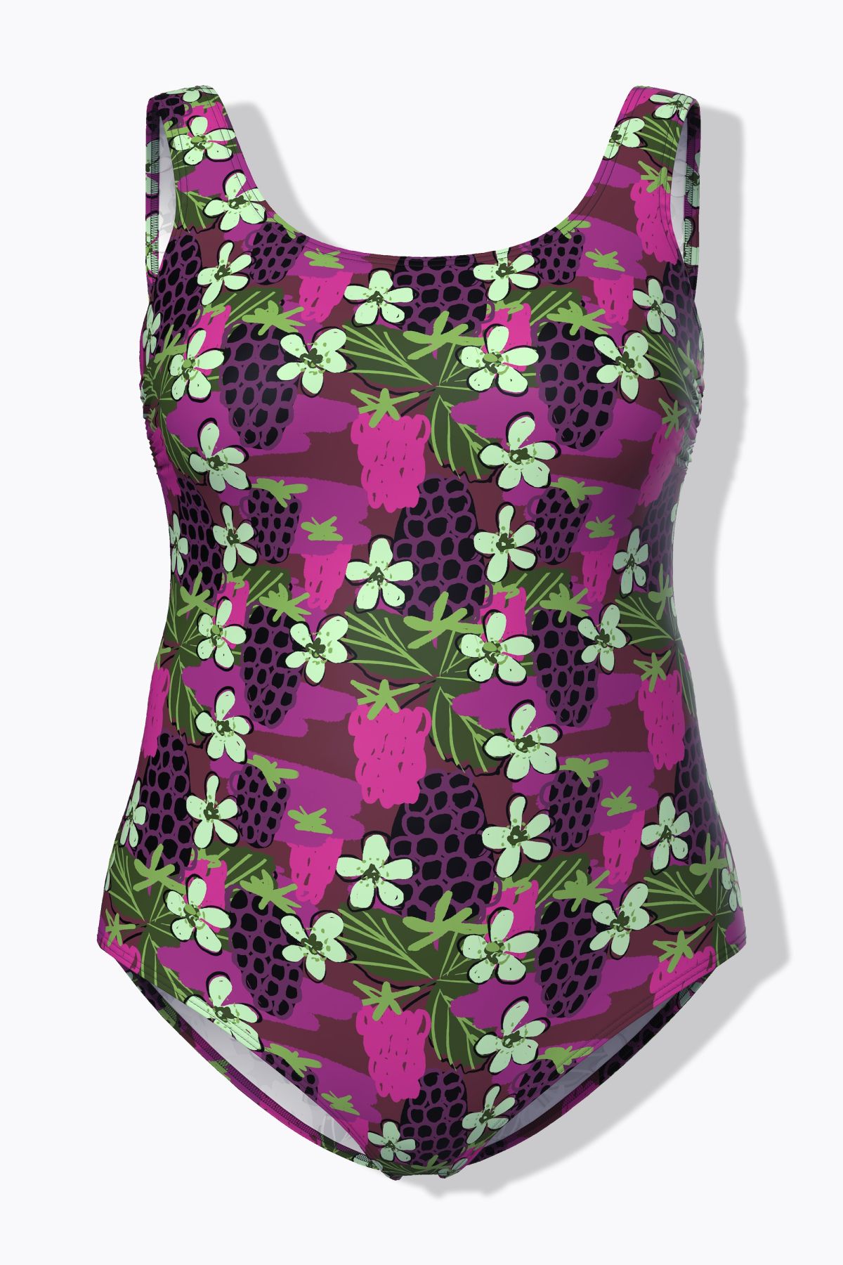 Бански с принт на горски плодове в спортен силует без оформени чашки. Дълбоко изрязан гръб. Мека подплата, поддържаща лента под бюста. От еластична мека материя.