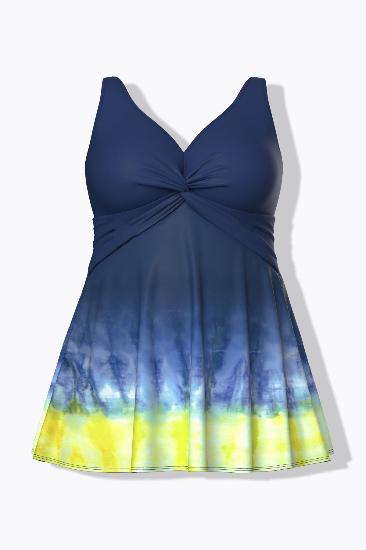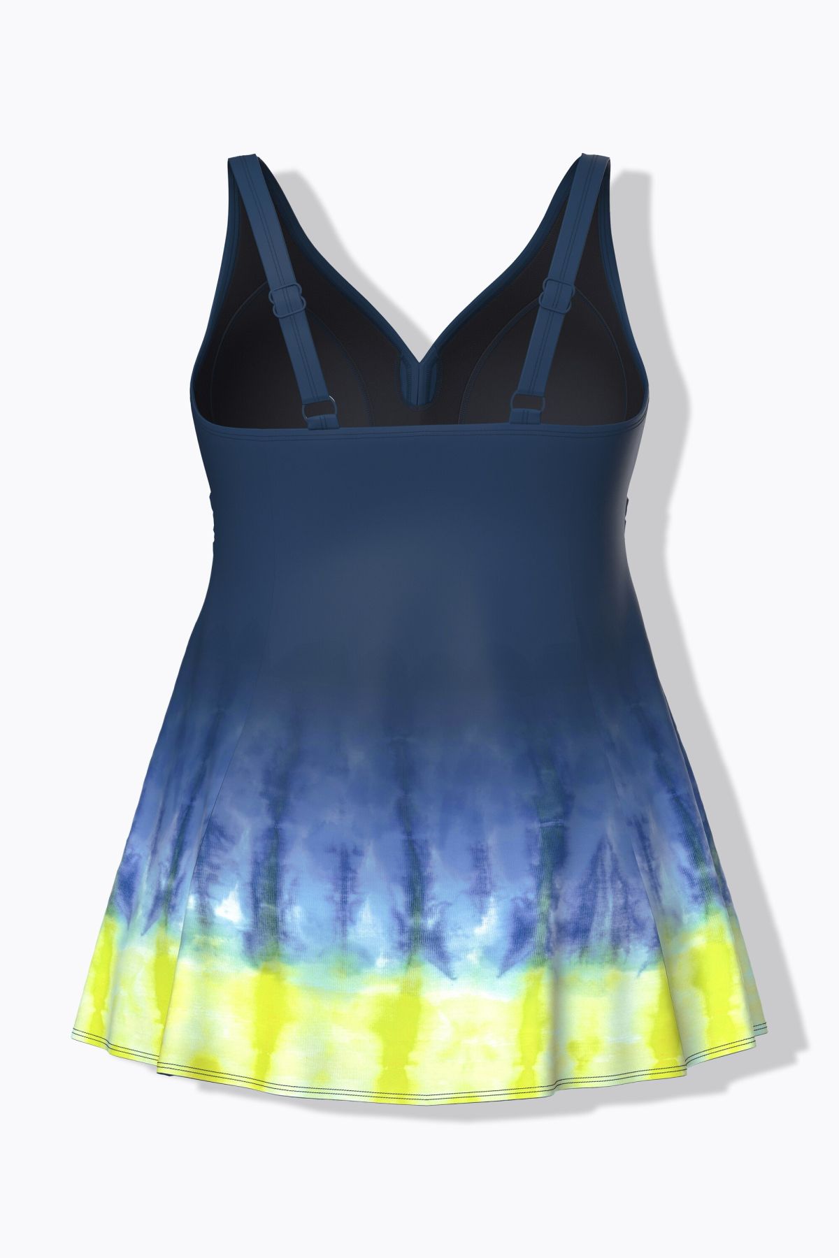 Бански тип рокля с батиков принт и комфортна А - линия на силуета. С оформени чашки, еластична лента под бюста, широки комфортни презрамки и подплата.