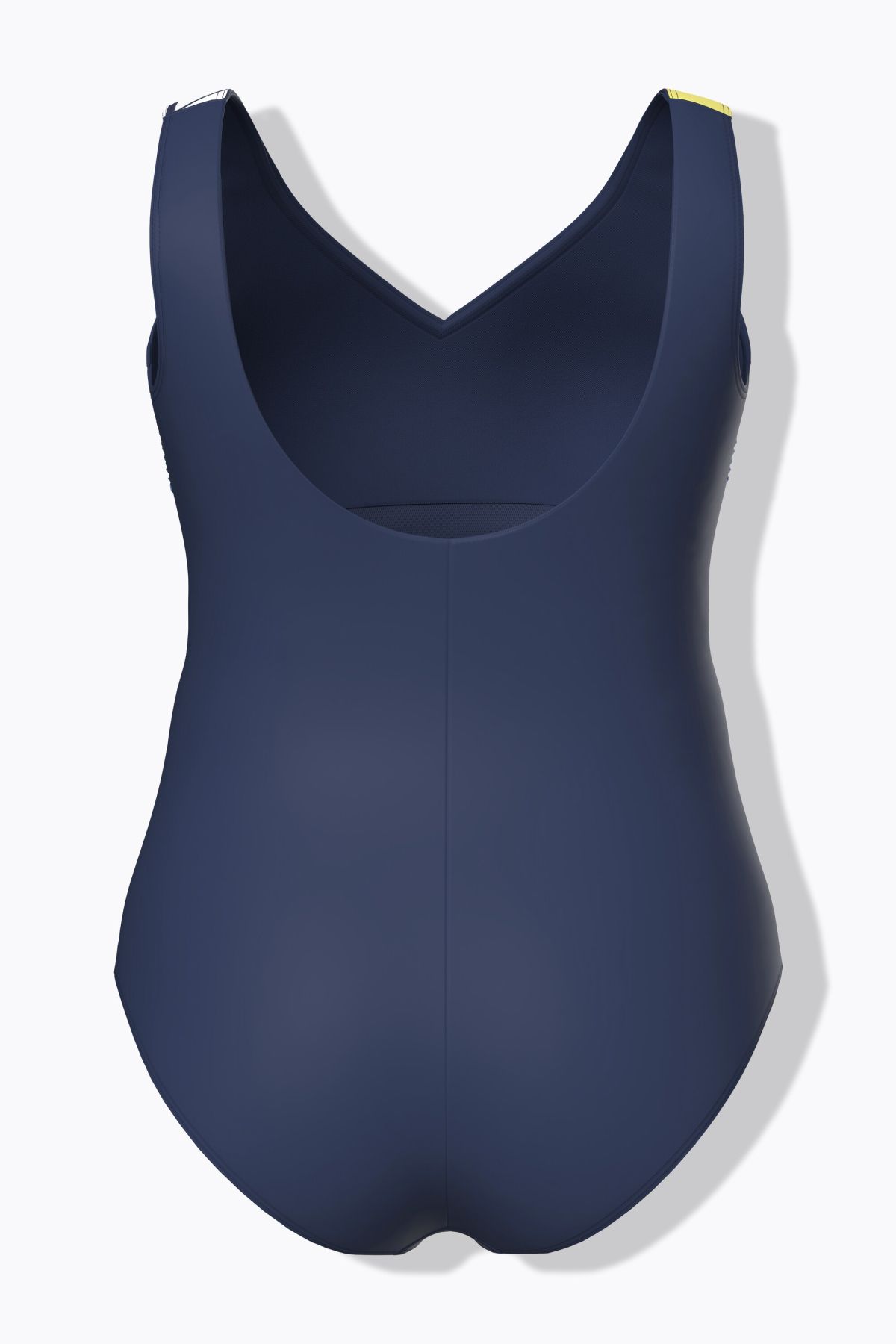 Бански с морски принт на лодки в спортен силует без оформени чашки. Дълбоко изрязан гръб. Мека подплата, поддържаща лента под бюста. От еластична мека материя.