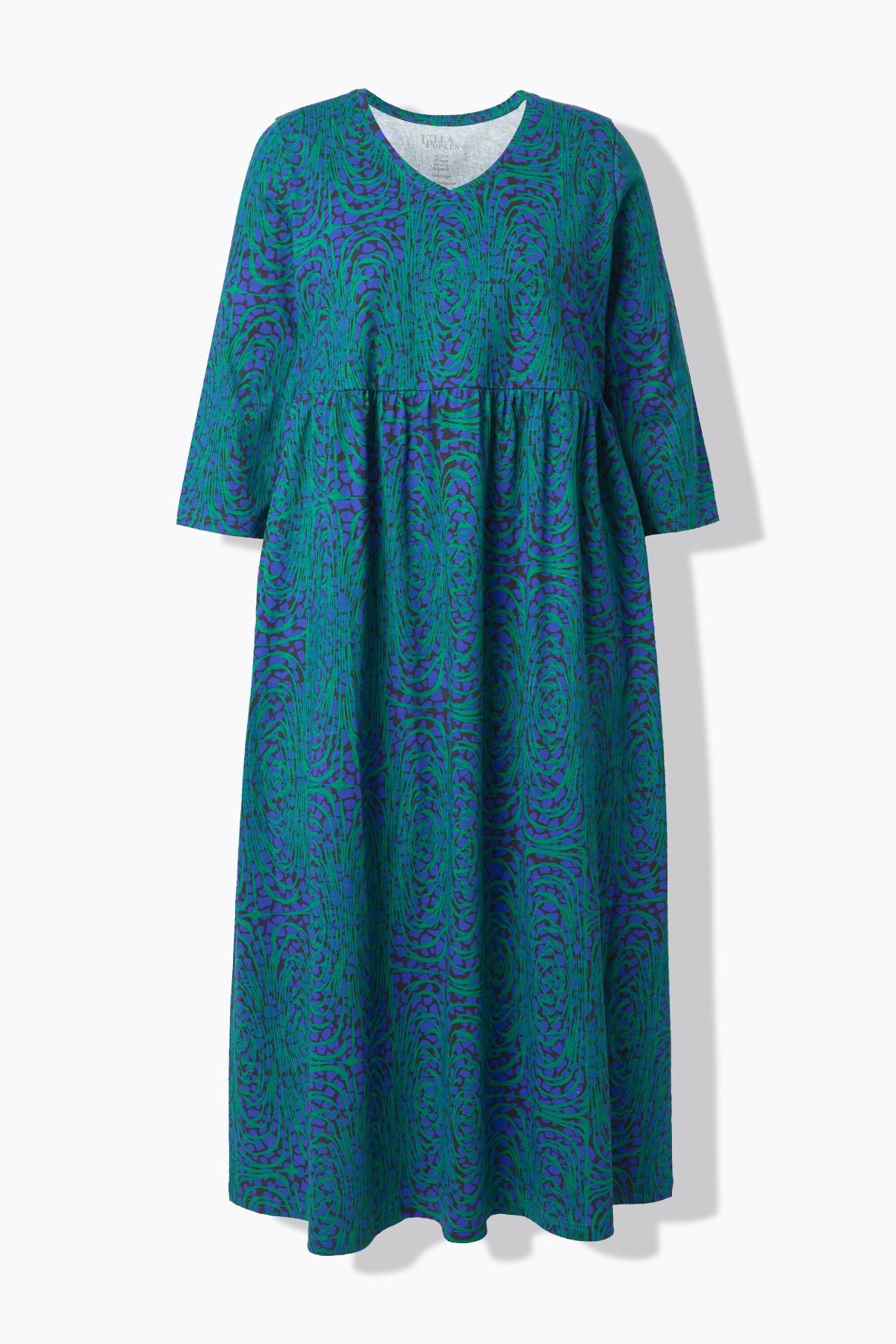 Рокля от мека трикотажна материя с модерен свеж. С кръгло деколте и А - линия на силуета. С 3/4 ръкави и странични цепки на подгъва. Със странични цепки за допълнителен комфорт