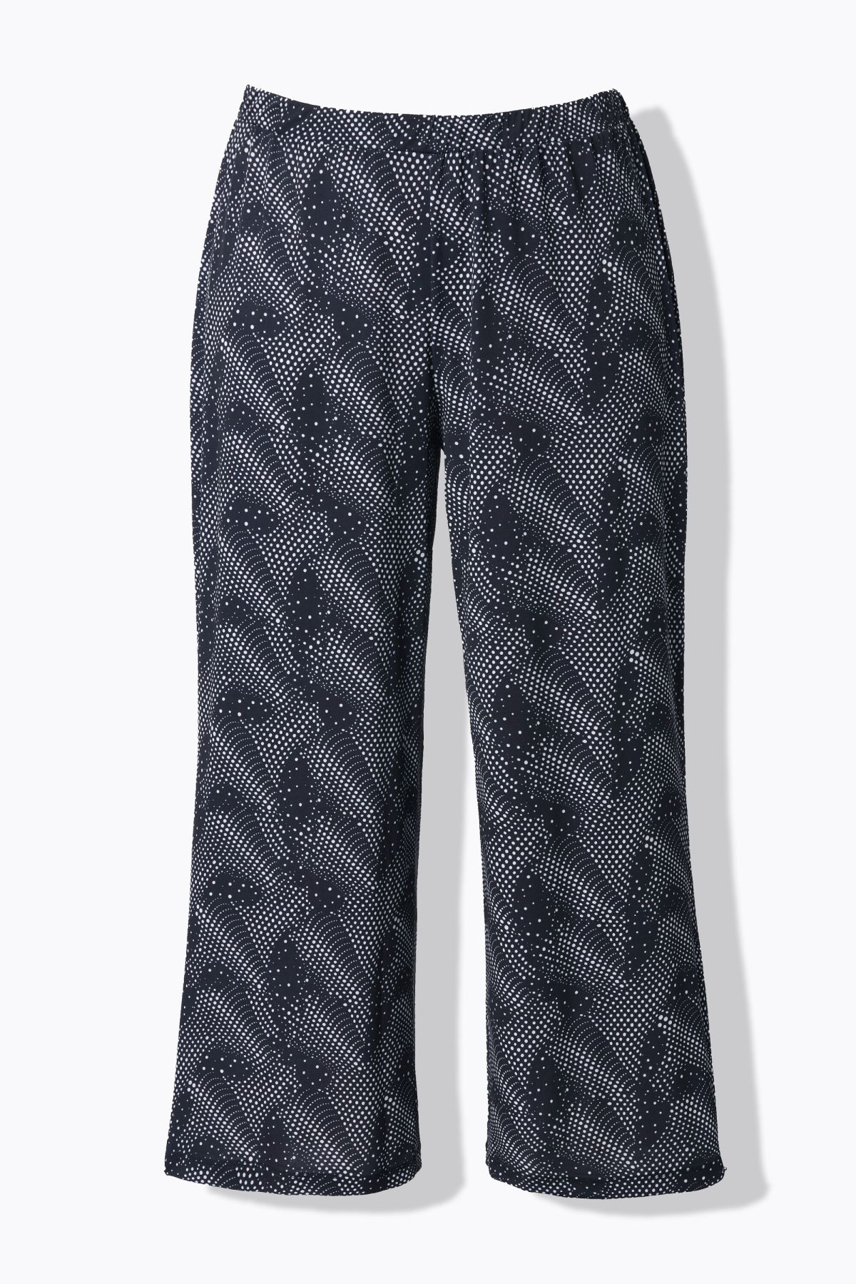 Панталон с широки крачоли с еластична талия. Модел с по - къса дължина и странични джобове. От мека, прохладна материя.