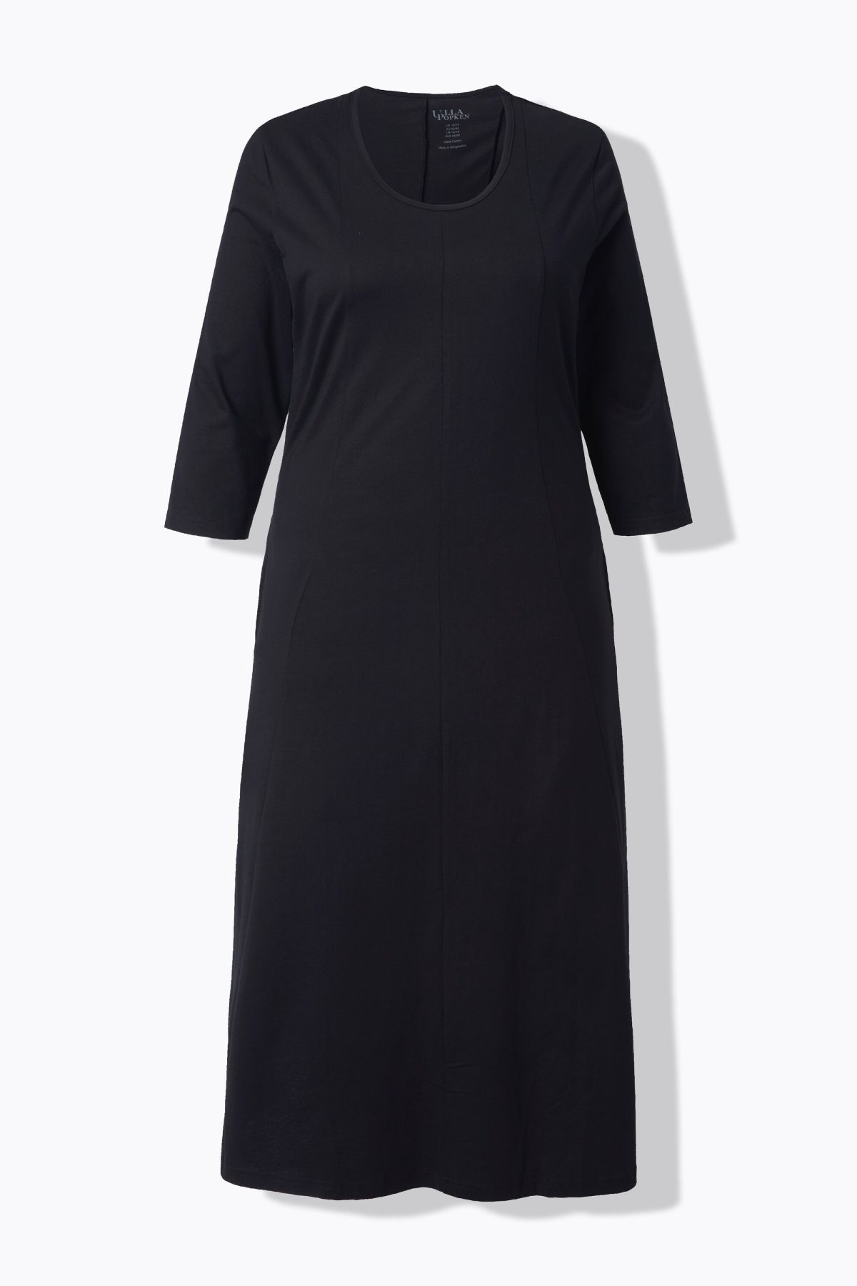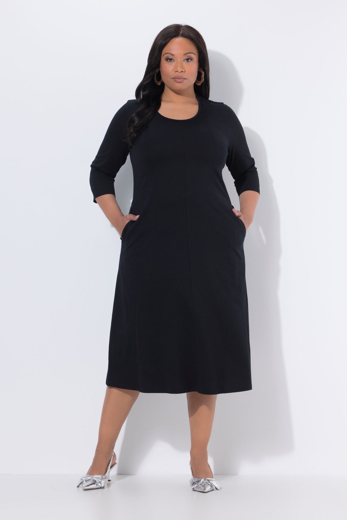 Рокля едноцветна с деколте тип рокля с кръгло деколте и странични шевови джобове. С А - линия на силуета. С дължина под коляното.