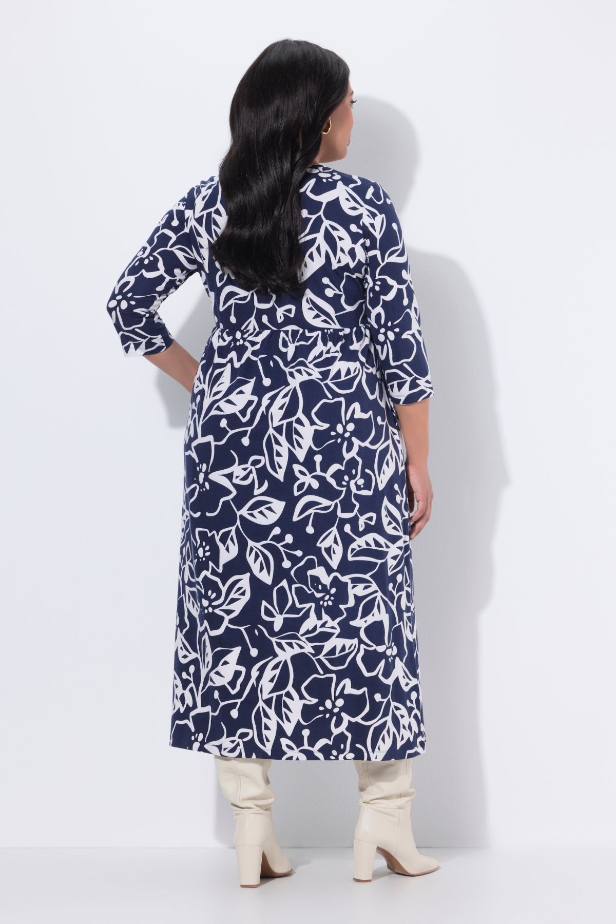 Рокля от мека трикотажна материя с флорален принт. С кръгло деколте и А - линия на силуета. С 3/4 ръкави и странични цепки на подгъва. Със странични цепки за допълнителен комфорт и шевов акцент на талията.