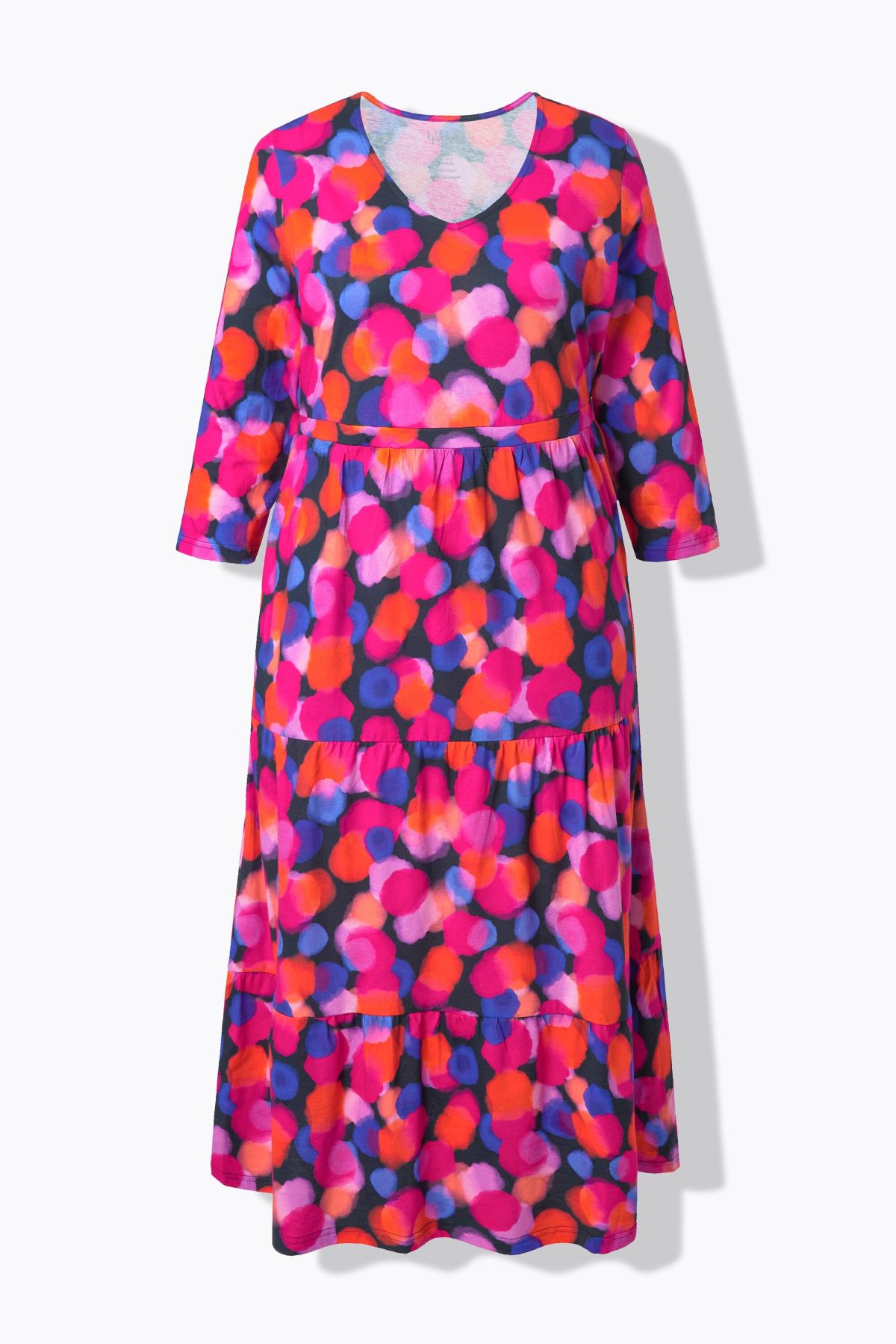 Рокля с цветен принт на точки от мека, памучна материя. С кръгло деколте и А - линия на силуета. С 3/4 ръкави и странични цепки на подгъва. Със странични цепки за допълнителен комфорт и шевов акцент на талията.