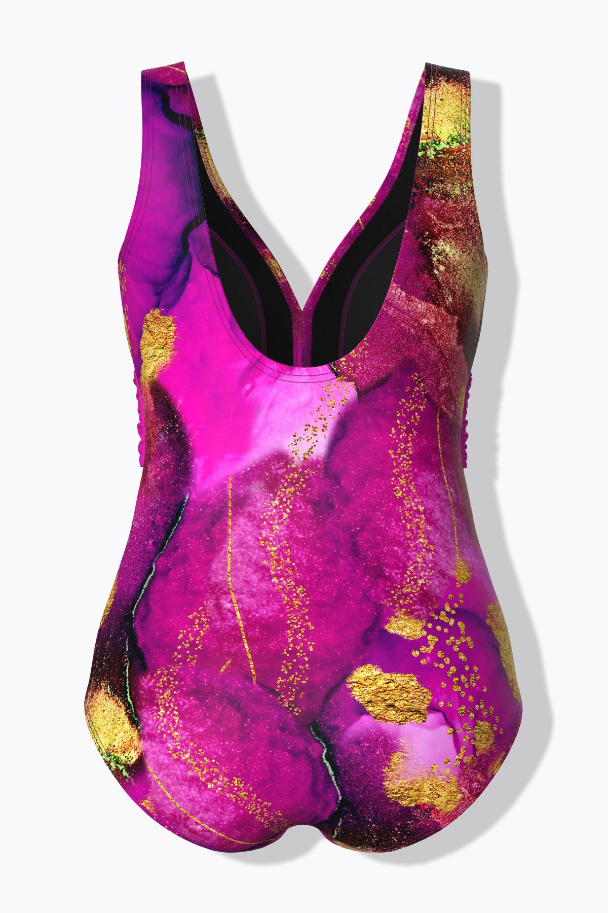 Бански с принт на розови цветя. С V - образно деколте, широки, удобни презрамки, оформени чашки и подплата отпред. С кръгъл акцент под бюста.