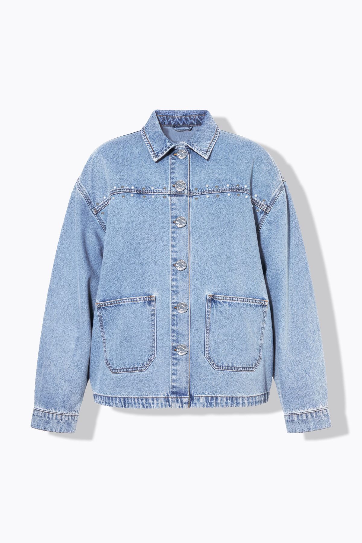 Дънково яке с декоративни мъниста и камъчета. С яка, метални копчета отпред и дълги ръкави с маншет с копче. Със странични джобове.