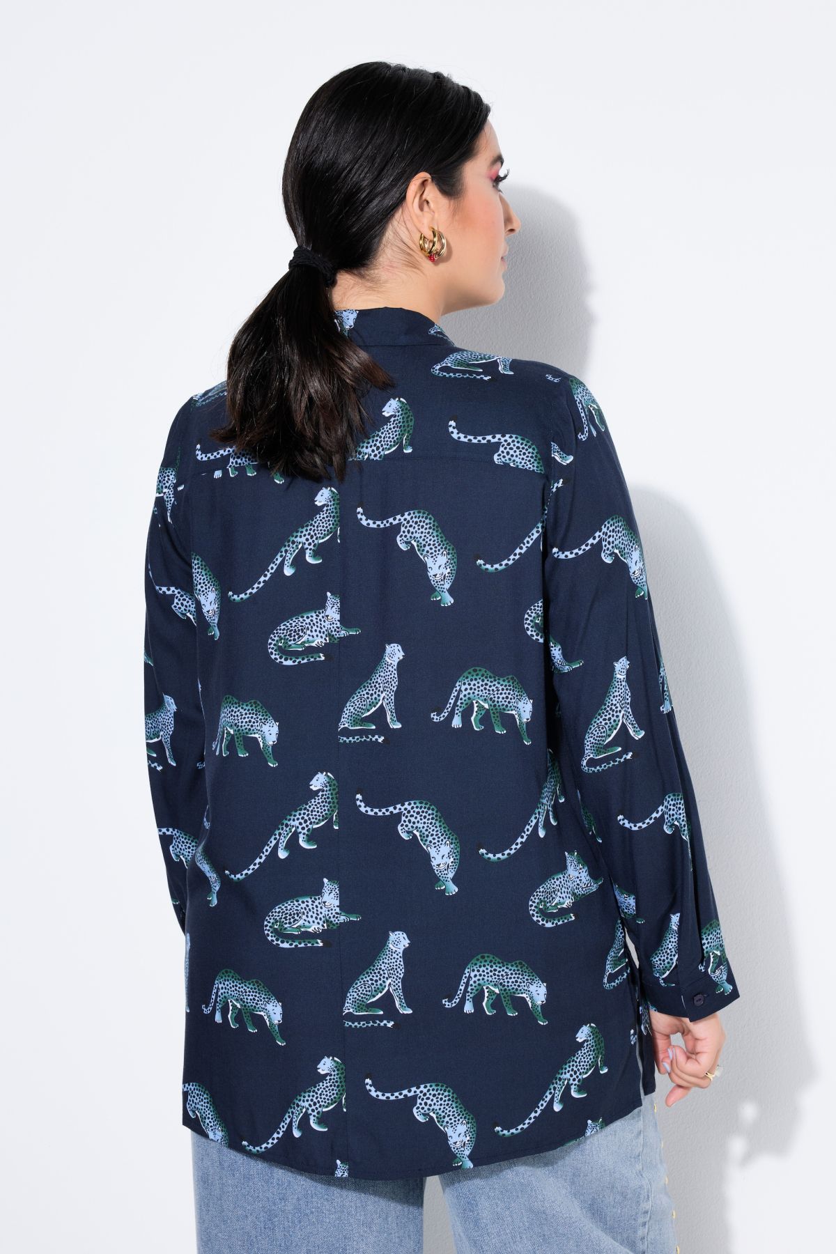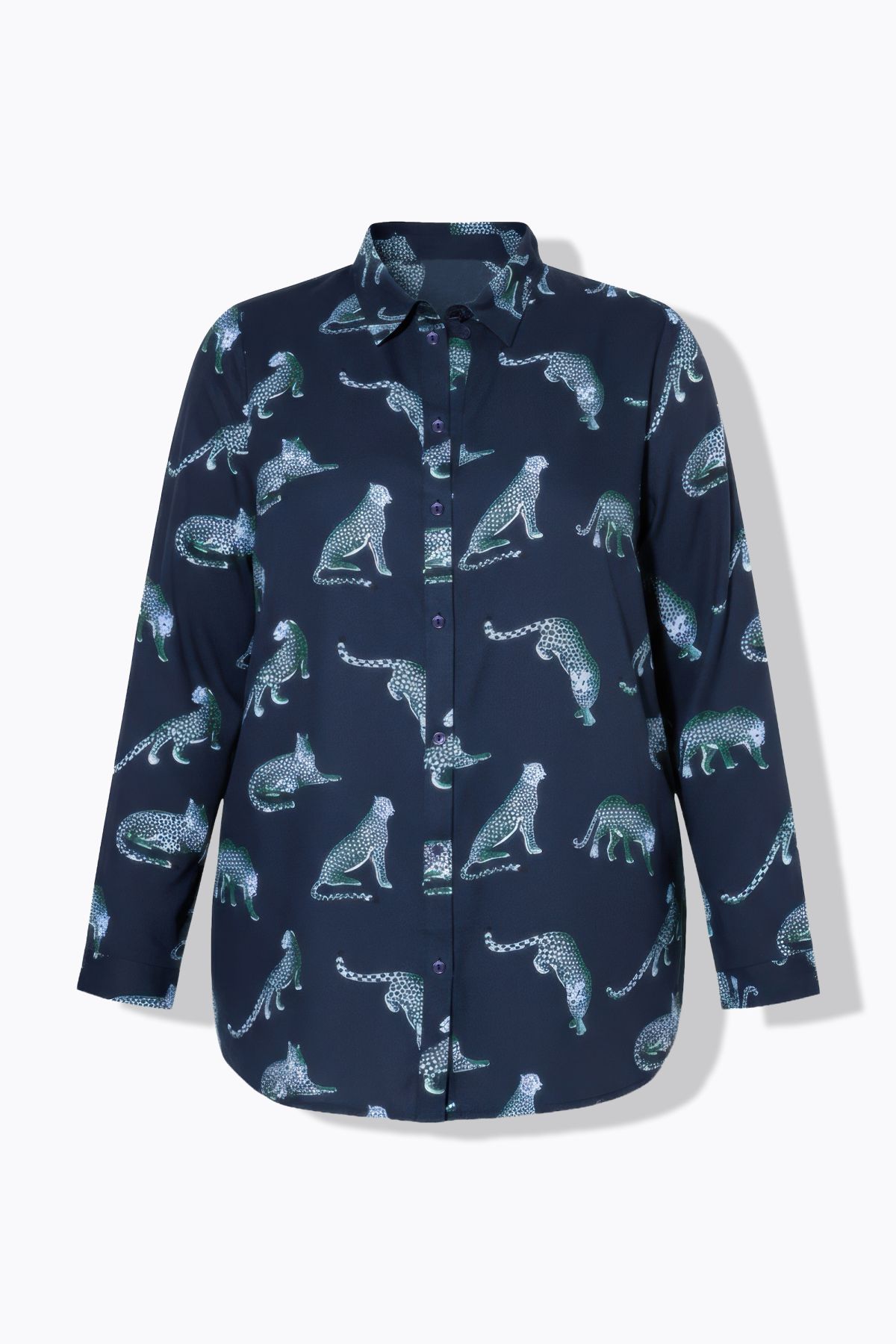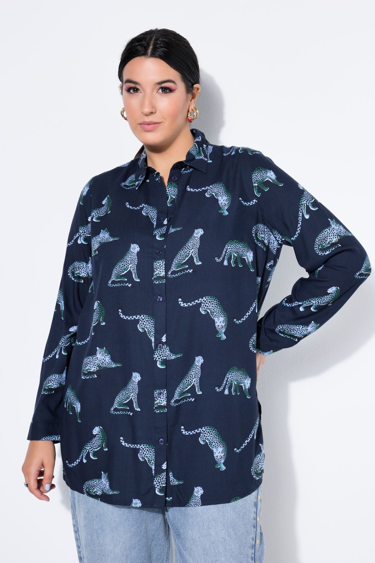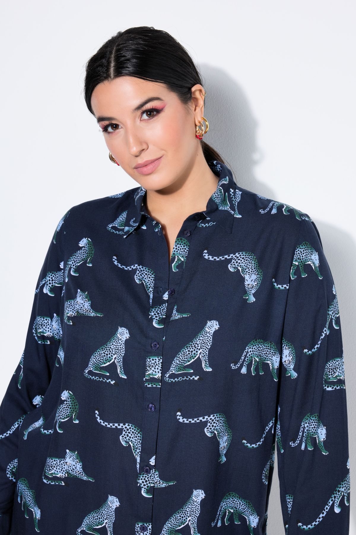 Риза с принт на леопарди. С класически прав силует. С яка, копчета отпред и дълги ръкави с маншет с копче. От лека, прохладна материя.