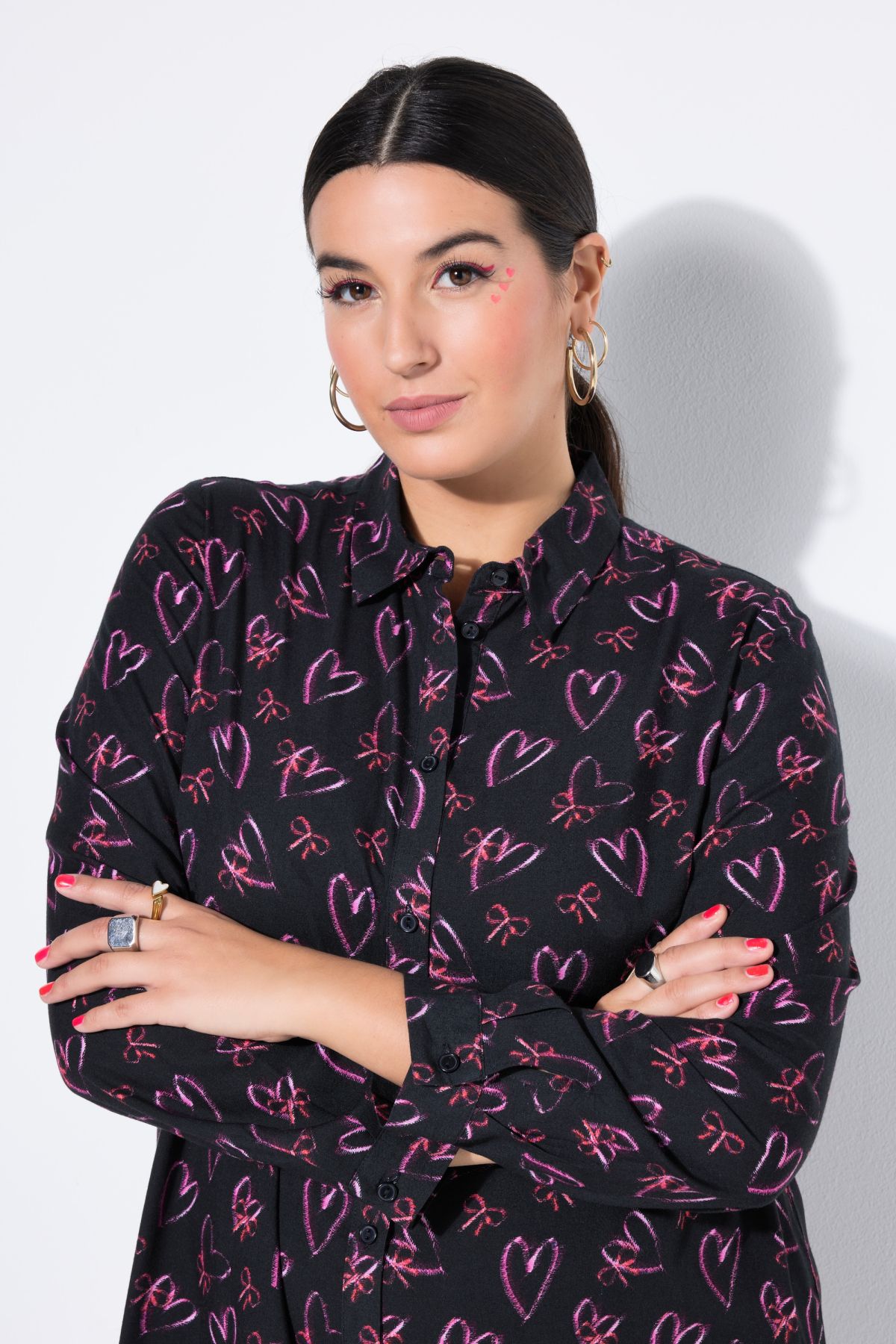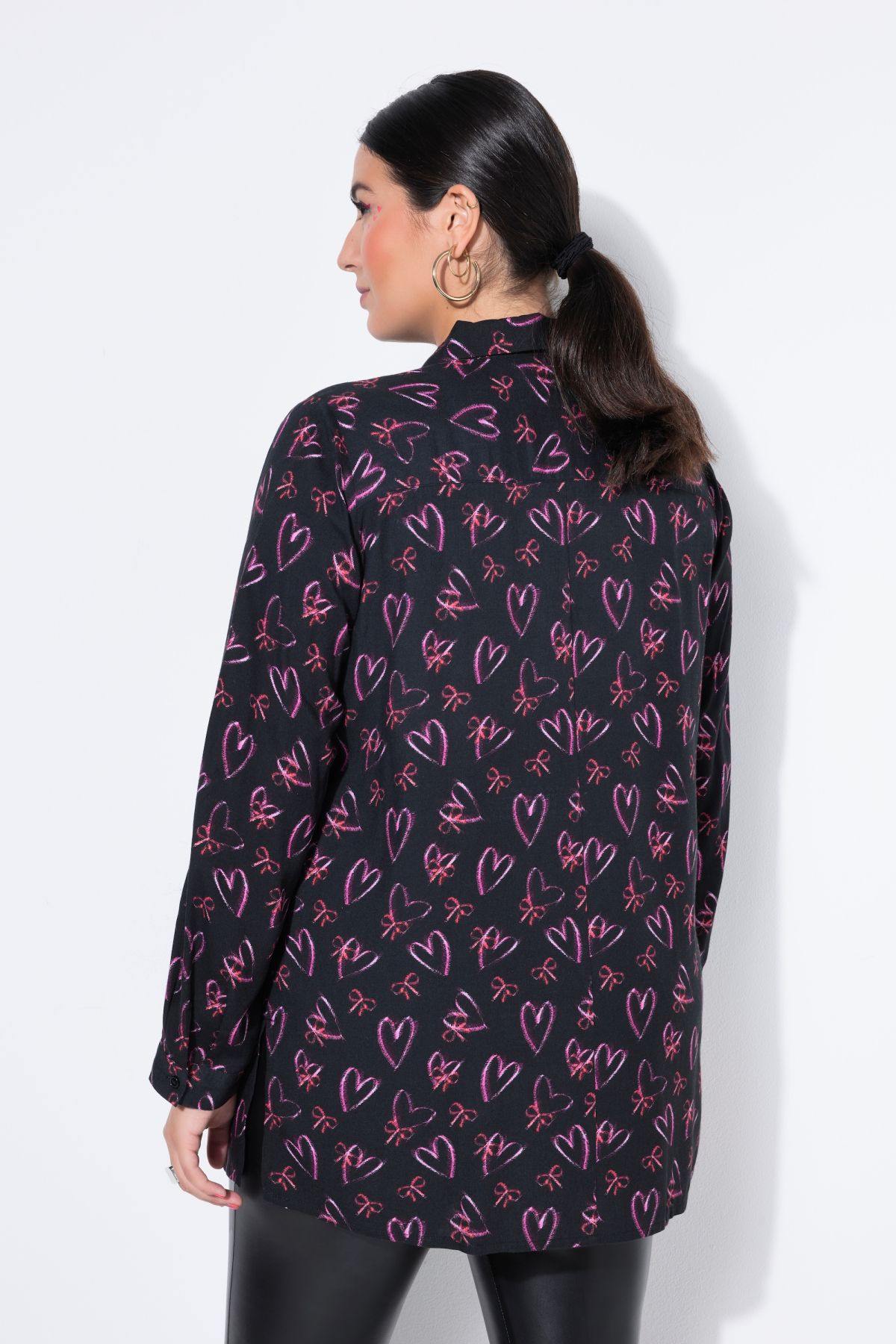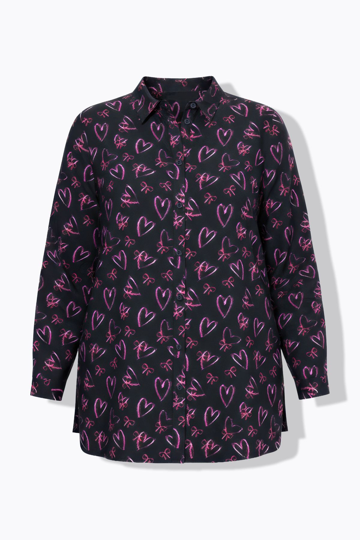 Риза с принт на сърца с прав, издължен силует. С яка, копчета отпред и дълги ръкави с маншет с копче. От лека, вискозна материя.