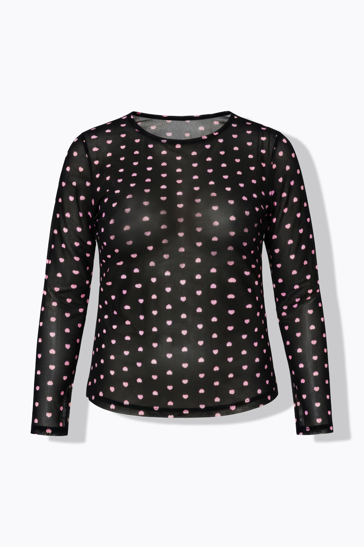 Блуза с мрежеста визия с принт на сърца. С кръгло деколте и дълги ръкави. Прозрачна и комфортна за всеки повод.
