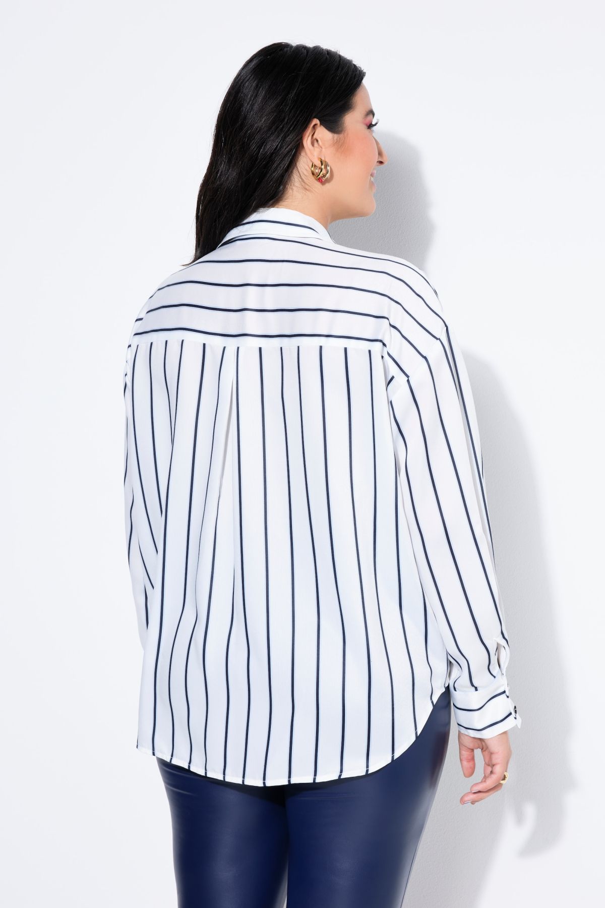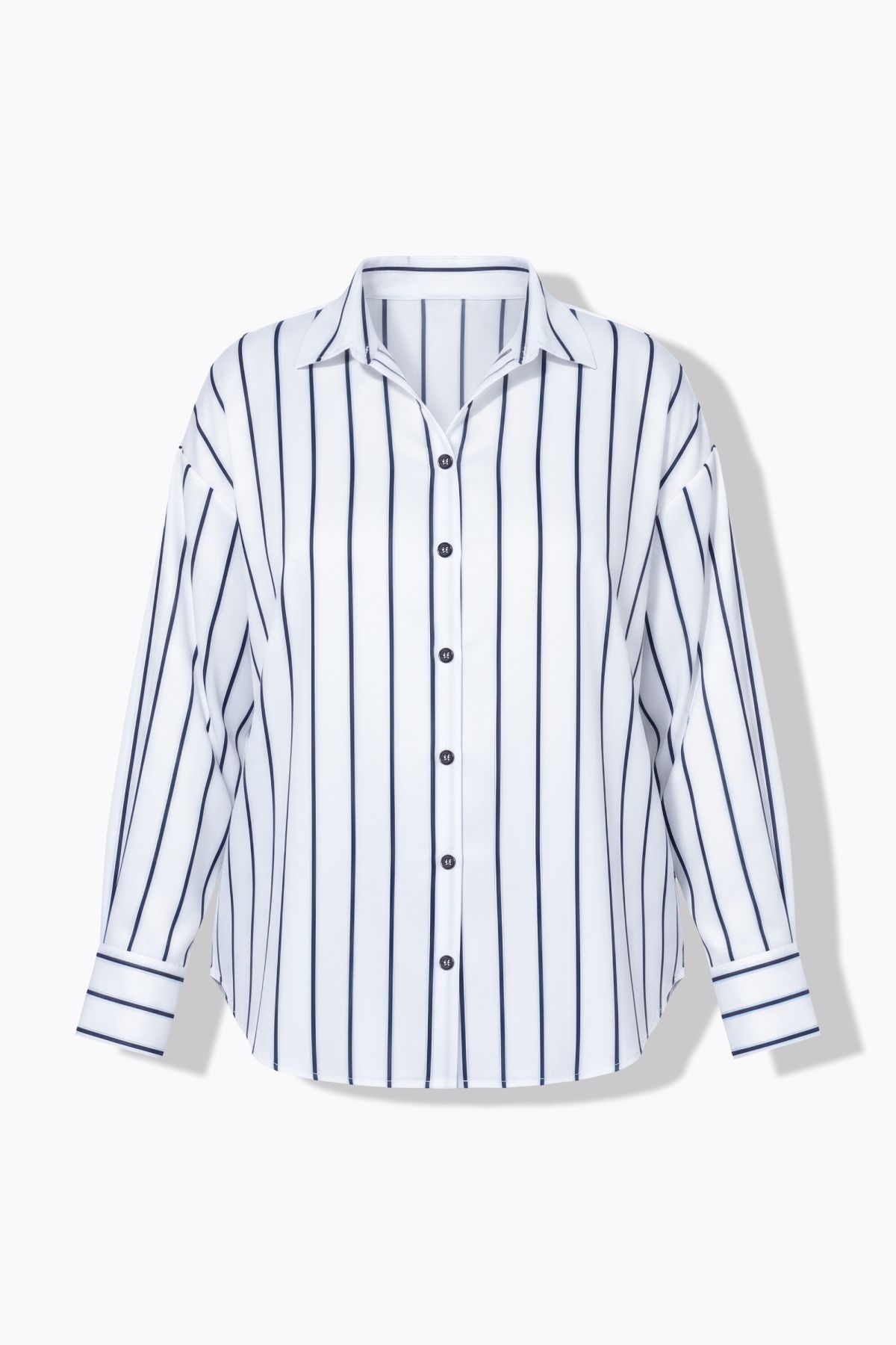 Сатенена риза с раиран принт и овърсайз кройка. С яка, копчета отпред и дълги ръкави с маншет с копче. Стил и комфорт в ежедневието.