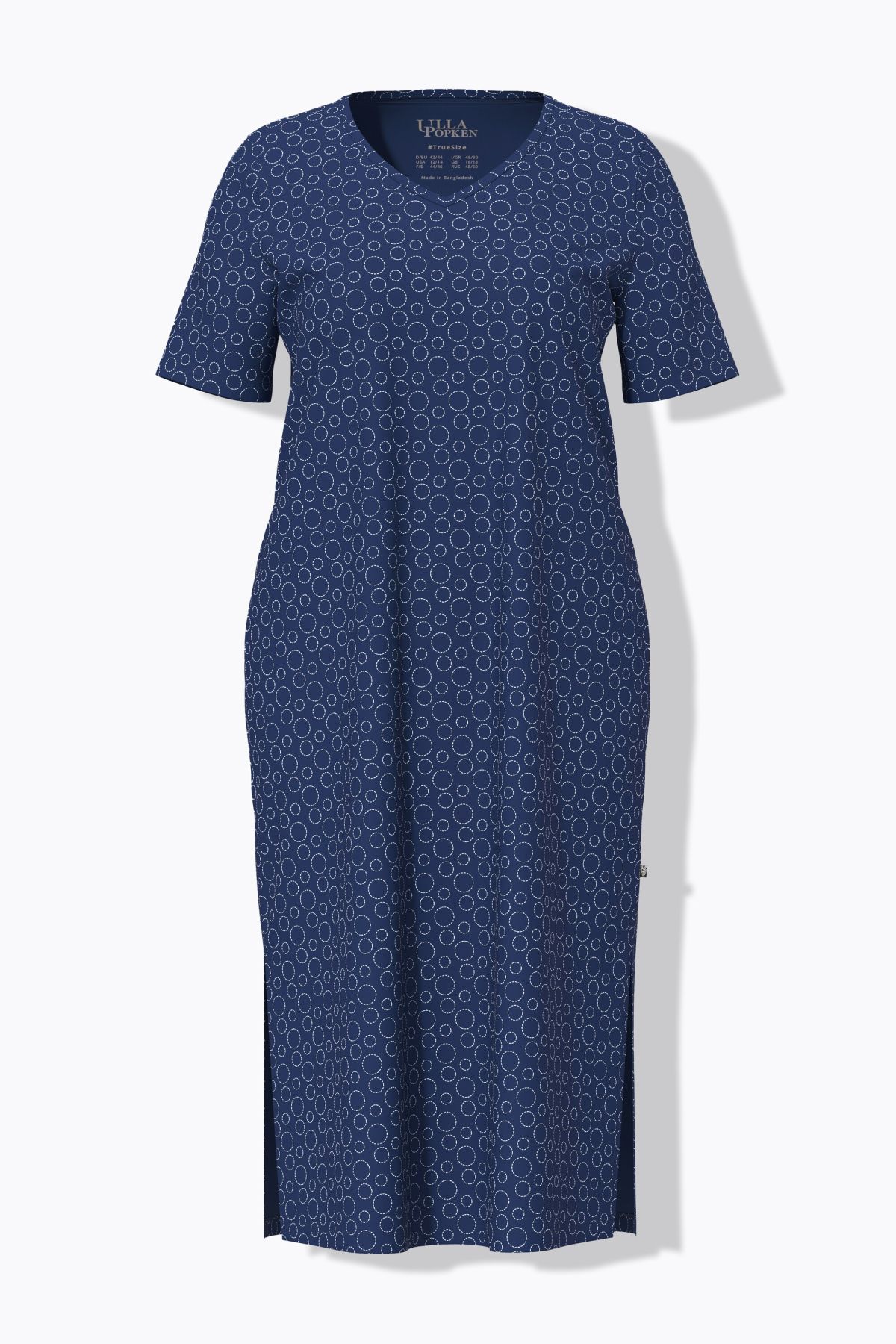 Нощница с принт на кръгове в модерен стил с издължен силует. С V - образно деколте, къси ръкави и странични цепки.
