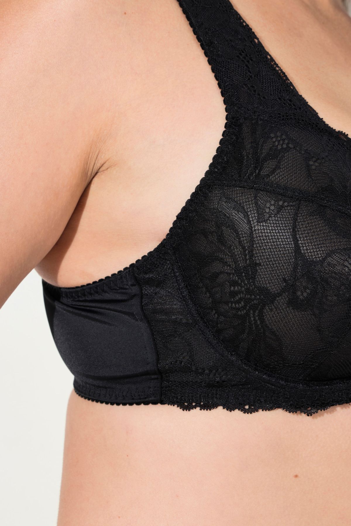 Сутиен с дантела с банели, без оформени чашки. С класически силует, широки, комфортни презрамки и задно закопчаване с метални кукички.