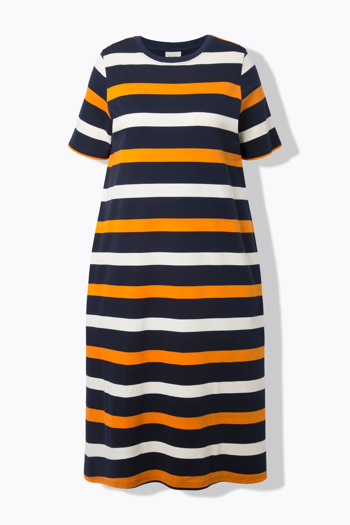 Рокля с принт на цветни райета. С разкроен силует, перфектен за релакс. С кръгло деколте по врата и къси ръкави. От мека, памучна материя.
