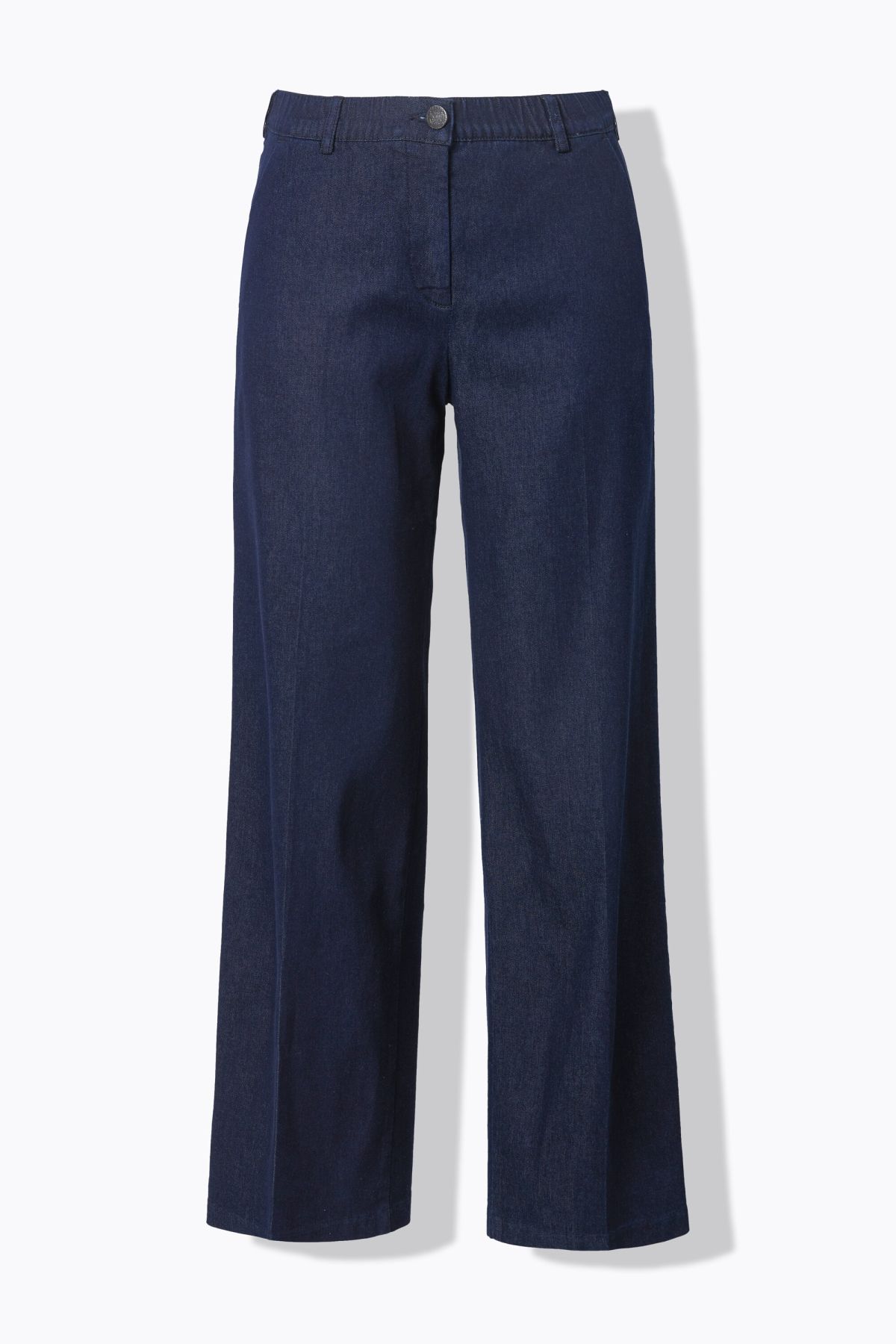 Дънки тип Mary с широки крачоли с елегантна визия. Дизайн с 2 странични джоба, фиксирана талия с гайки за колан, копче и цип отпред. С ръб отпред.
