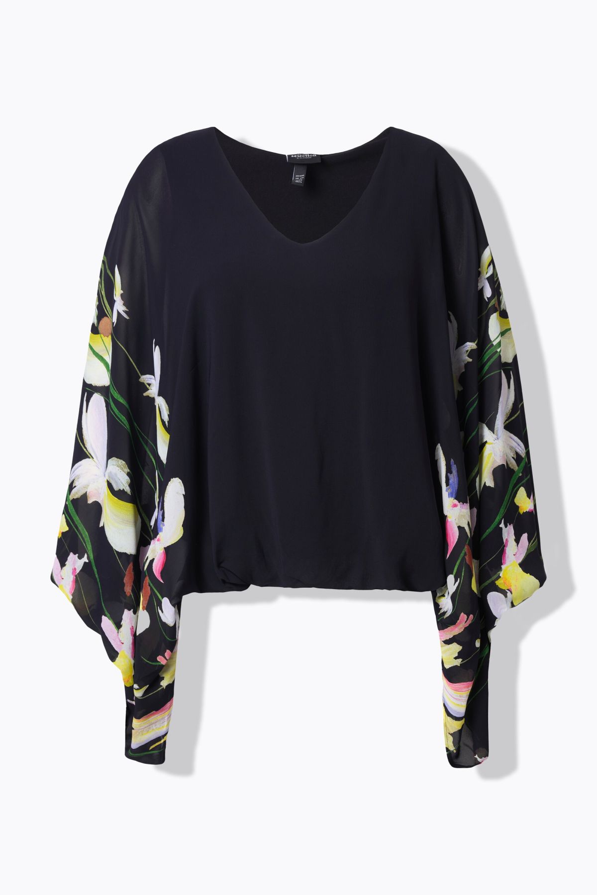 Блуза с шифон и принт на ириси. С лек дизайн, перфектна за пролетта. Със заоблено V - образно деколте.