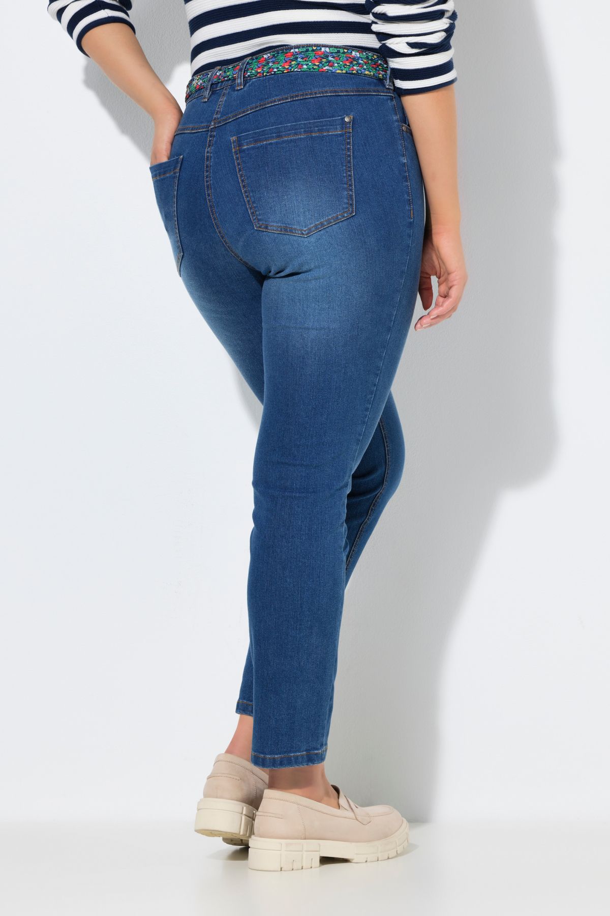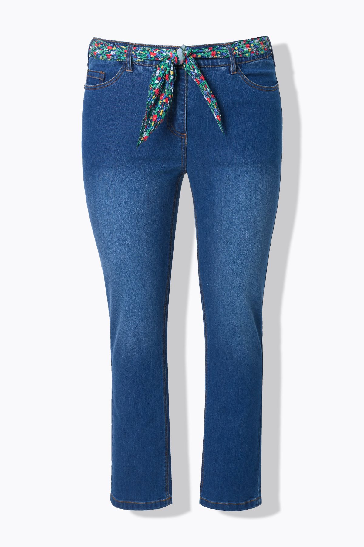 Дънки с цветен колан. С пран ефект и тесен силует с по - къса кройка. С фиксирана талия с гайки за колан, копче и цип отпред и 5 джоба. От мека, памучна материя