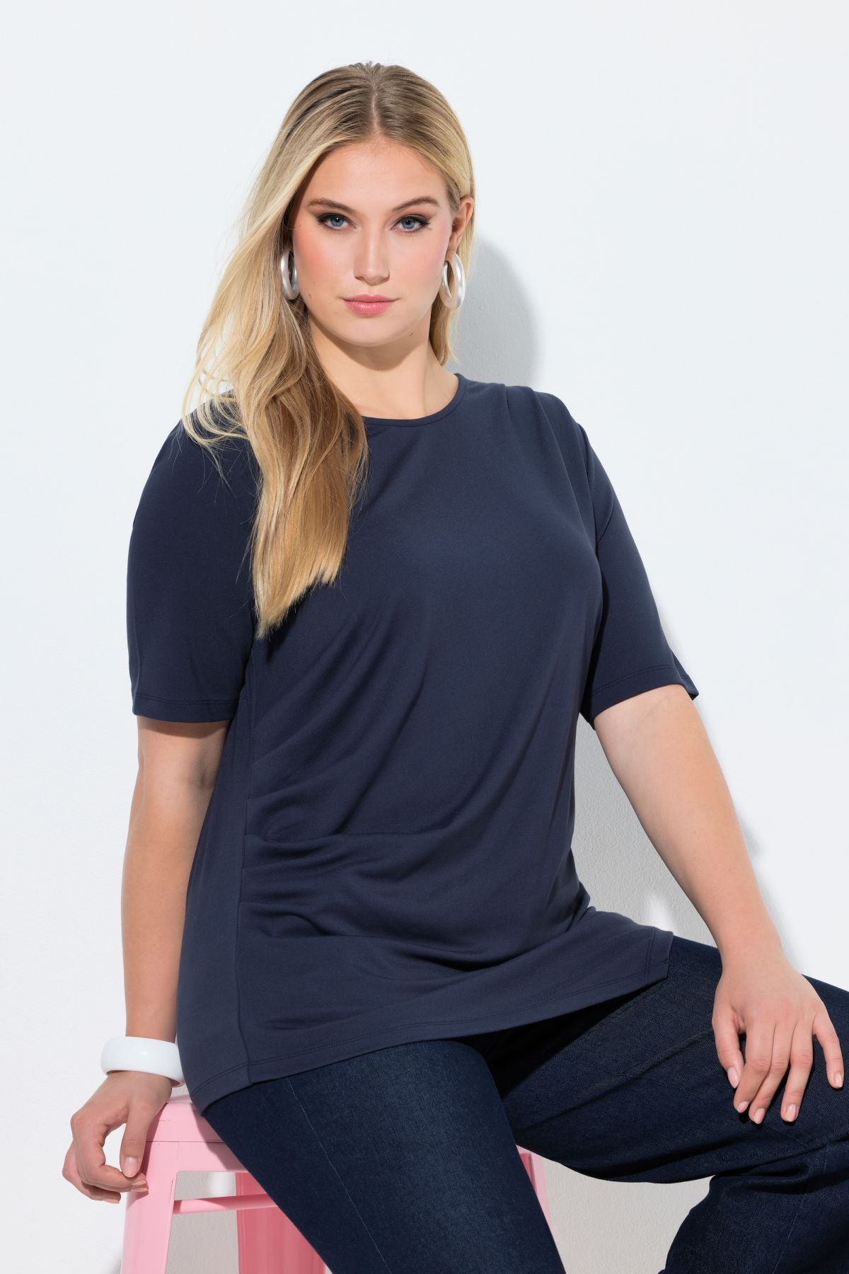 Тениска с асиметричен подгъв с драпирани акценти отстрани. С кръгло деколте и асиметричен подгъв. Стил и красота.
