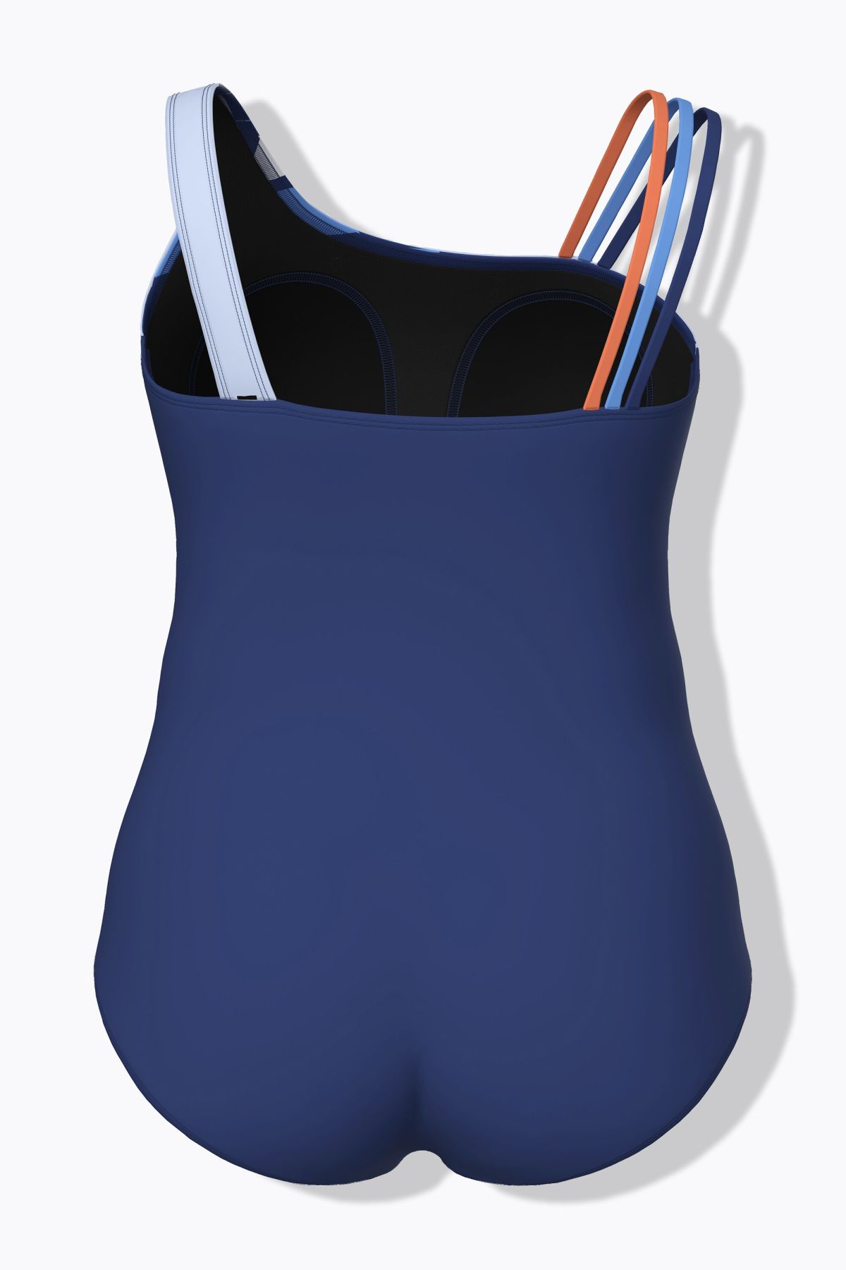 Бански с принт на лодки. Едната презрамка е с 3 ленти, а другата е широка. С оформени чашки, еластична лента под бюста за поддържане и подплата.