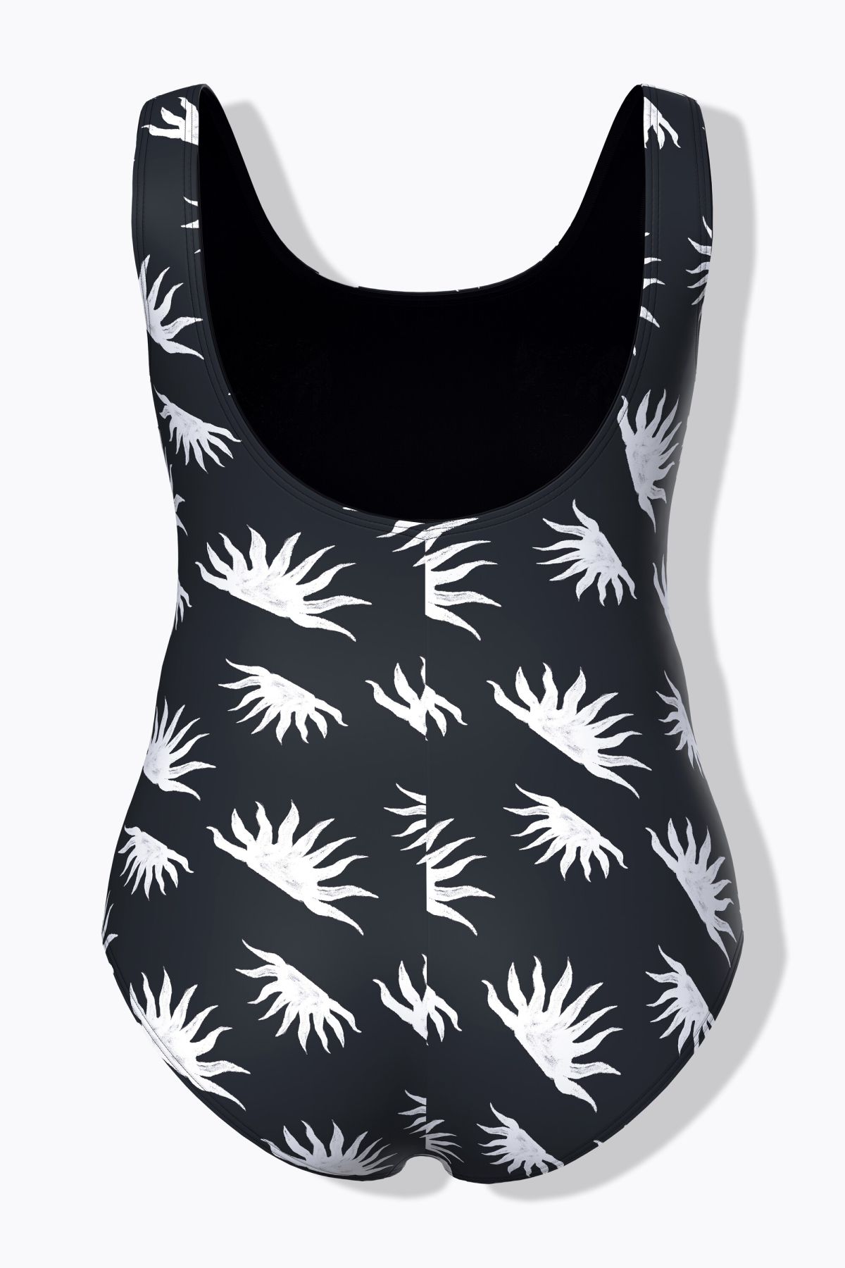 Бански с принт на слънце в спортен силует без оформени чашки. Дълбоко изрязан гръб. Мека подплата, поддържаща лента под бюста. С широки презрамки