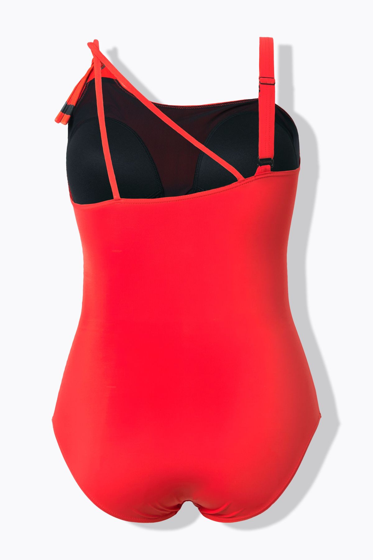 Бански с модерни асиметрични презрамки - едната от които може да се сваля. С оформени чашки, еластична лента под бюста за поддържане и подплата отпред. От лека, бързосъхнеща материя. Стилен и комфортен.