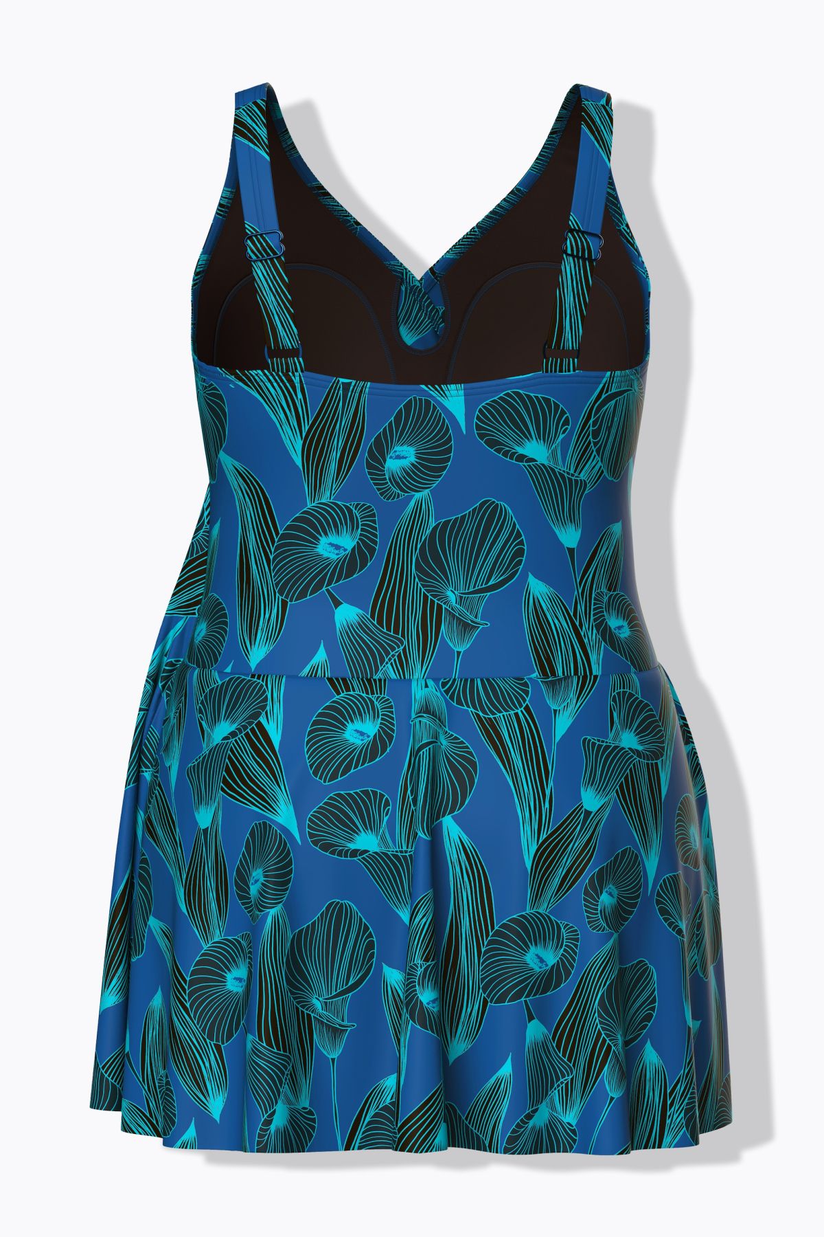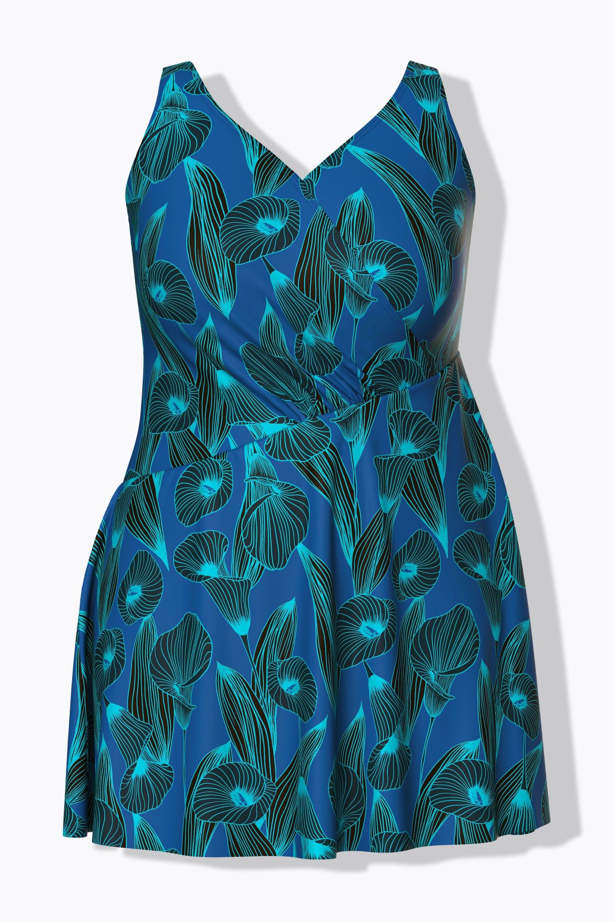 Бански тип рокля с принт на лилии и комфортна А - линия на силуета. С оформени чашки, еластична лента под бюста, широки комфортни презрамки и подплата.