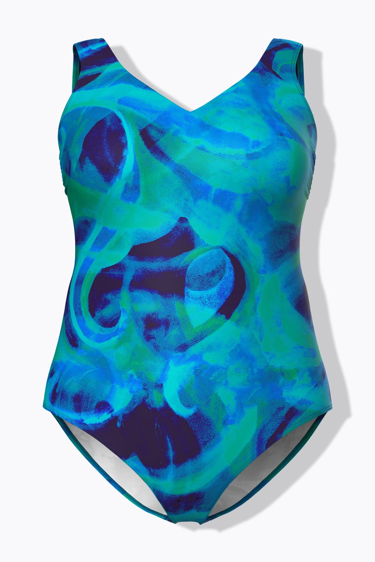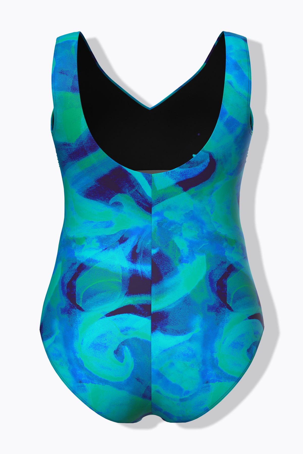 Бански с принт на вълни в спортен силует. Дизайн без банели и оформени чашки, с еластична лента под бюста за поддържане, подплата отпред, широки, комфортни презрамки и V - образно деколте. От бързосъхнеща материя.