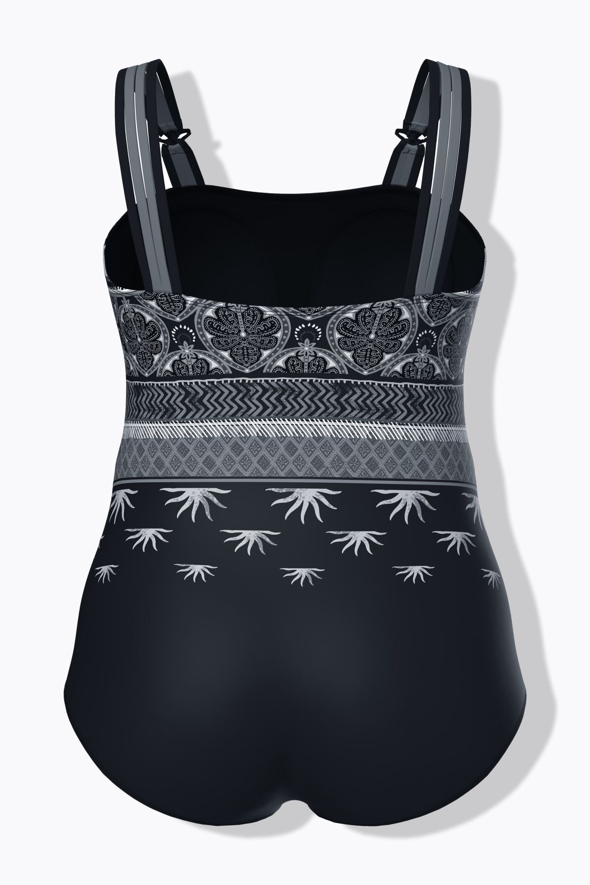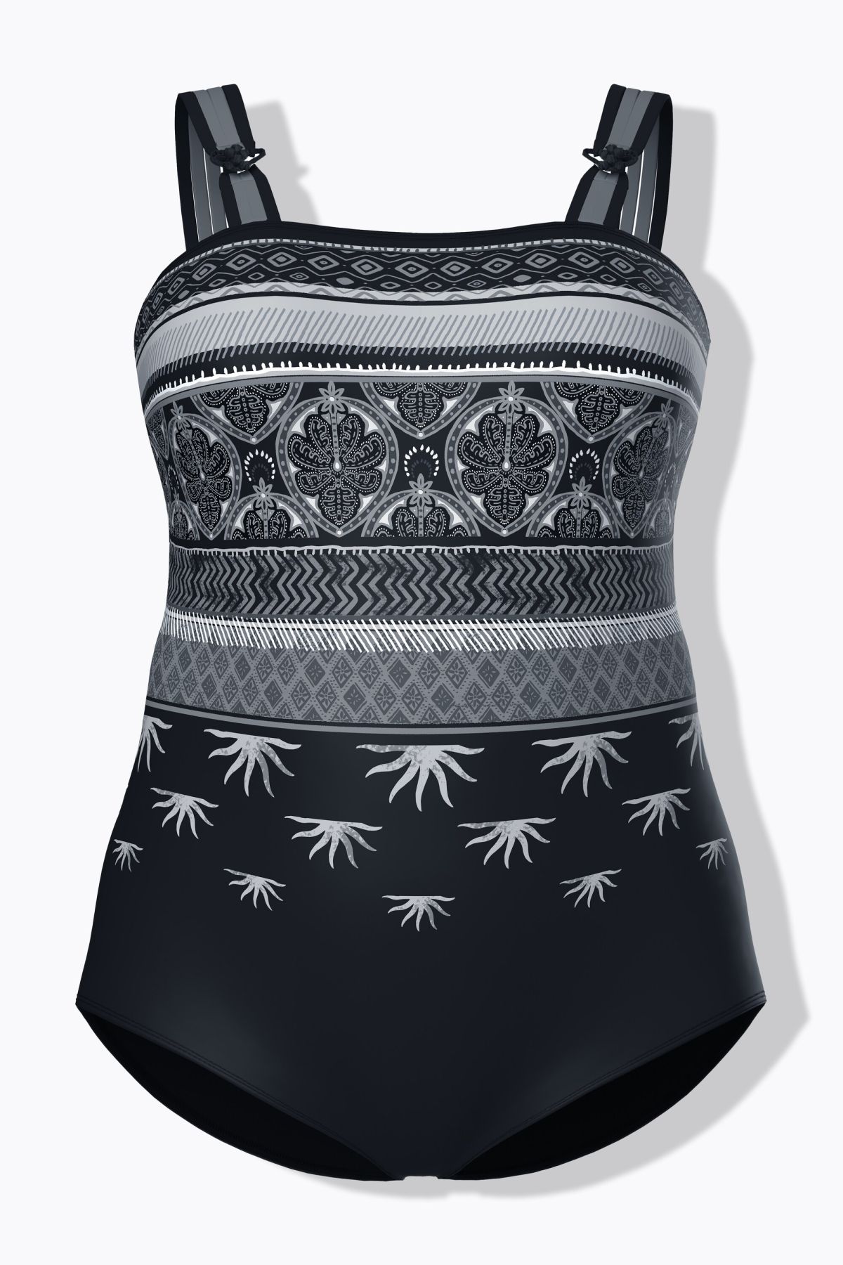Бански с микс от слънца. С лентови презрамки с кръгов детайл. С оформени чашки, еластична лента под бюста за поддържане, подплата отпред. От мека, бързосъхнеща материя.